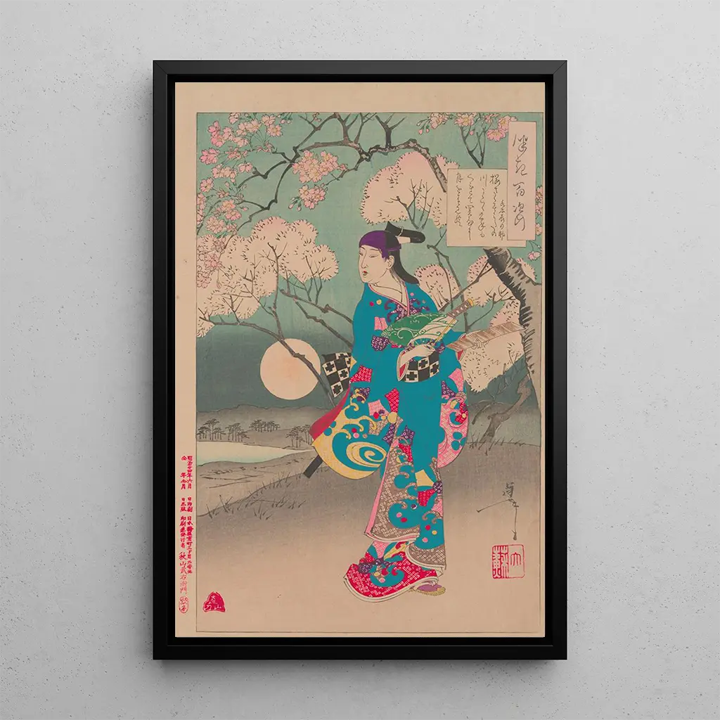 De kunstdruk van Lune sur la rivière Sumida brengt ons naar een nachtelijke scène waar het maanlicht danst op het rustige water van de rivier. Tsukioka Yoshitoshi, met zijn beheersing van ukiyo-e, slaagt erin de magie van dit vluchtige moment vast te leggen. De zilveren en blauwtinten creëren een serene sfeer, terwijl de details van de boten en de omliggende landschappen diepte aan de compositie toevoegen. Dit kunstwerk roept de vergankelijke schoonheid van de natuur op en nodigt de kijker uit om de rust van een Japanse nacht te contempleren.