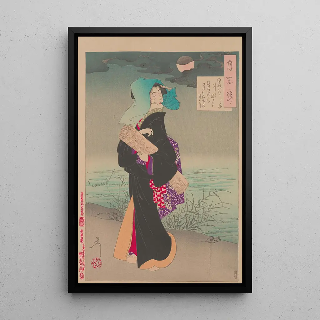 Promeneuse de nuit au clair de lune : een dans onder de sterren In dit boeiende kunstdruk dompelt Tsukioka Yoshitoshi ons onder in een nachtelijke sfeer vol mysterie. De compositie benadrukt een elegante vrouw, gekleed in een delicate kimono, die gracieus beweegt onder het zilveren licht van de maan. De donkere kleuren van de hemel contrasteren met de heldere tinten van haar kleding, waardoor een verbluffende visuele harmonie ontstaat. De ukiyo-e kunstdruktechniek, kenmerkend voor de Japanse kunst, maakt het mogelijk de vloeiendheid van bewegingen en de fijnheid van de details vast te leggen, waardoor deze kunstdruk van de schilderij Promeneuse de nuit au clair de lune bijzonder betoverend is. Tsukioka Yoshitoshi : een meester van de Japanse kunstdruk Tsukioka Yoshitoshi, geboren in 1839, is een van de laatste grote meesters van de ukiyo-e, een stijl van Japanse kunstdruk die bloeide van de 17e tot de 19e eeuw. Geïnspireerd door de sociale en politieke omwentelingen van zijn tijd, wist hij traditie en moderniteit te combineren in zijn werken. Yoshitoshi werd beïnvloed door persoonlijke tragedies en historische gebeurtenissen, wat zijn kunst verrijkte met een unieke emotionele diepgang. Zijn creatieve periode, tijdens het Meiji-tijdperk, werd gekenmerkt door een fascinatie voor de thema's van vergankelijke schoonheid en de passage van de tijd, wat terug te zien is in deze kunstdruk van het schilderij Sugawara no Michizane, waarin hij melancholie en nostalgie oproept. Een decoratief kunstdruk met vele voordelen Deze kunstdruk van de schilderij Promeneuse de nuit au clair de lune is een ideaal decoratief stuk om een vleugje elegantie aan uw interieur toe te voegen. Of het nu in een woonkamer, kantoor of slaapkamer is, het zal de aandacht trekken en gesprekken stimuleren. De afdrukkwaliteit en de trouw aan de details van het originele werk garanderen een onmiskenbare esthetische aantrekkingskracht. Door voor deze doek te kiezen, kiest u voor een kunstdruk die niet alleen uw ruimte verfraait, maar ook een verhaal vertelt dat rijk is aan emoties en cultuur.