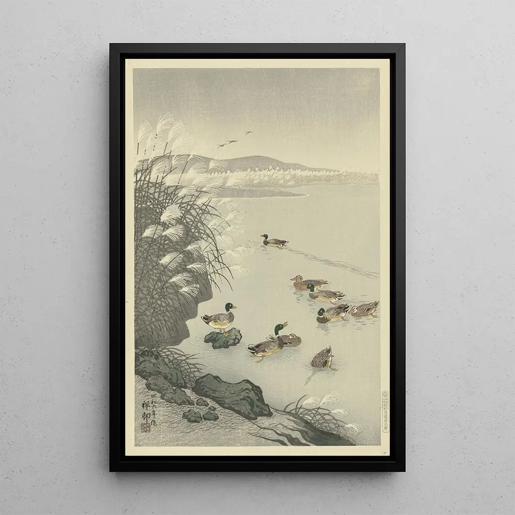Kanaries in het water: een waterige sereniteit De kunstdruk "Kanaries in het water" van Ohara Koson roept een rustige scène op waarin kanaries zachtjes glijden over een spiegelende oppervlakte. De zachte en natuurlijke kleuren, die tinten van blauw en groen mengen, creëren een rustgevende sfeer. De techniek van de ukiyo-e kunstdruk op papier, typisch voor ukiyo-e, stelt Koson in staat de vloeiendheid van het water en de gratie van de vogels vast te leggen. Elk detail, van delicate veren tot de reflecties in het water, getuigt van een nauwkeurige observatie van de natuur, en nodigt de kijker uit om zich onder te dompelen in dit moment van rust. Ohara Koson: een meester van ukiyo-e Ohara Koson, actief in het begin van de 20e eeuw, wordt erkend om zijn kunstdrukken die de fauna en flora weergeven. Geïnspireerd door de tradities van ukiyo-e, wist hij deze stijl te moderniseren terwijl hij de essentie behield. Koson was een van de laatste kunstenaars die zich aan deze kunstvorm wijdde, en zijn werk weerspiegelt een diepe bewondering voor de natuur. Zijn werken, vaak doordrenkt met poëzie, vangen vluchtige momenten, waardoor hij een belangrijke figuur is in de geschiedenis van de Japanse kunst. "Kanaries in het water" past perfect in deze lijn, en vertegenwoordigt zowel een verfijnde techniek als een unieke artistieke gevoeligheid. Een decoratief bezit met vele voordelen De kunstdruk "Kanaries in het water" is een ideaal decoratief stuk om een vleugje sereniteit aan uw interieur toe te voegen. Of het nu in een woonkamer, kantoor of slaapkamer is, deze afbeelding zal overtuigen door zijn kwaliteit en trouw aan het originele werk. De esthetische aantrekkingskracht, versterkt door rustgevende kleuren, maakt het een perfecte keuze om een zen-sfeer te creëren. Door deze doek in uw inrichting te integreren, brengt u niet alleen de schoonheid van de natuur in huis, maar ook een stukje van het Japanse artistieke erfgoed, waardoor uw woonruimte wordt verrijkt.