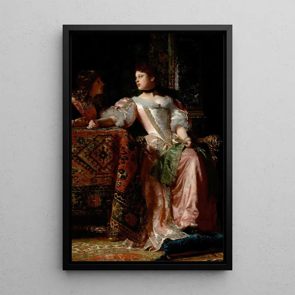 De kunstdruk van La Proposition van Władysław Czachórski dompelt ons onder in een intieme en emotionele sfeer. Dit doek roept een bevroren moment op, waarin een man, met een blik vol passie, zich richt tot een vrouw met een zacht en dromerig gezicht. De warme kleuren, gedomineerd door aardetinten en gouden lichtaccenten, creëren een romantische ambiance. De techniek van Czachórski, die realisme en verfijning combineert, maakt het mogelijk om de details van uitdrukkingen en gebaren vast te leggen, waardoor de scène levendig en ontroerend wordt. Het werk nodigt uit tot contemplatie en het onderzoeken van de gevoelens die de personages bezielen.