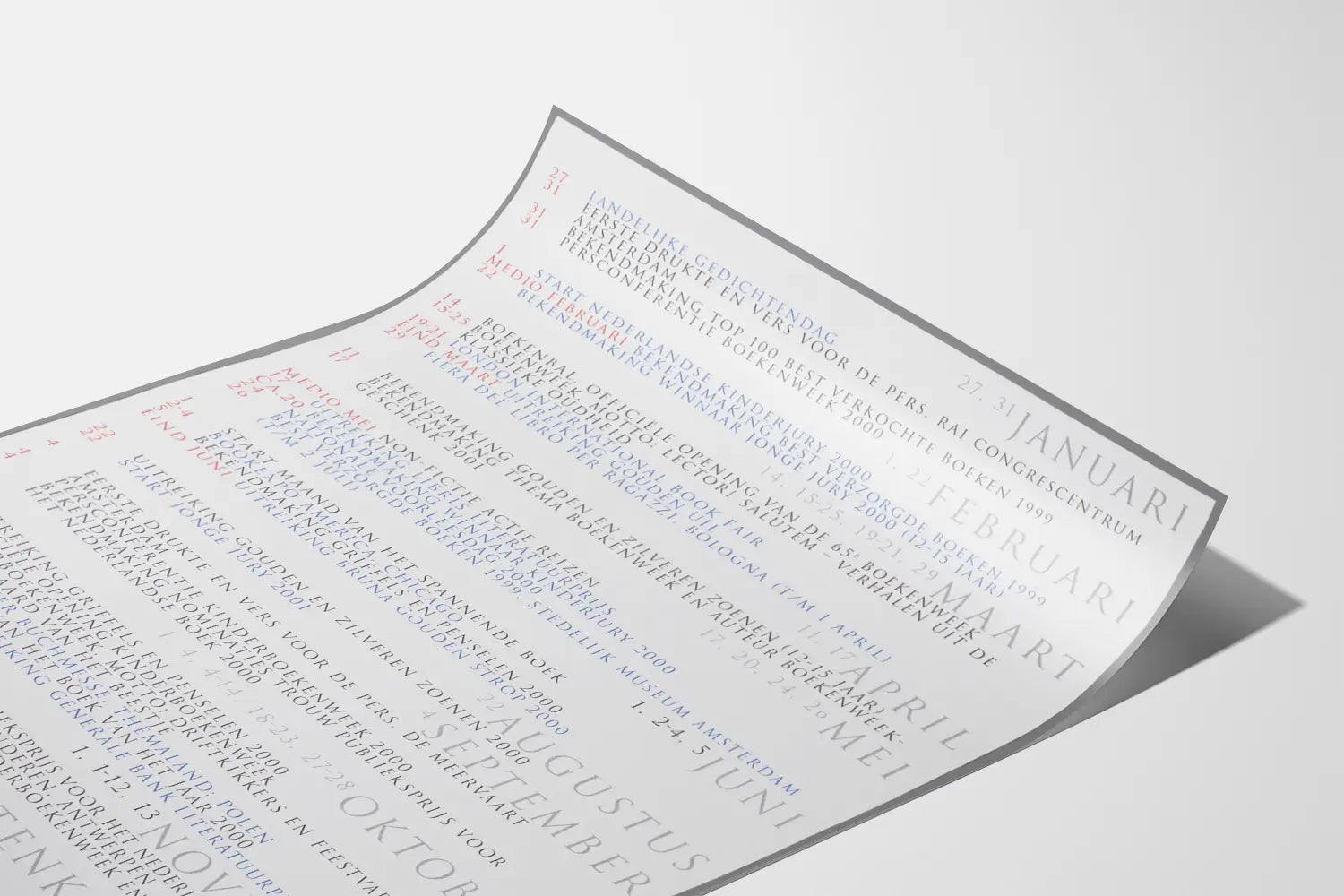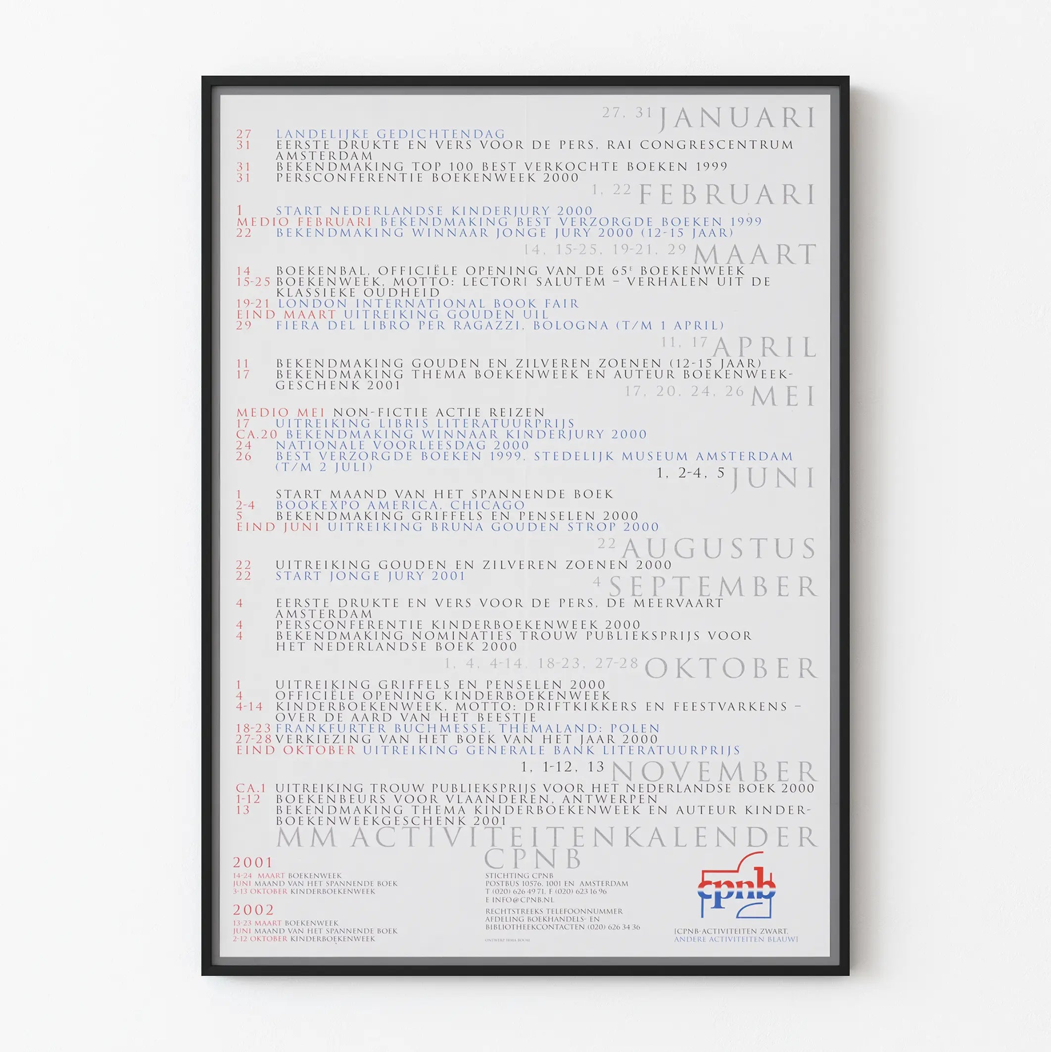 This CPNB 2000-2002 activity calendar poster is an original and elegant wall decoration designed for enthusiasts of literature and graphic design. It clearly and neatly displays the major dates of literary events from 2000 to 2002, such as book weeks, award ceremonies, or major exhibitions, printed with a refined typographic style on a white background. The poster employs a subtle color code, alternating red, blue, and gray, to distinguish different types of activities and months, making it both informative and visually pleasing. Ideal for display in an office, a library, or a reading room, this wall decoration combines functionality and aesthetics, offering a historical overview of Dutch literary events during this period. The minimalist design and structured layout ensure seamless integration into various contemporary or classic interior styles. This poster is also an excellent choice for culture and organization enthusiasts, highlighting important dates without cluttering the space. With its vertical format and elegant typography, it stands out as a decorative poster that is both practical and artistic. Choosing this CPNB activity calendar poster means enriching your interior with a unique and understated cultural object, perfect for personalizing walls with a scholarly and refined touch.