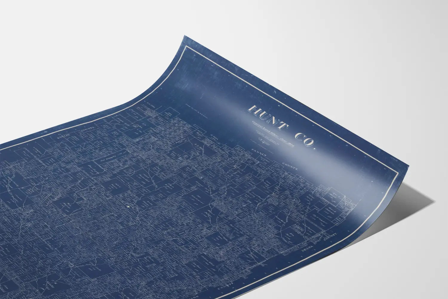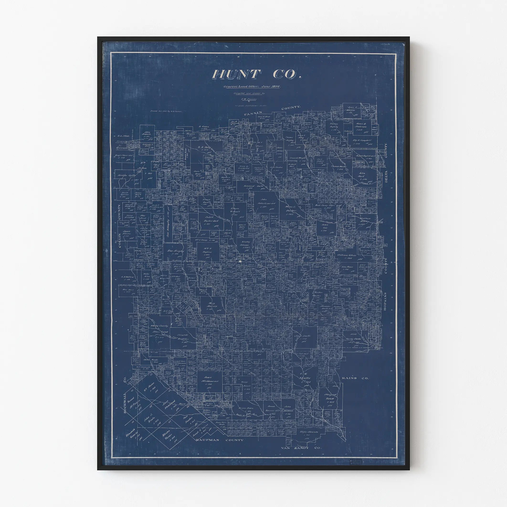 Add a touch of history and authenticity to your wall decoration with this poster depicting an antique map of Hunt County, Texas, dated June 1894. This blueprint-style print (a plan on a blue background with white lines) highlights the detailed parcel division of the region, featuring numerous boxes indicating properties and their owners from that time. Each parcel is precisely outlined and labeled with names, offering a rich and intricate visual aspect that will appeal to vintage map enthusiasts and local history aficionados.