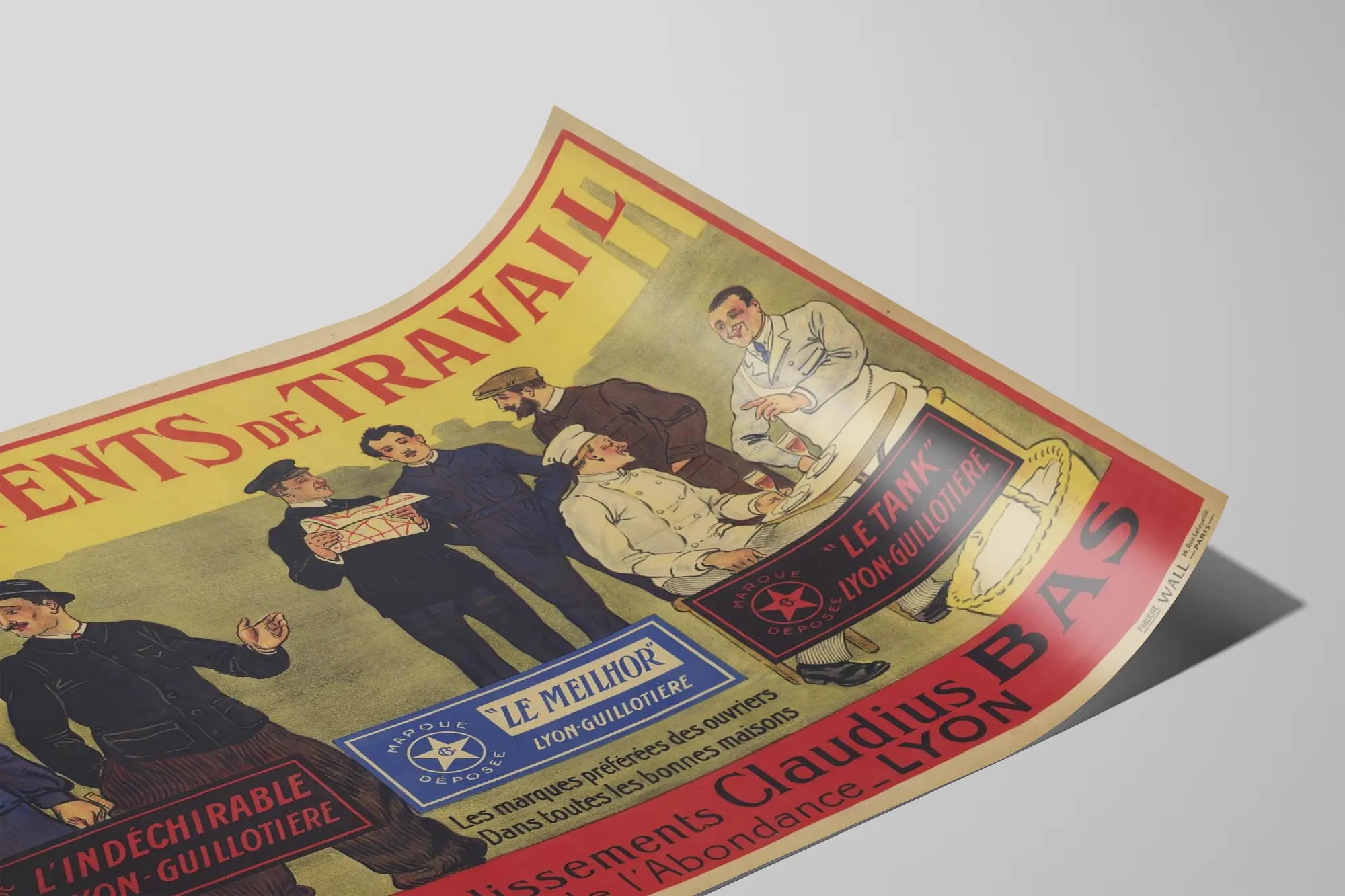This vintage advertising poster features a colorful and dynamic illustration depicting several men dressed in various work uniforms, representative of the brands "L'Indéchirable," "Le Meilleur," and "Le Tank" from Lyon-Guillotière. These distinctive garments, worn by workers and professionals, illustrate a comprehensive range of outfits suitable for different trades. The composition highlights workwear as essential elements of artisans' and laborers' daily lives, through varied silhouettes, from classic attire to more specialized clothing. The yellow and red background provides a striking contrast that draws the eye and enhances each character. This antique poster is not only a collectible piece but also an original wall decoration aimed at enthusiasts of retro advertising posters and industrial history. Perfect for a professional setting or vintage ambiance, it captures the essence of Lyon's industrial labor in an aesthetic and decorative style marked by meticulous illustration. This advertising poster emphasizes the importance of quality workwear brands, with a clear layout and explicit text that highlights the "favorite brands of workers" distributed at the Claudius Bas Establishments, located at 75 Abondance Street in Lyon. This wall art invites nostalgia and respect for craftsmanship, while offering a decorative object rich in history and authenticity, ideal for enriching an interior space with a unique wall decoration that reflects Lyon's heritage.