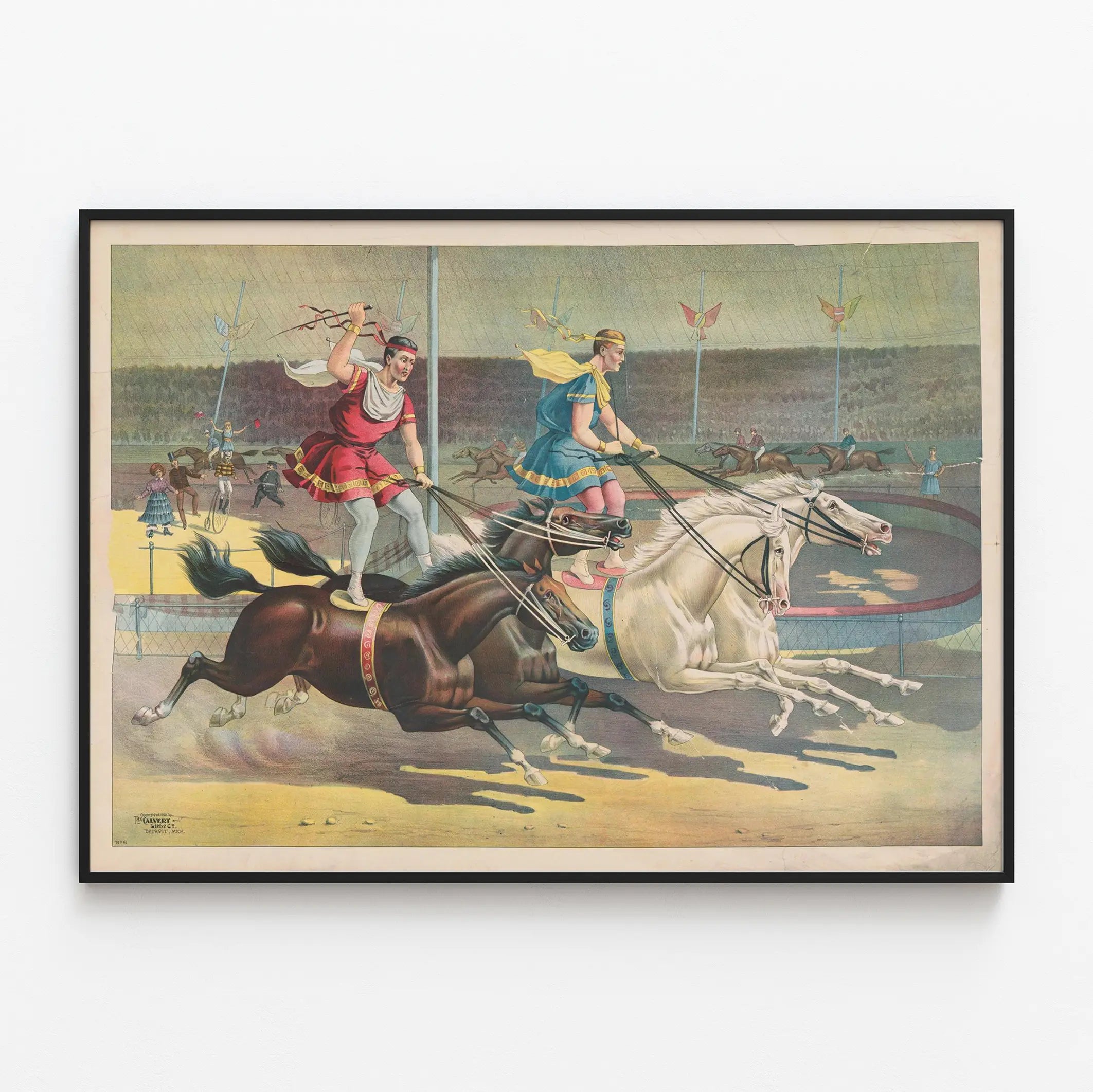 Découvrez cette affiche vintage captivante représentant une scène dynamique de courses hippiques mêlée à des démonstrations acrobatiques équestres. Cette œuvre murale met en avant deux cavaliers debout sur le dos de leurs chevaux, illustrant une prouesse remarquable dans le monde équestre. L'un des cavaliers porte une tunique rouge avec des détails dorés, alors que l'autre est habillé en bleu avec des bordures dorées, apportant un équilibre visuel marqué par le contraste des couleurs vives. Les chevaux, détaillés de manière réaliste, sont dans une course effrénée, deux blancs côte à côte et un plus sombre légèrement en retrait, créant un effet de mouvement intense et de puissance. En arrière-plan, le décor d'un hippodrome ou d'une arène se dévoile avec des spectateurs et des artistes sur chevaux, et même un personnage sur un monocycle, suggérant une ambiance festive et spectaculaire typique des cirques et événements équestres de l'époque. Cette affiche décorative offre une combinaison rare entre sport hippique et art du spectacle, idéale pour une décoration murale qui évoque à la fois énergie, maîtrise et tradition. Parfaite pour les amateurs d'équitation, les passionnés d'art rétro ou toute personne cherchant à apporter une touche historique et vivante à un intérieur, ce poster vintage est un élément décoratif unique. Que vous le choisissiez pour embellir un salon, un bureau ou une salle de sport équestre, ce tableau décoratif attire le regard par ses détails soignés et son ambiance animée. Apportez une touche de charme et d'authenticité à vos murs grâce à cette impression artistique qui célèbre l'adresse et la passion des cavaliers en mouvement.