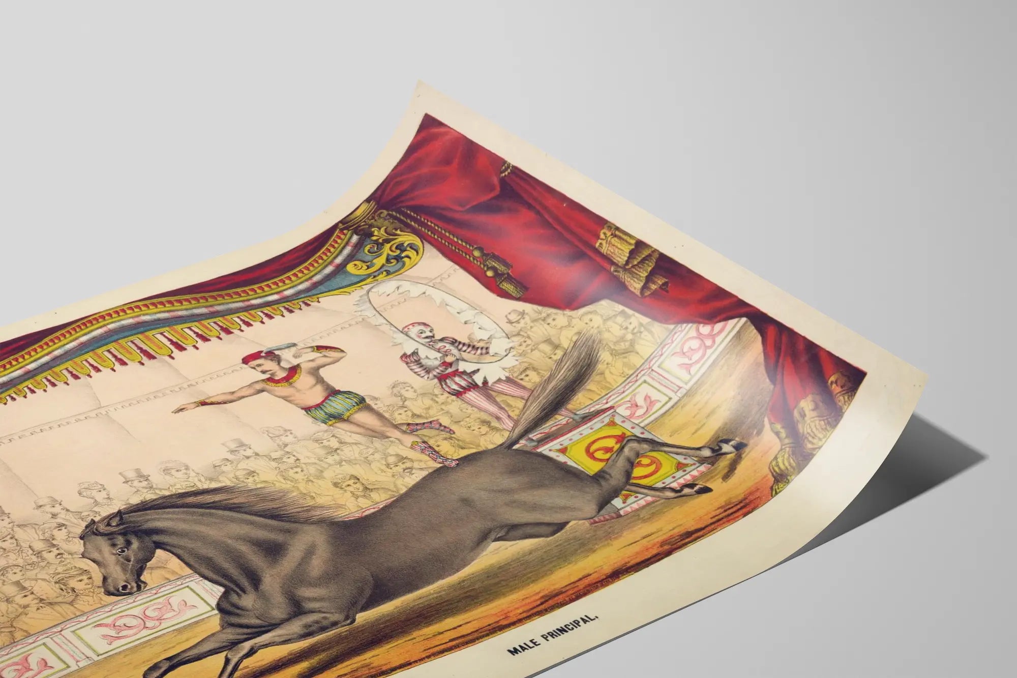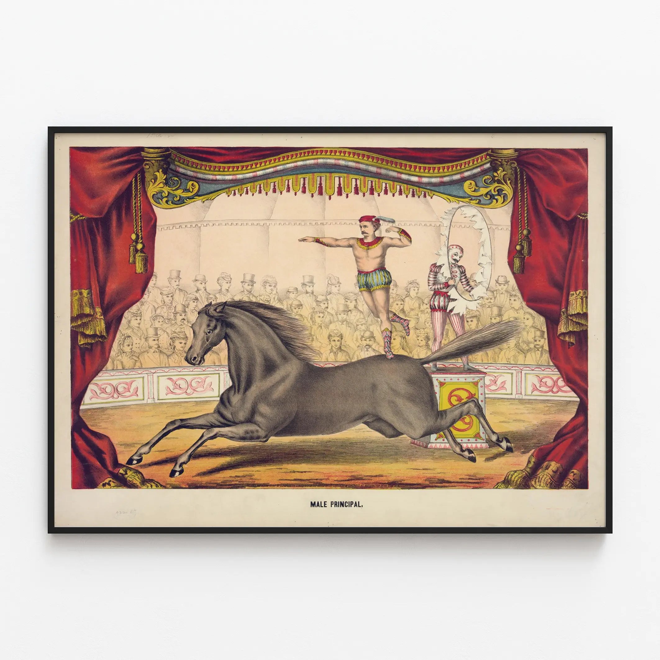 Cette affiche vintage captivante met en scène une performance de cirque où un artiste principal, vêtu d’un costume coloré et caractéristique, exécute une figure d’équilibre exceptionnelle sur le dos d’un cheval au galop. La scène se déroule sous un chapiteau orné de rideaux rouges épais avec des détails dorés et un décor architectural élégant, rappelant les grandes salles traditionnelles de cirque. Le fond révèle un public captivé, dessinant une foule attentive habillée à la mode d'époque, ce qui ajoute une touche authentique et historique à cette œuvre. Le cheval, détaillé avec soin, est représenté en mouvement rapide, renforçant la dynamique et l’énergie de cette décoration murale. Ce poster de cirque ancien, avec son style coloré et ses personnages expressifs, constitue une pièce idéale pour enrichir une décoration murale originale, apportant un charme nostalgique et artistique à tout intérieur. Parfait pour les amateurs d’art vintage et les passionnés de spectacle, ce tableau imprimé peut s’insérer dans un décor classique ou éclectique, soulignant une atmosphère festive et élégante. La composition équilibrée entre l’élément humain, animal et architectural crée un visuel harmonieux et vivant, idéal pour une ambiance chaleureuse et singulière. Ce poster d’époque est un choix de décoration murale qui séduira par son évocation du monde du cirque et son esthétique soignée, parfaite pour ceux qui aiment mêler histoire et art décoratif.