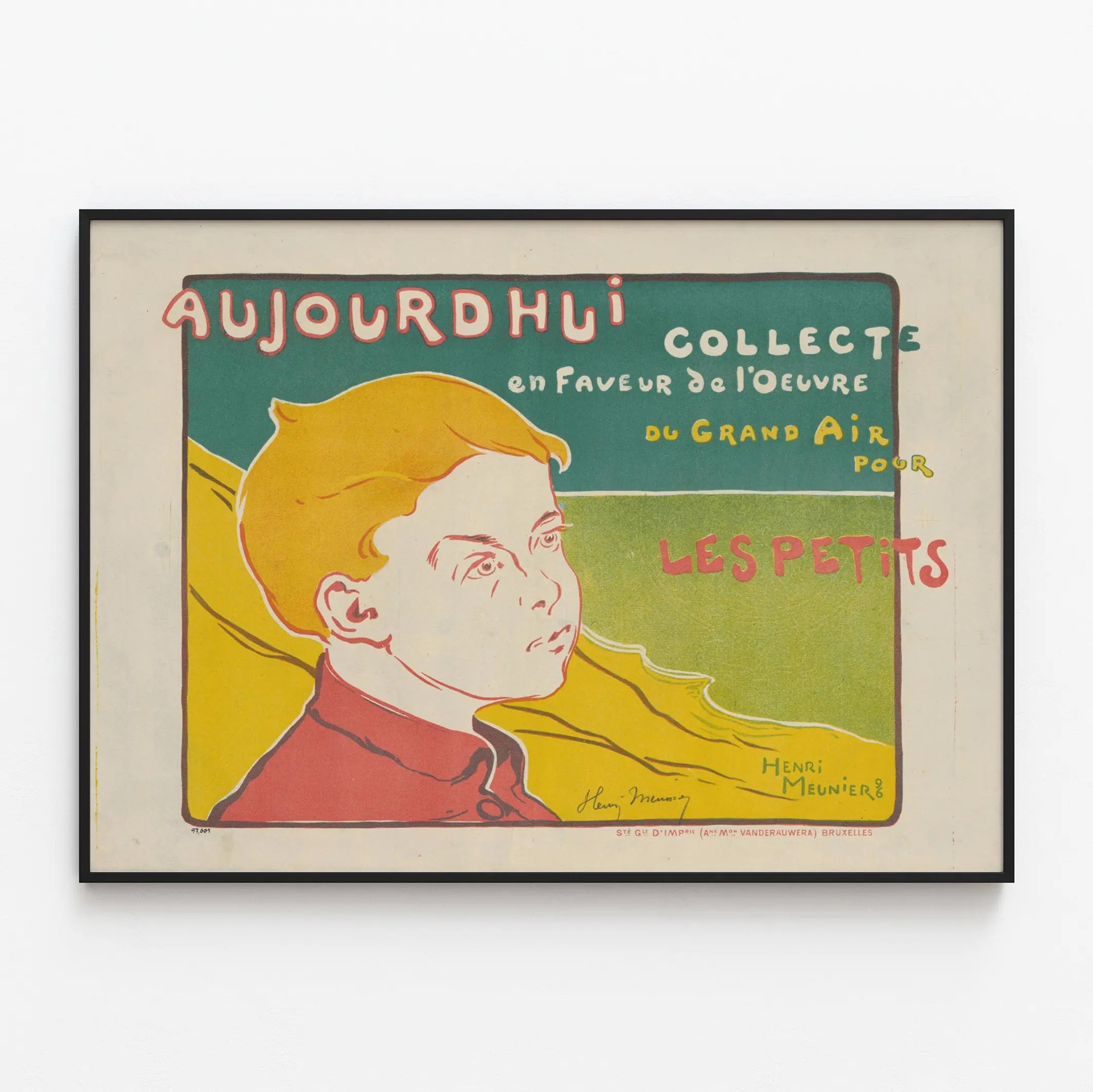 Cette affiche vintage est une pièce unique de décoration murale qui capte l'attention par son illustration simple et son message humanitaire. Présentant le portrait stylisé d'un enfant aux traits doux, avec une chevelure colorée en jaune vif et un vêtement rouge, ce poster met en avant une collecte en faveur des enfants. Le fond de l'image mêle des nuances de vert et de jaune, apportant une touche de fraîcheur et de naturel à cette décoration murale. Avec une typographie variée et ludique, les mots "AUJOURD'HUI COLLECTE en faveur de l'œuvre du grand air pour les petits" s'intègrent parfaitement à la composition, soulignant l'appel à la solidarité sans surcharger l'image. Ce tableau graphique, d'inspiration rétro, est idéal pour ceux qui cherchent à enrichir une pièce avec une affiche à la fois esthétique et porteuse de sens. Cette affiche décorative s'adapte parfaitement à divers styles d'intérieur, qu'il s'agisse d'un bureau, d'un salon ou même d'une chambre d'enfant. Son charme réside dans sa capacité à évoquer la protection des plus jeunes et l'importance de l'engagement social. En affichant ce poster, vous apporterez une dimension engagée et nostalgique à votre décoration murale. Cette œuvre imprimée est parfaite pour les amateurs d'affiches anciennes, de graphisme rétro et d'art mural à message. Que ce soit en format poster ou encadré en tableau, ce visuel attire l'œil tout en proposant un contenu riche en émotions et en valeurs humaines. Une belle manière d'habiller un mur avec une décoration pleine de caractère et de profondeur.