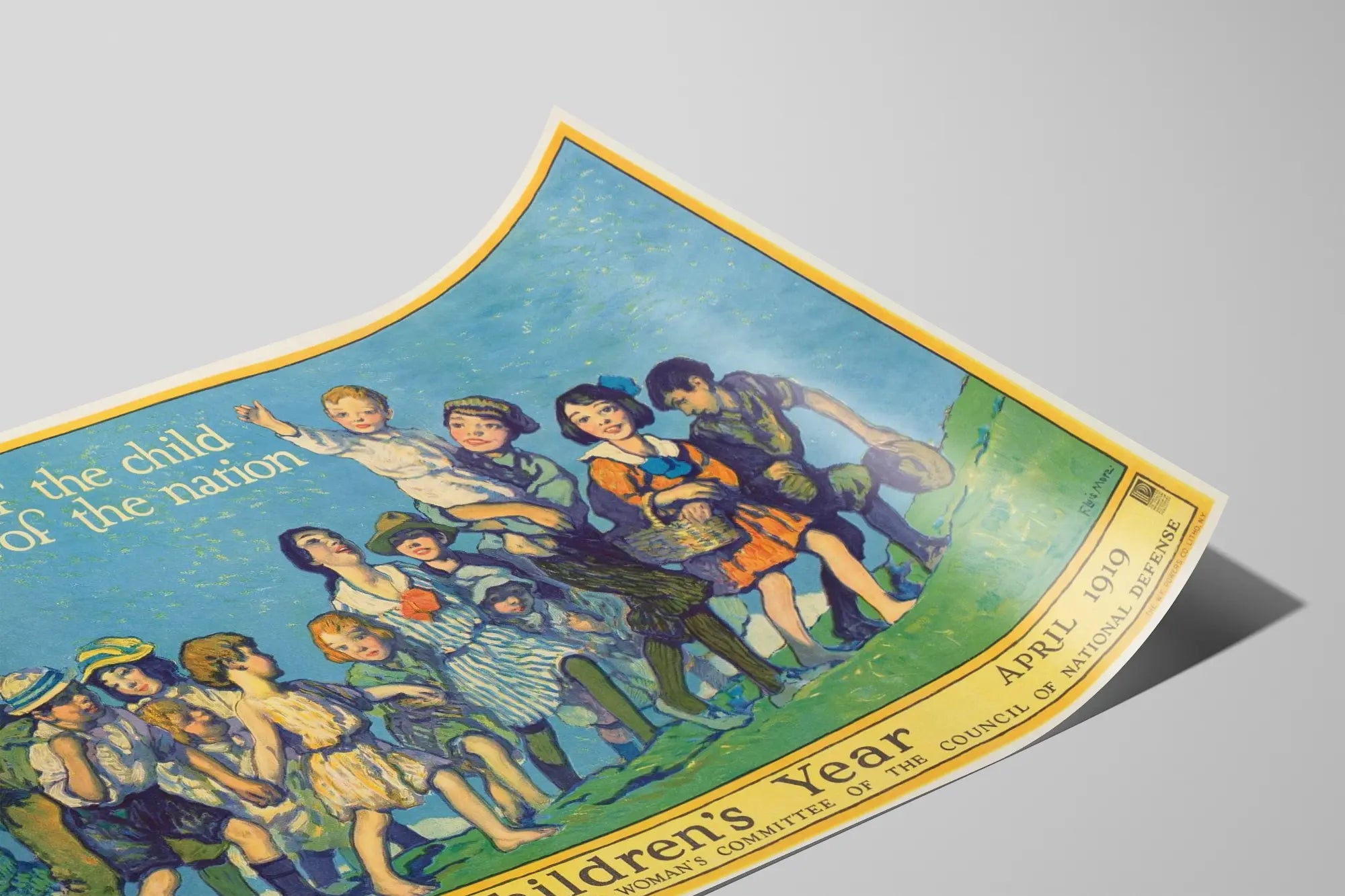 Cette affiche vintage intitulée "Children's Year" est une décoration murale au style rétro qui met en avant l'importance de la santé des enfants comme pilier du futur d'une nation. Datant d'avril 1918-1919, ce poster illustre une scène joyeuse où plusieurs enfants marchent ensemble sur une colline sous un ciel bleu. La phrase "The health of the child is the power of the nation" attire l'attention sur le thème central de la santé infantile et de son rôle fondamental pour le bien-être collectif.