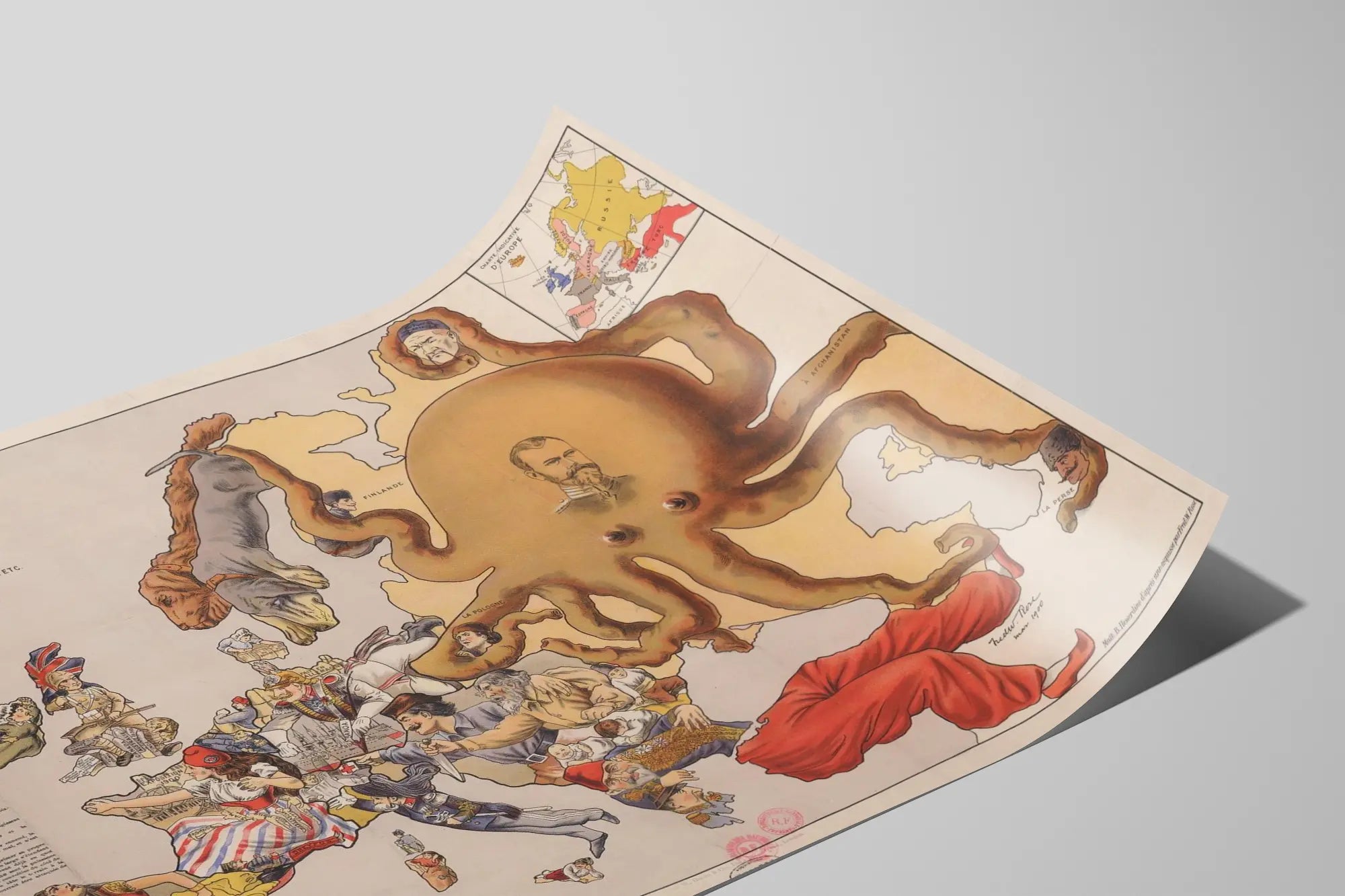 Le poster invite à la découverte des tensions et relations entre les pays européens du début du XXe siècle, représentés sous des formes caricaturales. Par exemple, la Russie occupe une place centrale sous la forme d'une pieuvre géante tenant divers territoires dans ses tentacules, tandis que la Grande-Bretagne est figurée par John Bull, souvent employé comme symbole national. L'ensemble des personnages et illustrations illustre une sorte de théâtre géopolitique, où chaque nation est personnifiée avec ses traits caractéristiques.