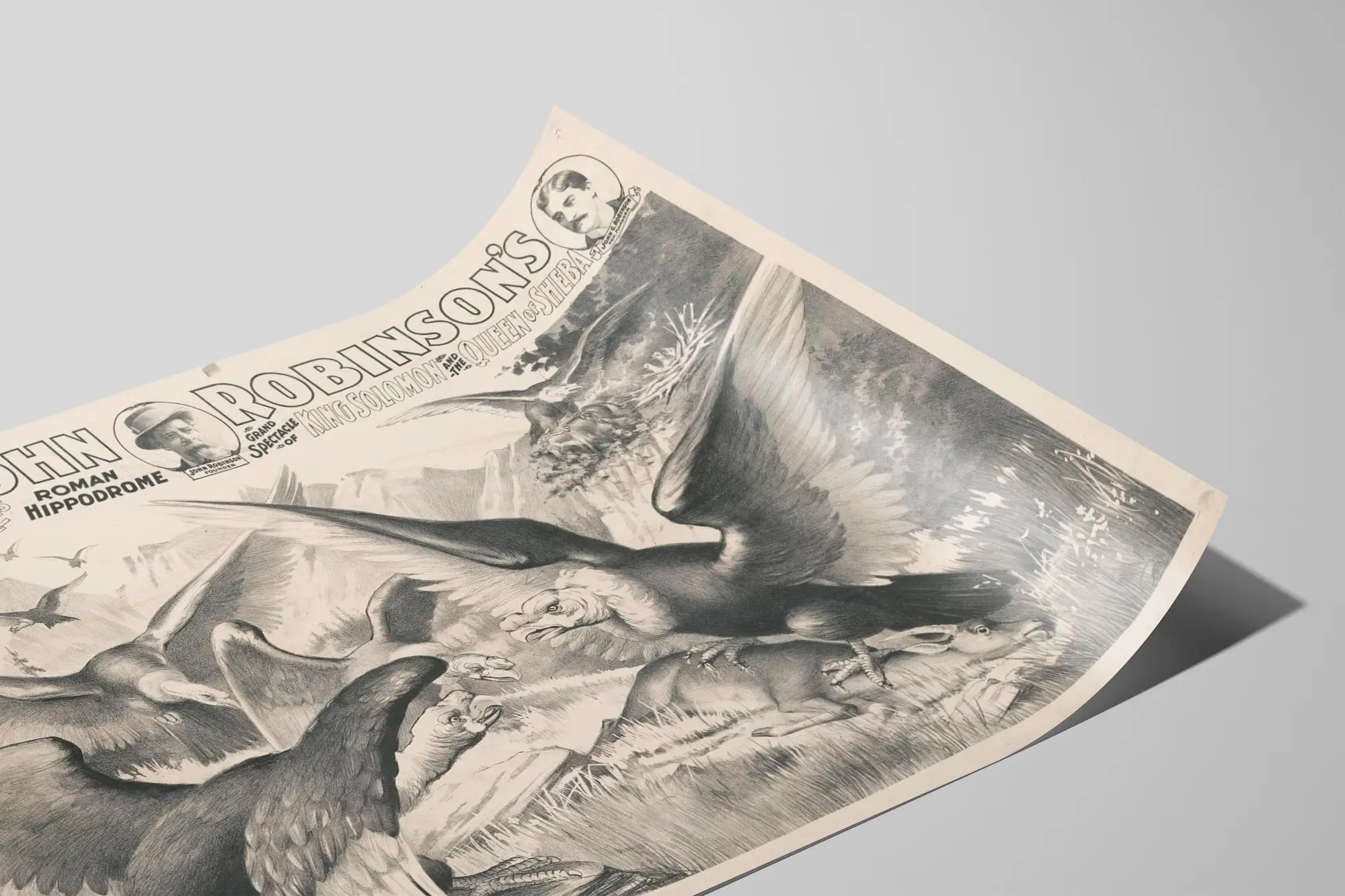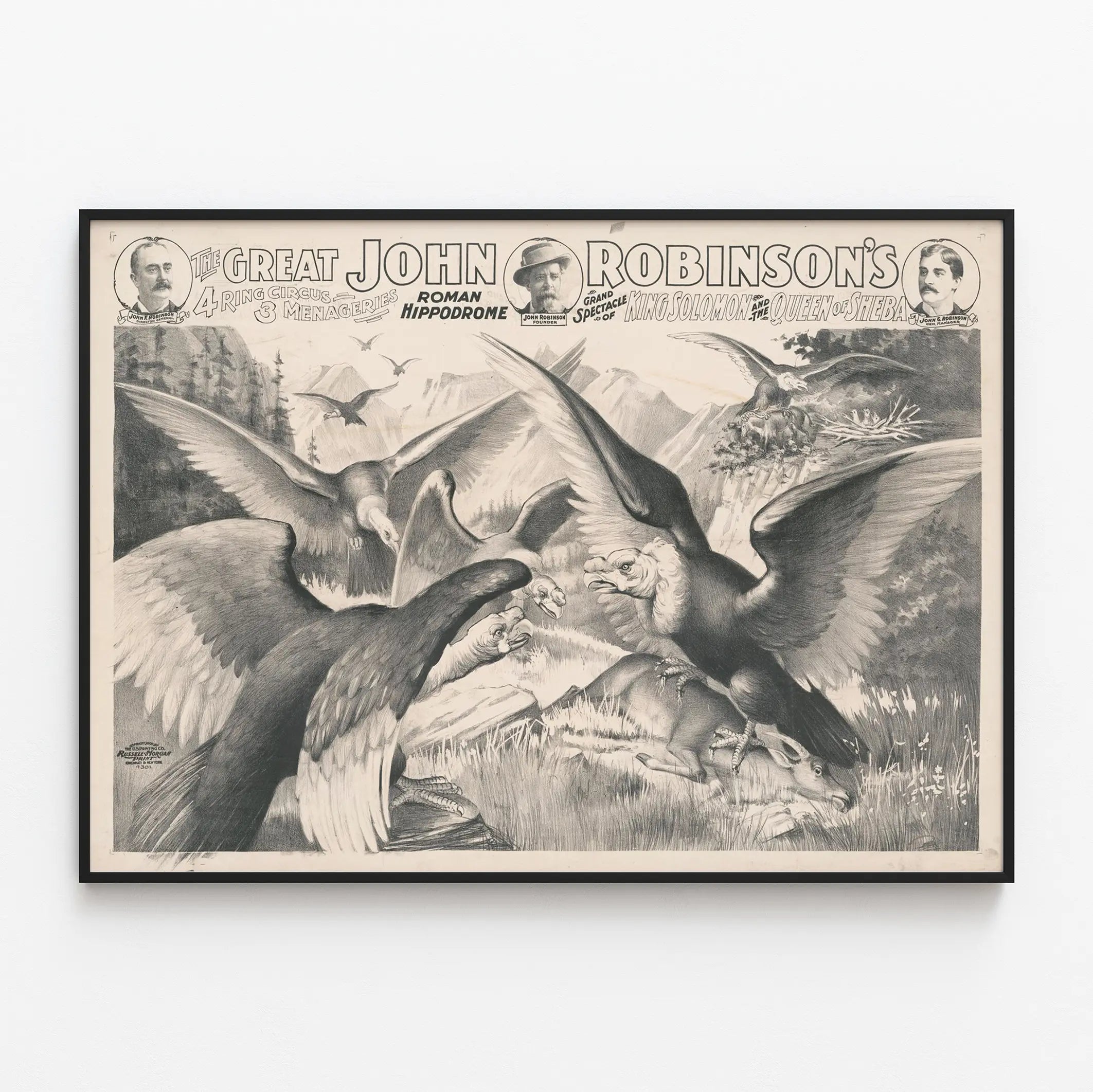 Découvrez cette affiche vintage originale dédiée à "The Great John Robinson's 4 Ring Circus" mettant en avant un grand spectacle spectaculaire intitulé "King Solomon and the Queen of Sheba". Ce poster en noir et blanc présente une scène animalière impressionnante avec de puissants rapaces en plein envol et en chasse, ainsi que des animaux sauvages au sol, sur un décor naturel de montagnes et forêts. L'illustration détaillée capte le dynamisme et la force de la nature, avec une composition riche en textures et nuances de gris qui en fait une décoration murale authentique et captivante. En haut de l'affiche figurent les portraits de trois hommes clés liés au cirque : John F. Robinson, directeur, John Robinson fondateur et John G. Robinson, manager général. Ce poster s'inscrit parfaitement dans une décoration murale sur le thème vintage, animalier ou historique, pouvant apporter une touche unique et rétro à votre intérieur. Il s'agit d'une pièce de collection pour les passionnés de cirque, histoire du spectacle et affiches anciennes, idéale en format tableau ou poster pour habiller une pièce de vie, un bureau ou un espace thématique. La qualité de ce document graphique agrémentera délicatement vos murs tout en racontant une histoire visuelle forte, reflet d'un divertissement d'époque.