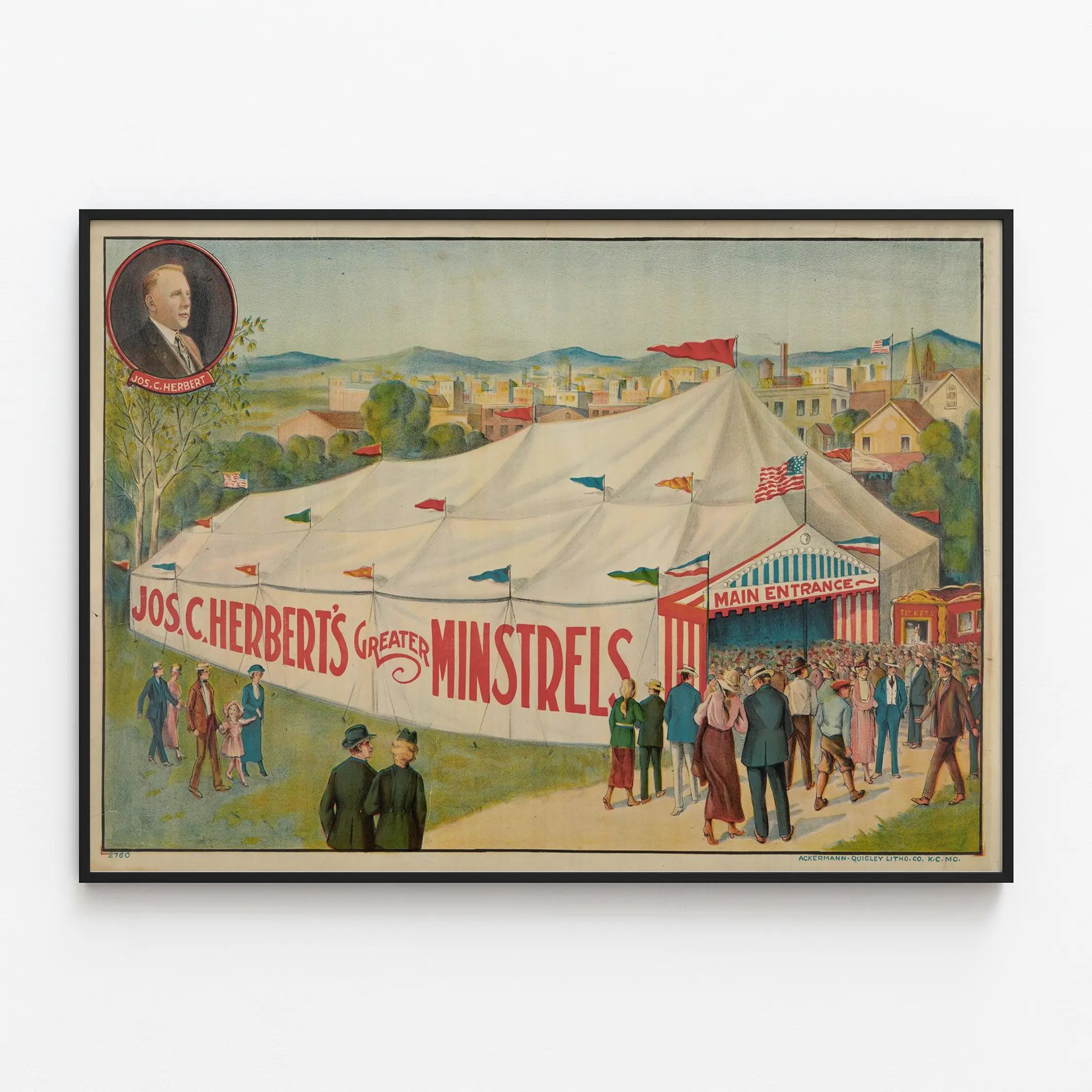 Cette affiche vintage représente une scène animée devant un grand chapiteau de cirque blanc orné de drapeaux colorés et portant en lettres rouges le nom "Jos. C. Herbert's Greater Minstrels". L'illustration montre une foule élégamment habillée de personnages masculins et féminins en vêtements d'époque se dirigeant vers l'entrée principale du chapiteau où se pressent déjà de nombreux visiteurs. Sur la gauche, une foule plus rare est en marche, ajoutant du mouvement et de la vie à cette scène festive. En haut à gauche, un portrait en médaillon rouge présente un homme nommé Jos. C. Herbert, suggérant qu'il est la figure centrale ou le promoteur de ce spectacle. En arrière-plan, on aperçoit une ville paisible, avec des bâtiments, des arbres et des montagnes lointaines, renforçant l'ambiance typique d'un événement itinérant dans un cadre urbain ou semi-urbain. Cette décoration murale sous forme de poster ou d'affiche vintage est idéale pour les passionnés d'art décoratif rétro, les collectionneurs d'affiches anciennes ou ceux qui souhaitent apporter une touche d'élégance et d'histoire à leur intérieur. Son style coloré et détaillé évoque une époque révolue où les spectacles itinérants et les minstrels étaient un divertissement majeur, apportant une ambiance nostalgique et charmante à tout espace mural. Parfait pour une décoration murale dans un salon, une salle de jeux, un bureau ou un espace culturel, ce poster unique invite à la découverte d'événements populaires du passé et à l'appréciation du graphisme vintage. Son format large et son illustration soignée en font également un élément décoratif remarquable. L'achat de cette affiche peut enrichir une collection d'art mural vintage tout en offrant un point focal captivant dans une pièce, où l'histoire et le design se rencontrent. Optez pour une décoration murale originale avec cette affiche Jos. C. Herbert's Greater Minstrels, parfaite pour apporter caractère et authenticité à votre aménagement intérieur.