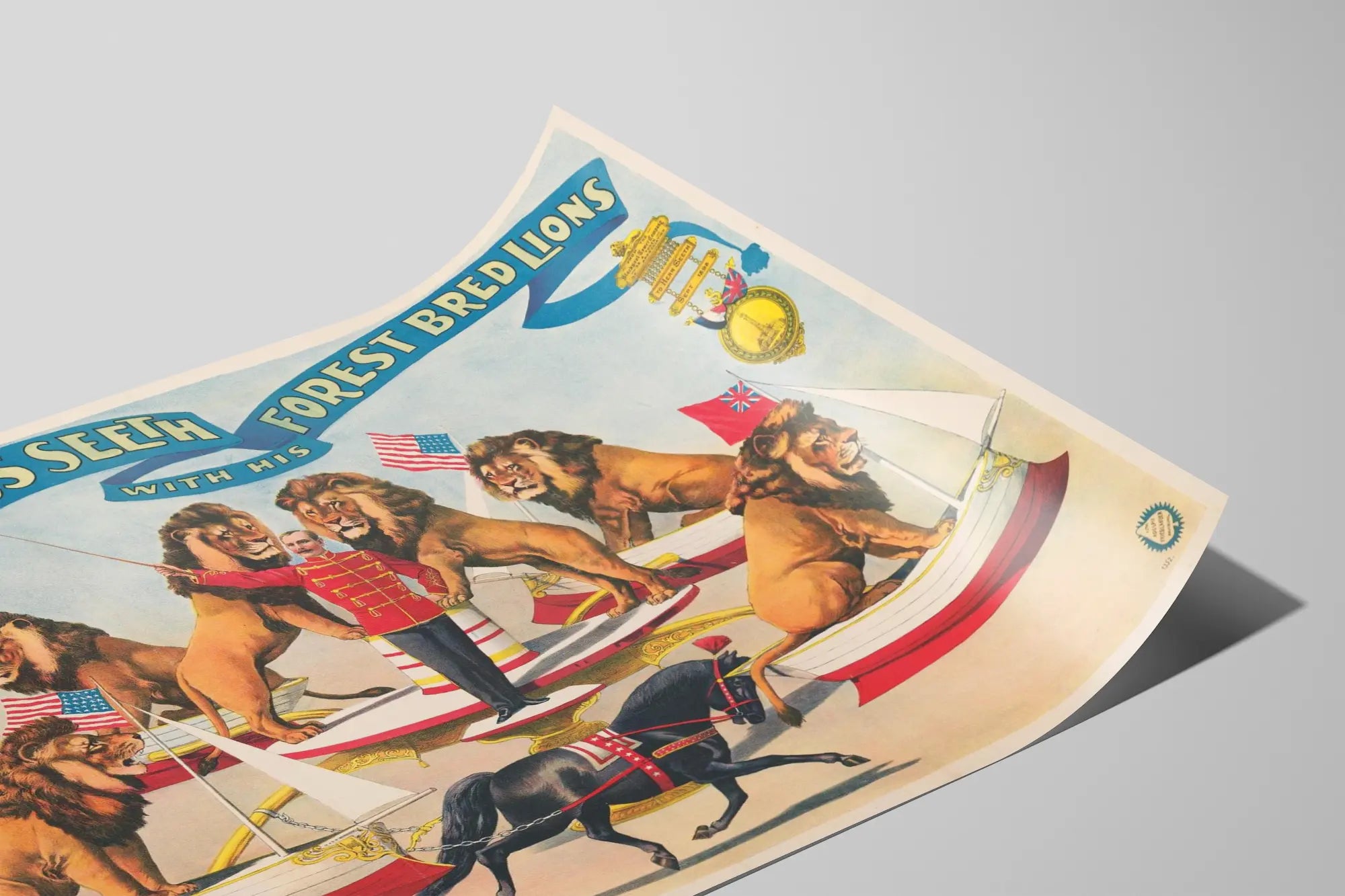 Cette affiche vintage représente Julius Seeth, un dompteur légendaire, entouré de ses lions de forêt dans une scène spectaculaire. Le poster illustre Julius Seeth en uniforme militaire rouge détaillé, tenant un bâton de domptage, au centre d'un plateau tournant porté par des lions majestueux. Chaque lion est assis dans un petit bateau à voile orné de drapeaux américains et britanniques, renforçant l’aspect exotique et prestigieux du numéro. Un cheval noir attelé à ces bateaux ajoute une dimension supplémentaire à la scène, mêlant à la fois puissance animale et technique humaine. Cette décoration murale est idéale pour les amateurs d'art rétro et de spectacles de cirque historiques, apportant une touche nostalgique et originale à votre intérieur. Le style graphique coloré et détaillé met en valeur le savoir-faire de l'époque et crée une ambiance captivante et immersive. Cette affiche se prête parfaitement comme poster décoratif dans un salon, une chambre ou un bureau, où elle peut attirer le regard et susciter la curiosité. Les éléments visuels de cette œuvre, comme les lions réalistes, la figure centrale de Julius Seeth et les accessoires nautiques, font de cette affiche un tableau dynamique et équilibré. L'écriture en arc de cercle place le nom et le thème de la scène de façon claire et impactante, renforçant sa fonction de publicité et d'attraction visuelle. En choisissant cette affiche comme décoration murale, vous valorisez une pièce d'histoire spectaculaire du spectacle vivant, tout en ajoutant une note décorative aux influences vintage et animalières. Ce poster est une invitation à redécouvrir la magie et le danger maîtrisé du cirque classique, au travers d'une composition graphique riche et expressive.