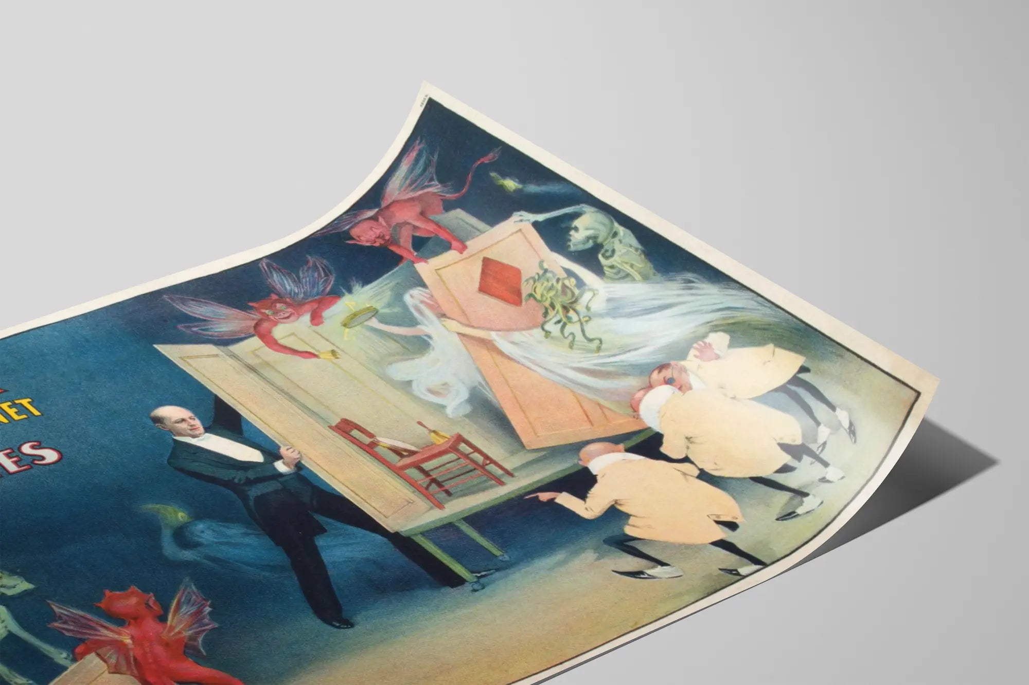 Plongez dans l'univers fascinant de la magie avec cette affiche vintage intitulée « Kellar and his Perplexing Cabinet Mysteries ». Ce poster illustre l'illusionniste Kellar en pleine démonstration de ses tours mystérieux, où un cabinet énigmatique semble dissimuler des phénomènes surnaturels. La scène captivante présente Kellar ouvrant une grande armoire, tandis que des créatures fantastiques, telles que des démons ailés rouges, des fantômes translucides et un squelette porteur d'une planche en bois, émergent avec malice autour du cabinet. Trois personnages en habit blanc, probablement spectateurs ou complices, observent attentivement la scène, amplifiant le suspense du spectacle. Cette décoration murale est idéale pour les passionnés d'illusions, d'art rétro et de scènes intrigantes, conférant une touche mystérieuse et vintage à n'importe quel intérieur. L'affiche se distingue par ses couleurs vives et son style graphique caractéristique de la publicité du XIXe siècle, apportant une esthétique unique et pleine de charme à votre espace de vie ou de travail. Son design narratif invite à imaginer les secrets cachés derrière le rideau de l'illusion, faisant de ce poster un élément de décoration murale captivant qui suscite curiosité et émerveillement. Que ce soit pour un salon, un bureau ou un lieu dédié à la magie et au spectacle, cette œuvre évoque avec authenticité les mystères magiques de Kellar et son cabinet perplexe. Offrez à vos murs ce tableau d'exception qui mêle habilement art graphique ancien et atmosphère fantastique, rehaussant ainsi la singularité et l'originalité de votre décoration.