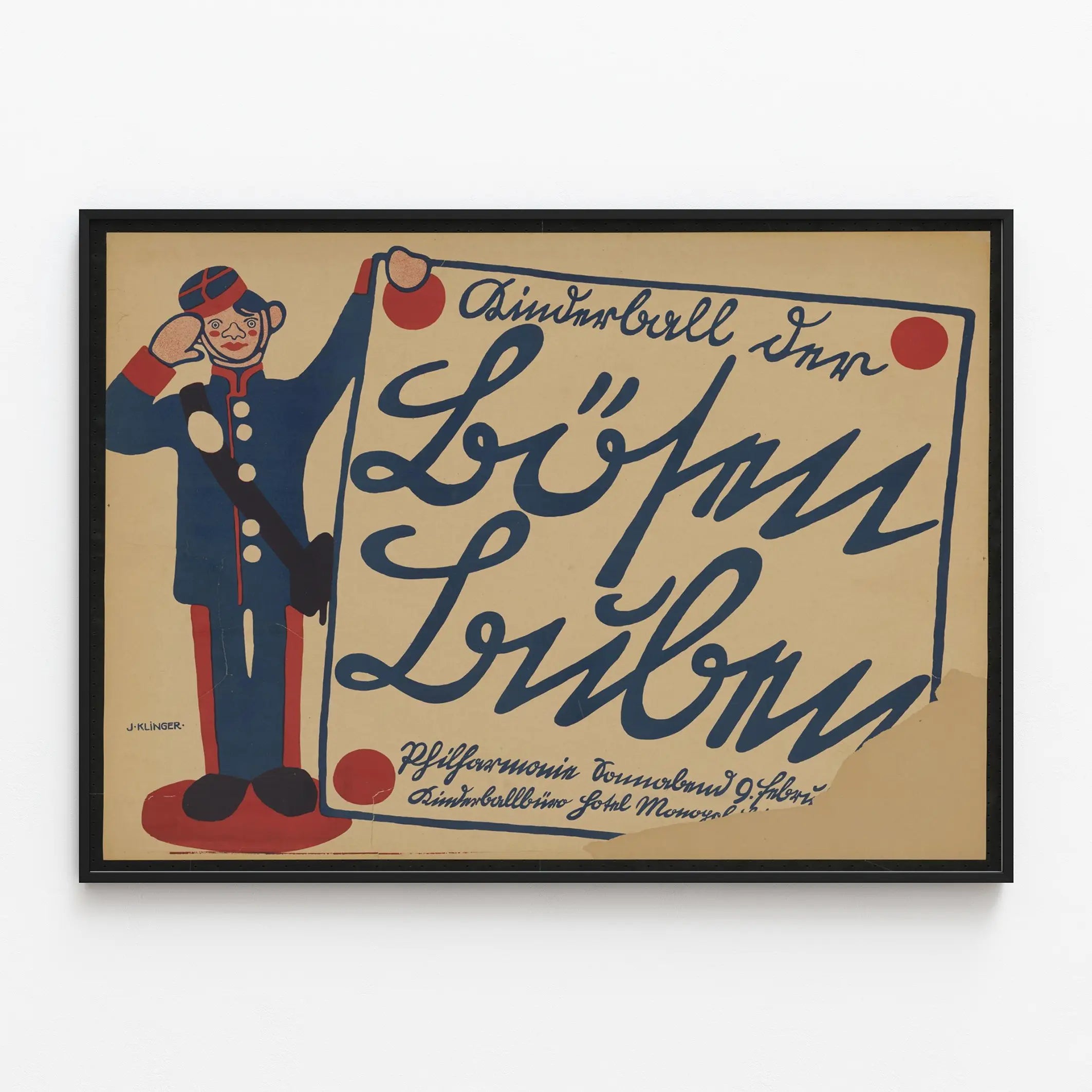 Découvrez cette affiche vintage unique qui apporte une touche rétro et artistique à votre décoration murale. Représentant un soldat stylisé en bleu et rouge tenant une grande affiche manuscrite, ce poster est un mélange d'illustration et de calligraphie soignée. Les grandes lettres cursives bleues sur fond beige créent un fort contraste visuel qui attire immédiatement l'œil, parfait pour un intérieur à la fois élégant et original. Idéale comme décoration murale, cette affiche vintage convient aussi bien pour un salon, un bureau ou une salle à thème historique ou artistique. Le style graphique du soldat est simple mais expressif, ajoutant un charme d'antan à votre espace. Les couleurs dominantes rouge et bleu s'harmonisent facilement avec divers styles de mobilier et palettes chromatiques, apportant dynamisme et caractère. Ce poster est une excellente idée d'affiche décorative pour les amateurs de graphismes anciens et les passionnés de typographie décorative. Parfait pour personnaliser vos murs avec un objet décoratif chargé d'histoire visuelle, il sublimera votre intérieur en lui donnant une dimension culturelle et esthétique affirmée. Apportez une note chaleureuse et authentique à votre décoration murale avec ce superbe exemple d'affiche vintage originale.