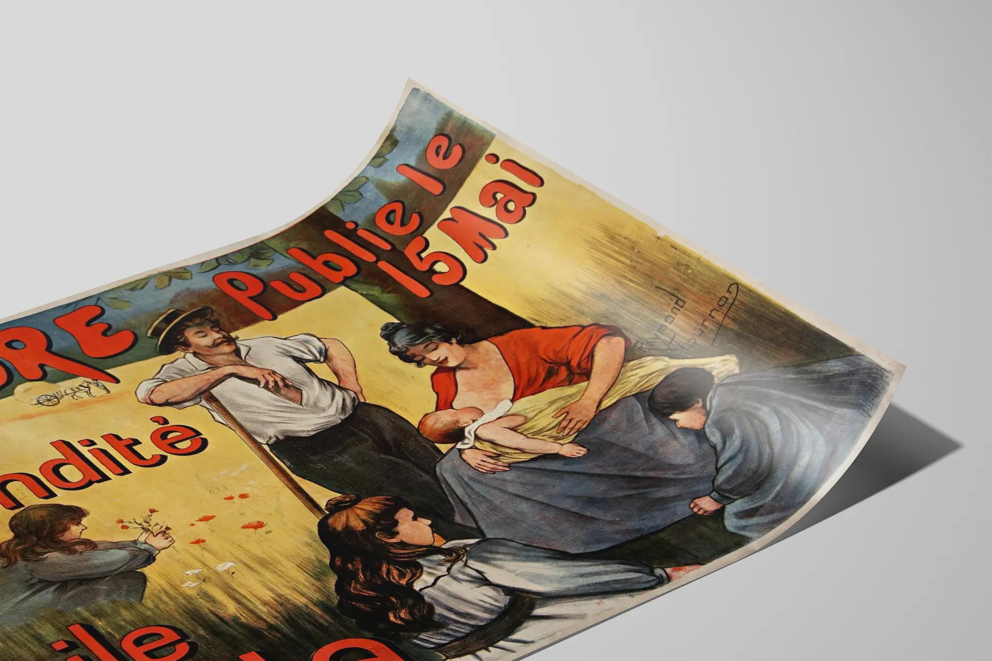 Cette affiche vintage met en valeur la publication de "Fécondité" d'Émile Zola, annoncée par le journal L'Aurore pour le 15 mai. L’image évoque une scène champêtre paisible, avec une famille réunie autour d'une mère allaitant son bébé, symbole central de la fécondité et de la vie familiale. Le style graphique, marqué par des couleurs chaudes et un trait illustratif délicat, invite à une ambiance chaleureuse et nostalgique. L'affiche est un bel exemple d'art publicitaire ancien, parfait pour la décoration murale dans un intérieur au style rétro ou classique. Son texte en lettres rouges visibles attire immédiatement l’attention et rappelle l’importance de la publication littéraire de cette œuvre majeure d’Émile Zola. Cette décoration murale s’inscrit aisément dans un cadre de salon, bureau ou bibliothèque, apportant une touche d’authenticité et d'histoire littéraire. Elle représente aussi un élément de décoration pour les amateurs de beaux-arts et d'illustrations d'époque. Ce poster mural transmet une atmosphère familiale et poétique, idéale pour créer un espace chaleureux et inspirant. Les détails des personnages et l’arrière-plan champêtre évoquent la vie rurale et traditionnelle, renforçant l’esprit de ce tableau décoratif. Une affiche murale unique pour enrichir votre intérieur avec une pièce à la fois esthétique et symbolique.