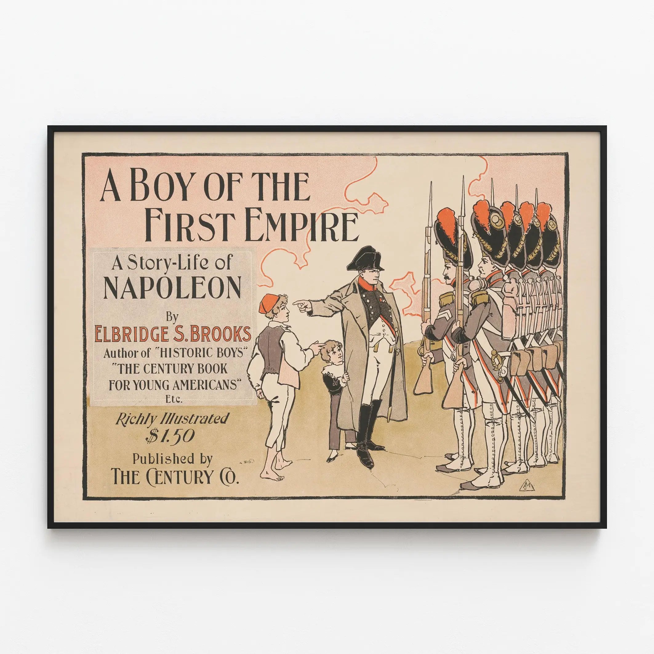 This vintage poster, titled "A Boy of the First Empire," is an ideal wall decoration for history enthusiasts and Napoleon admirers. It depicts the cover of a book recounting Napoleon's life, written by Elbridge S. Brooks, and stands out with its period graphic style featuring soft shades of beige, pink, and orange. This wall art showcases a scene where Napoleon, in his iconic military uniform, interacts with young boys while soldiers in First Empire uniforms are lined up in formation. The design highlights the details of the uniforms and gestures, with a highly aesthetic old typography effect, making it a perfect poster for a classic or themed interior. This printed poster is richly illustrated and evokes the historical era of the French First Empire, adding a cultural and educational touch to your interior decor. Ideal for a library, an office, or a living room, this vintage poster invites you to discover or rediscover a significant period in French history with an elegant and narrative visual approach.