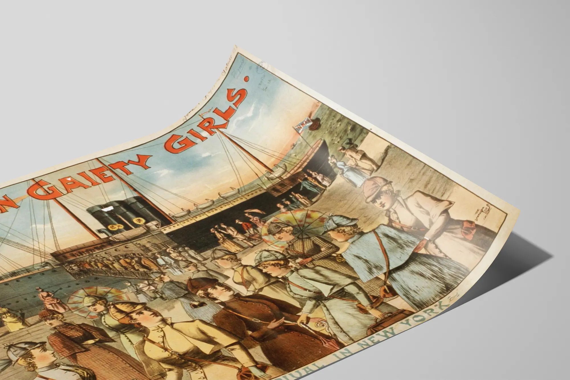 This vintage poster titled "The London Gaiety Girls - Their Arrival in New York" captures a lively historical scene showing the Gaiety Girls from London arriving in New York, in front of a large passenger ship at the dock. Beautifully illustrated with soft colors and a graphic style characteristic of old posters, this wall decoration evokes a nostalgic charm and an atmosphere of travel and elegance from the early 20th century. The image features a group of women dressed in period costumes, wearing matching hats and carrying refined accessories such as umbrellas, handbags, and gloves, suggesting a significant moment of transition and new opportunities. The background reveals the maritime desert with a few ships on the horizon, creating a sense of movement and history. This poster is perfect for enriching an interior with a touch of authenticity and nostalgia, ideal for lovers of vintage wall decor, historical posters, or retro graphic art. Whether for a living room, an office, or a bedroom, this vintage poster adapts to wall decoration inspired by travel, classic style, or vintage theater. Its unique design and format allow it to be easily integrated into various interior styles, from the most traditional to the most eclectic, bringing timeless elegance. Add a remarkable atmosphere and a visual story to your space with this unique piece of historical wall decor.