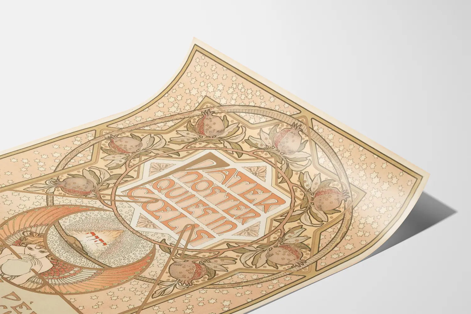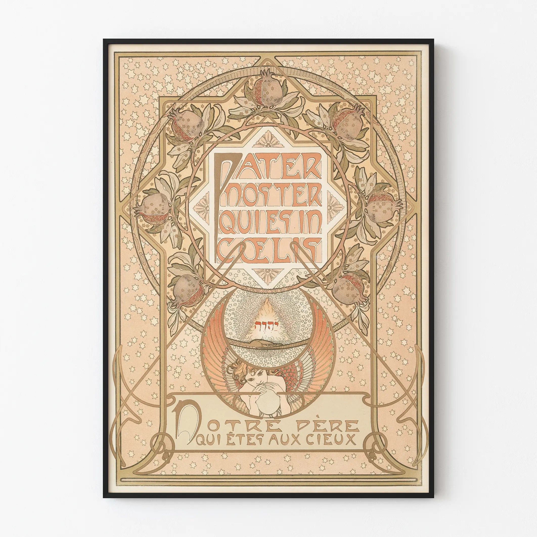 Discover this colorful Art Nouveau poster in soft shades of beige, brown, and light red, perfect for an elegant and refined wall decoration. This poster features a graphic composition centered around the inscription "Pater Noster qui es in coelis" followed by the French translation "Our Father who art in heaven," highlighted by a stylized and ornamental typography typical of the Art Nouveau movement. The scene is framed by a decorative border adorned with numerous stars and pomegranates, symbols often associated with life, rebirth, or spirituality. In the center, an angel with wings blows into a circular trumpet that frames a fiery triangle, on which Hebrew characters appear, emphasizing a mystical and sacred dimension to the artwork. This poster is ideal for enriching your interior, bringing an artistic, historical, and spiritual touch to your wall decor. It fits perfectly in living rooms, offices, or meditation spaces seeking a balance between detailed aesthetics and inspiring atmosphere. Give your walls a unique picture that combines iconographic tradition with early 20th-century artistic design, delicately illustrating a fundamental text. This decorative poster is a perfect choice for art lovers, culture enthusiasts, and stylized religious elements reimagined through a distinctive graphic style.