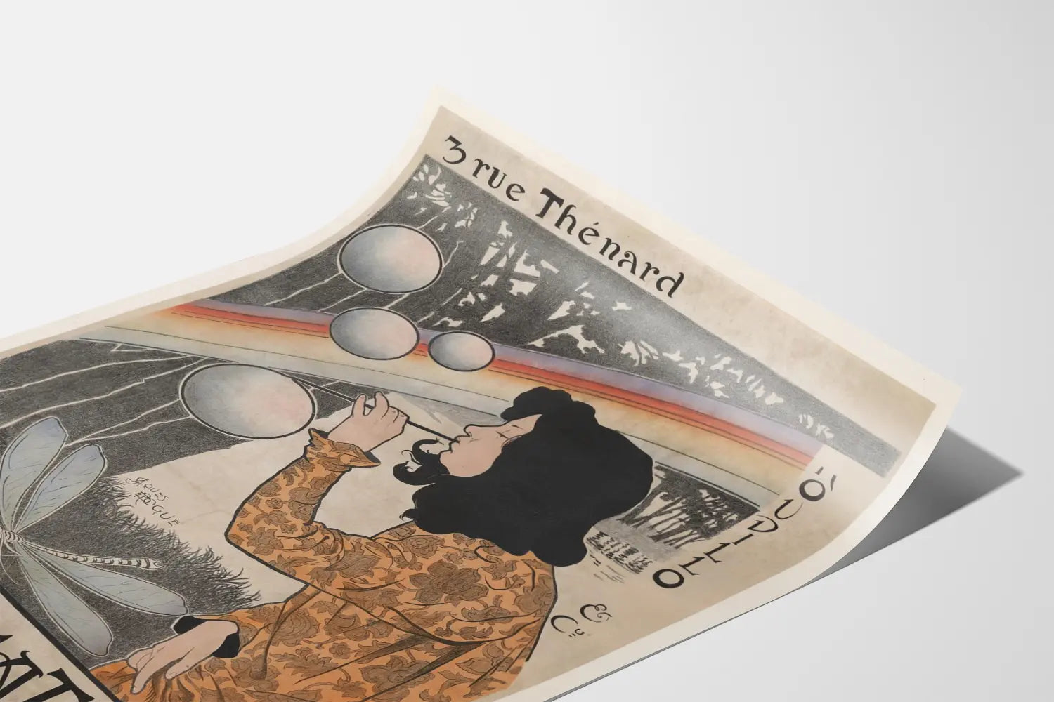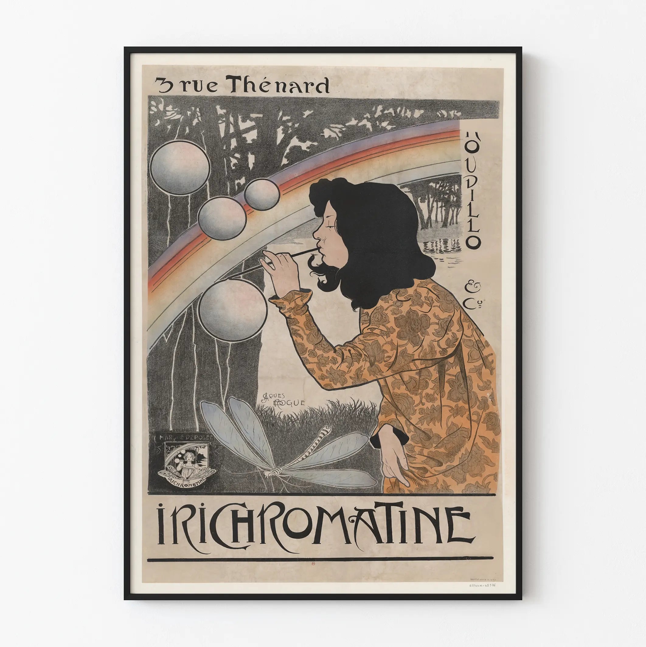Discover this distinctive Art Nouveau poster titled "3 rue Thénard" featuring Irichromatine, signed by the artist Jacques Rogue. This decorative print depicts a poetic and dreamlike scene where a woman holding a straw gently blows soap bubbles within a naturalistic setting marked by a rainbow and stylized trees in the background. The composition, typical of the Art Nouveau style, is characterized by the elegance of curved lines and the use of a subtle play of soft colors, including ochre shades, black, gray, and pastel touches on the decor. The woman wears a garment adorned with intricate floral patterns that enhance the refinement of the overall piece. This vintage wall art adds a retro and artistic touch to any interior decoration, while evoking the charm of old advertising posters. The inscription "3 rue Thénard" located at the top of the visual, as well as the name "Oudillo & Cie" on the right, add an extra layer of authenticity to this graphic work. This wall decoration is ideal for art and design history enthusiasts wishing to incorporate an evocative and delicate visual element into their space. It is suitable for hanging in a living room, office, or cultural space, bringing an elegant and nostalgic atmosphere. Enjoy this unique poster to enrich your vintage wall decor collection and give an artistic dimension to your walls with this distinctive creation.