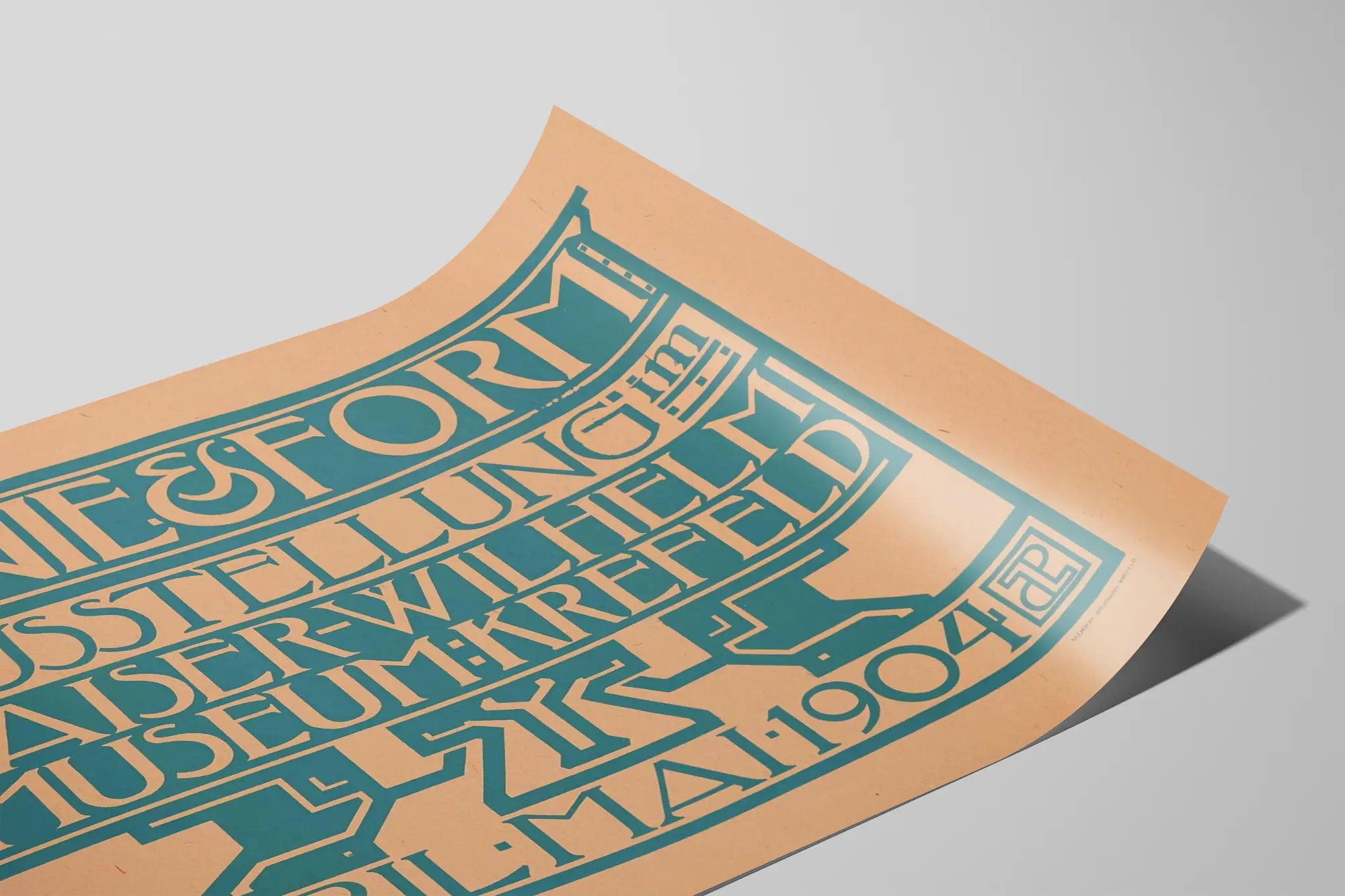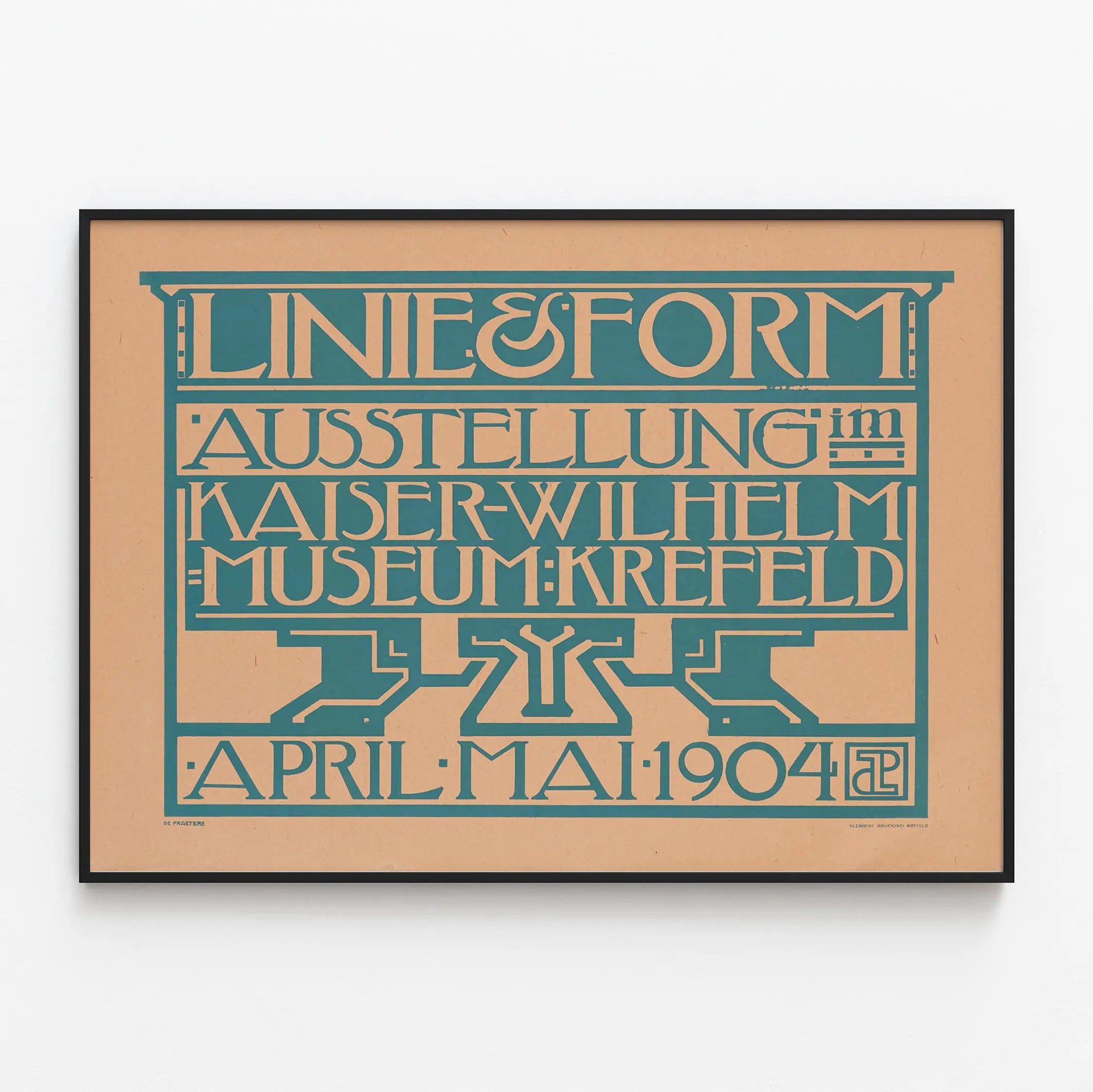 Here is a vintage poster in the Art Nouveau style characterized by geometric and ornamental typography, announcing an exhibition titled "Linie & Form" at the Kaiser Wilhelm Museum in Krefeld, which took place in April and May 1904. This poster is a perfect example of wall decoration for enthusiasts of graphic art and the history of typography. Its design highlights the balance and symmetry typical of Art Nouveau, with stylized shapes integrated into the text, developing into a harmonious and streamlined composition.