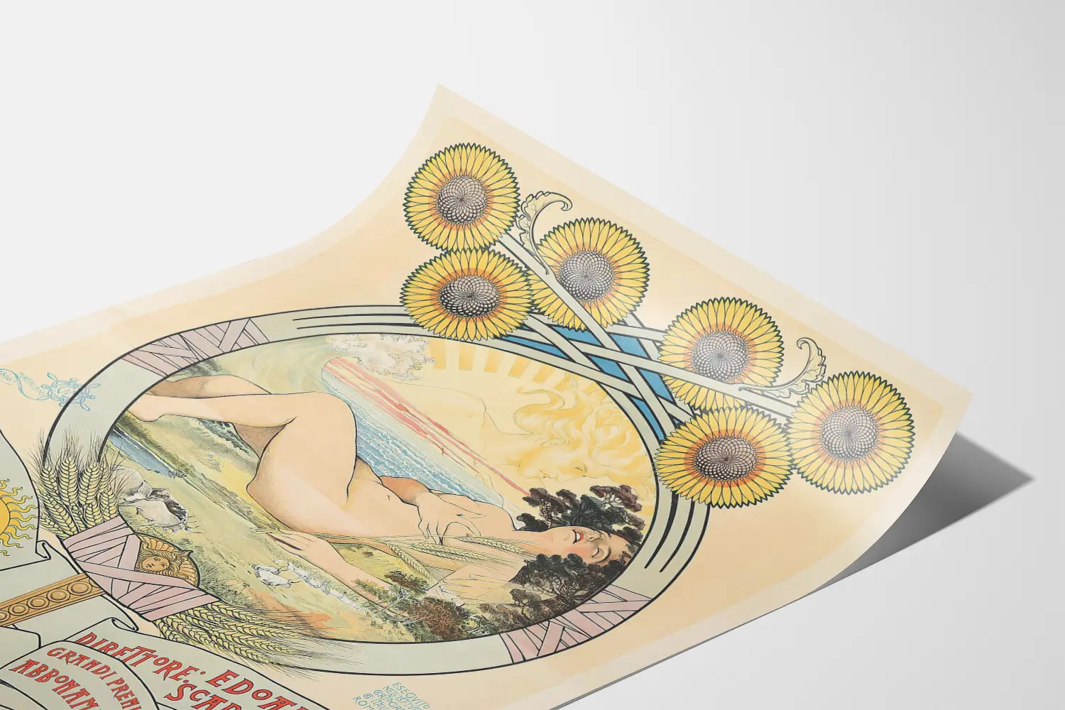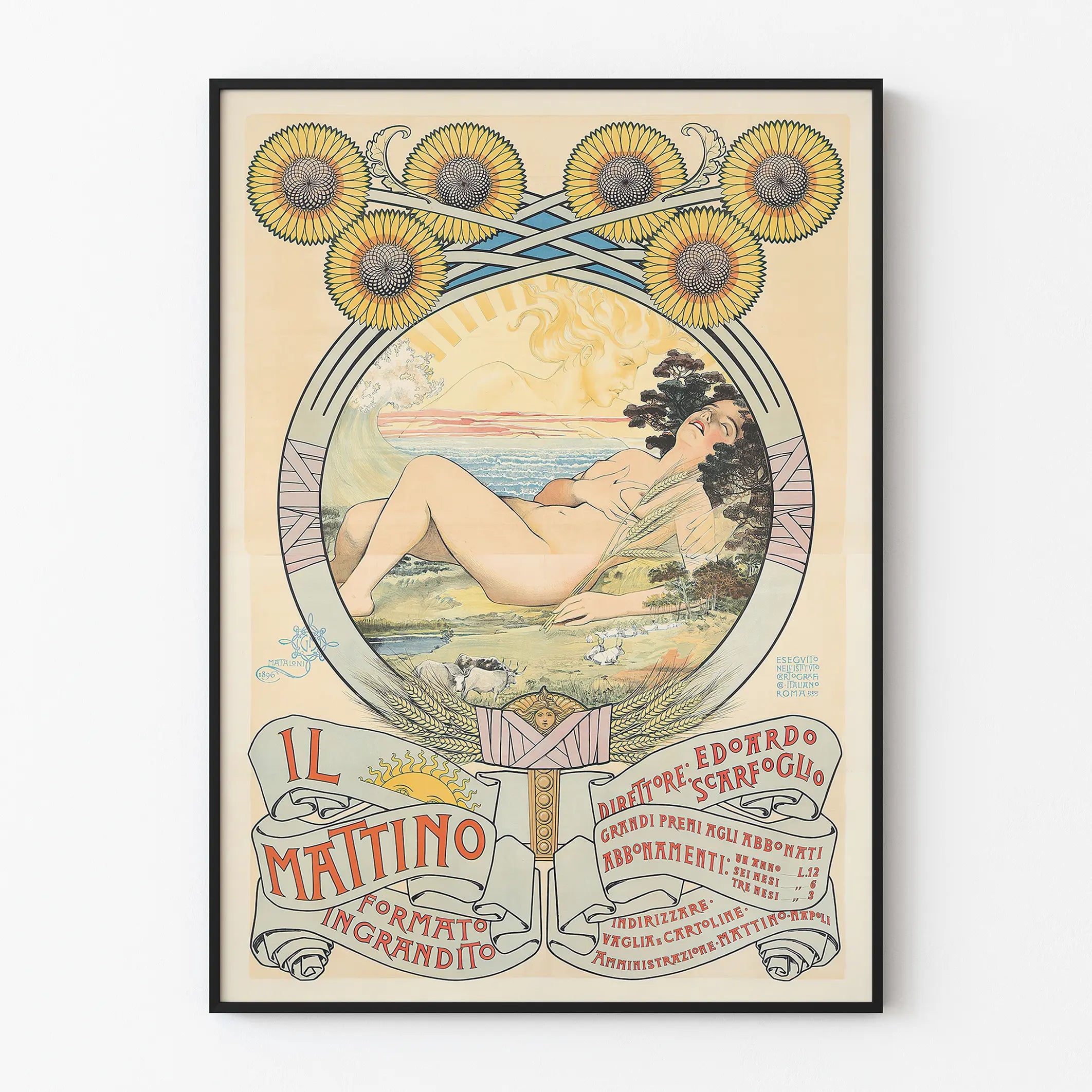 This Art Nouveau-style poster, titled Il Mattino, is a captivating and refined wall decoration piece. It features a reclining female figure, embodying the essence of nature and renewal, surrounded by a circle adorned with floral motifs. At the top, seven radiant sunflowers add a sunny, luminous touch, evoking the morning energy and the natural cycle of the seasons. The circular frame and decorative graphic elements highlight the harmonious aesthetic typical of the Art Nouveau movement, characterized by flowing lines and organic shapes. This poster is perfectly suited for an elegant and inspiring interior atmosphere, ideal for those wishing to incorporate a graphic artwork into their collection of decorative posters. The color palette, dominated by bright yellow tones, soft blues, and shades of beige, gives this piece a warm and soothing ambiance. The banner text at the bottom of the poster adds a vintage aesthetic with careful typography reminiscent of advertising or literary posters from the era. This wall decoration is suitable for various spaces, such as a living room, bedroom, or office, seeking to blend artistic tradition with the modernity of the Art Nouveau style. This poster can become a true focal point in a room, bringing charm and elegance through its iconographic subject blending nature, femininity, and graphic poetry.