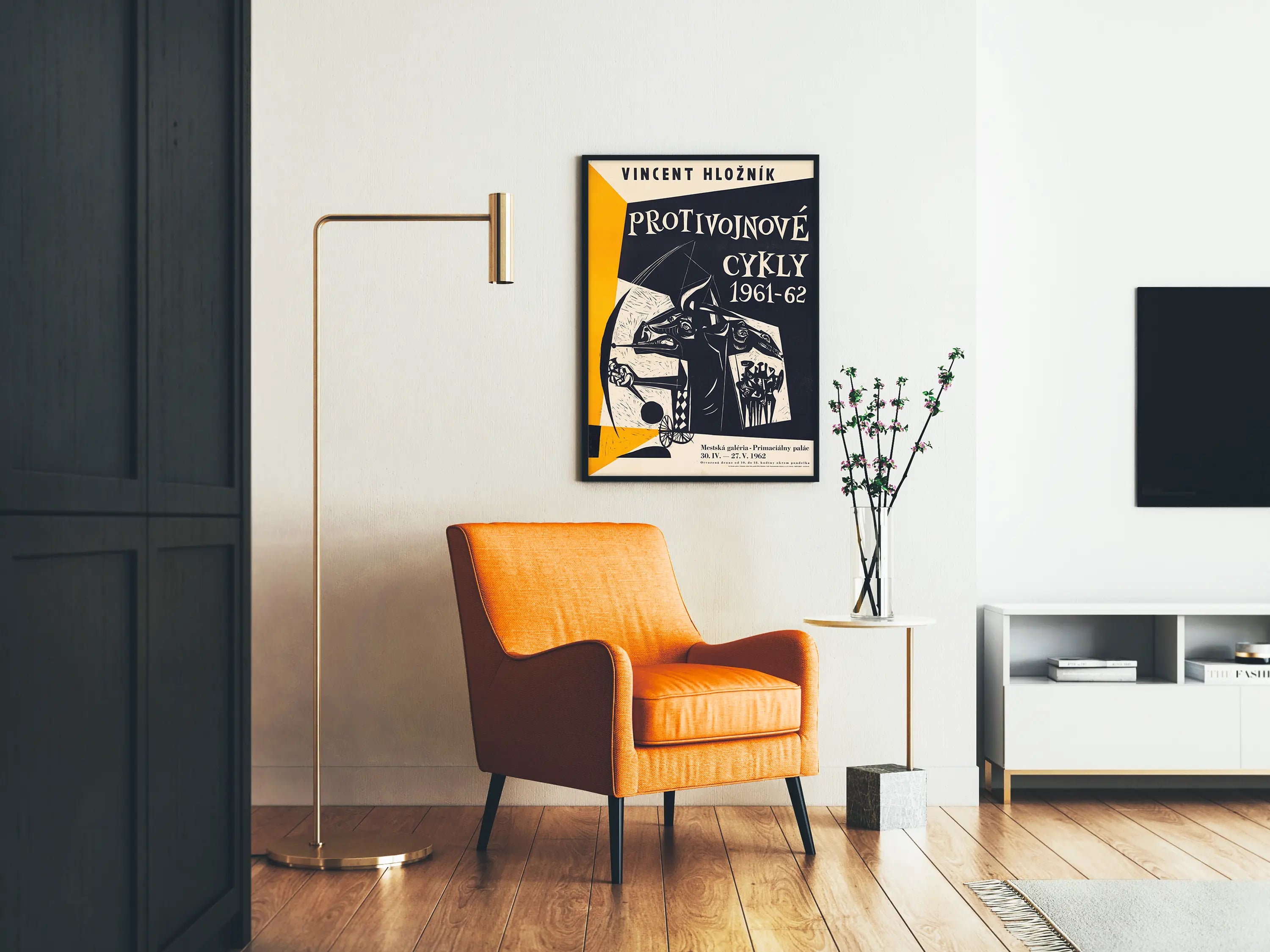 This artistic poster by Vincent Hložník titled "Anti-war Cycles 1961-62" is a striking wall decoration piece that adds a touch of expression and depth to any interior. With a graphic style characterized by a striking contrast between black and ochre, this poster immediately captures the eye with its symbolic illustration and original typography. The design features abstract and figurative shapes, notably a central figure with three animal heads and human silhouettes in the background, suggesting a powerful message around themes of peace and anti-war sentiment. This artistic print is ideal for those wishing to enrich their wall decor with a committed and aesthetic work, bringing a historical and cultural dimension to their space. Printed in shades of black, white, and orange, this wall decoration item stands out for its balance between simplicity and visual complexity, making it perfect for contemporary or modern decor. Give your interior a wall picture that stimulates reflection while decorating with character through this unique poster signed by Vincent Hložník.