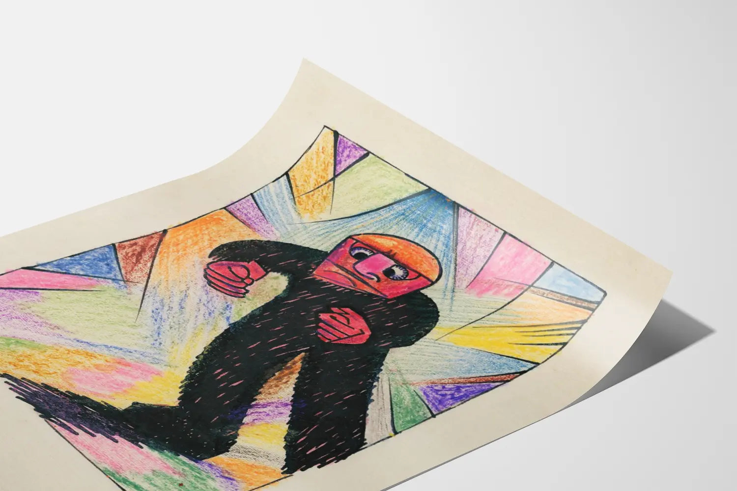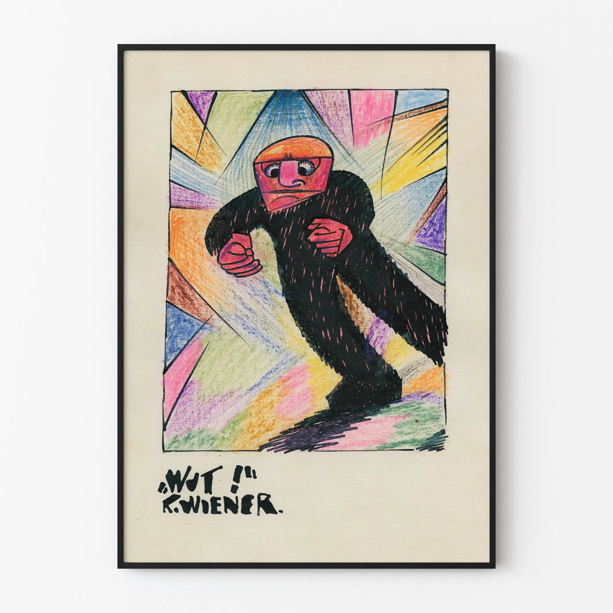 This unique poster, titled "Wut !" and signed K. Wiener, stands out with its vibrant expressionist artistic style. The drawing depicts a stylized human figure, with angular shapes and an intensely red face, conveying a strong emotion. The character, dressed in black, appears to advance determinedly within an abstract setting rhythmically punctuated by splashes of bright colors: pink, blue, orange, violet, green, and yellow blend in a dynamic gradient around the silhouette. The bold lines and geometric composition of the background bring a certain energy to the whole, making this piece a bold choice for wall decoration. The poster presents a harmonious blend of simplicity in line and richness in hues, allowing it to fit seamlessly into both modern interiors and creative spaces. Through its originality, this poster is ideal for those wishing to add a strong, expressive artistic touch to their decor. Whether in an office, a living room, or a studio, the vivid colors and powerful expression of this poster give it a central role in highlighting your walls. This original piece also showcases a unique graphic style that captures the eye with its intensity and authenticity, emphasizing the emotional power of the drawing. In summary, the "Wut !" poster by K. Wiener is an invitation to explore raw, colorful expression through striking wall decor, capable of transforming a simple space into a place full of character.