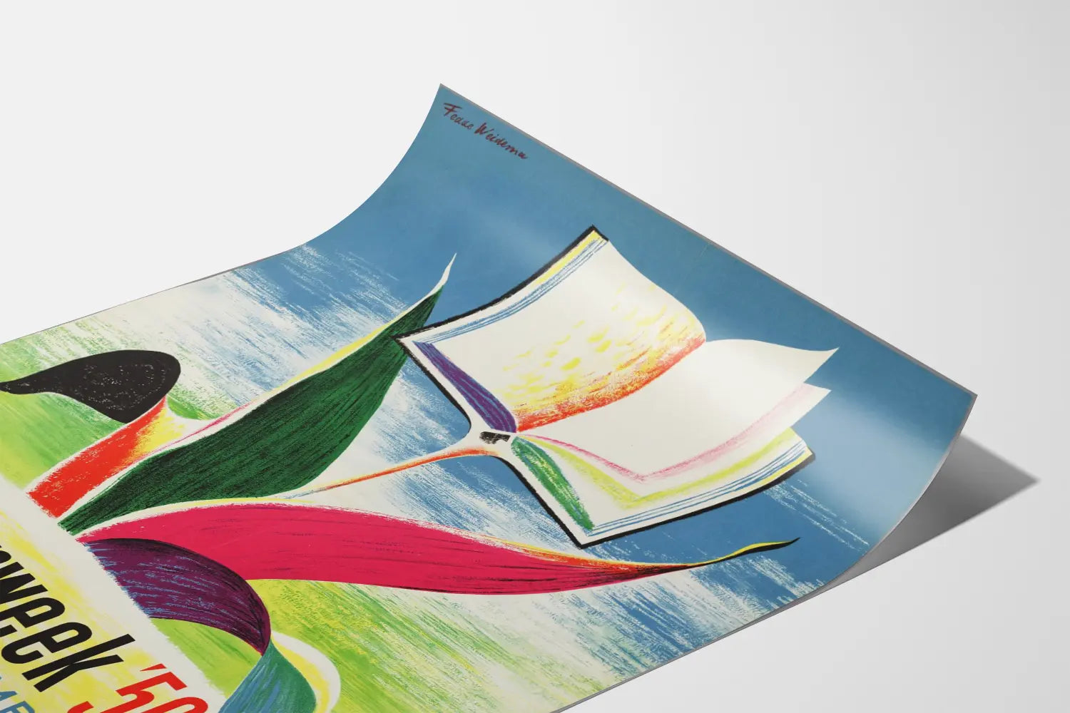 This vintage poster for the 1956 Book Week is a perfect wall decoration for enthusiasts of literature and retro art. The design features an open book floating atop a stem, resembling a stylized colorful flower, blending nature and culture in a poetic and graphic composition. The gradient background of blues and greens, along with the vivid colors of the leaves in red, dark green, purple, and black, enhances the dynamic visual effect of this poster.