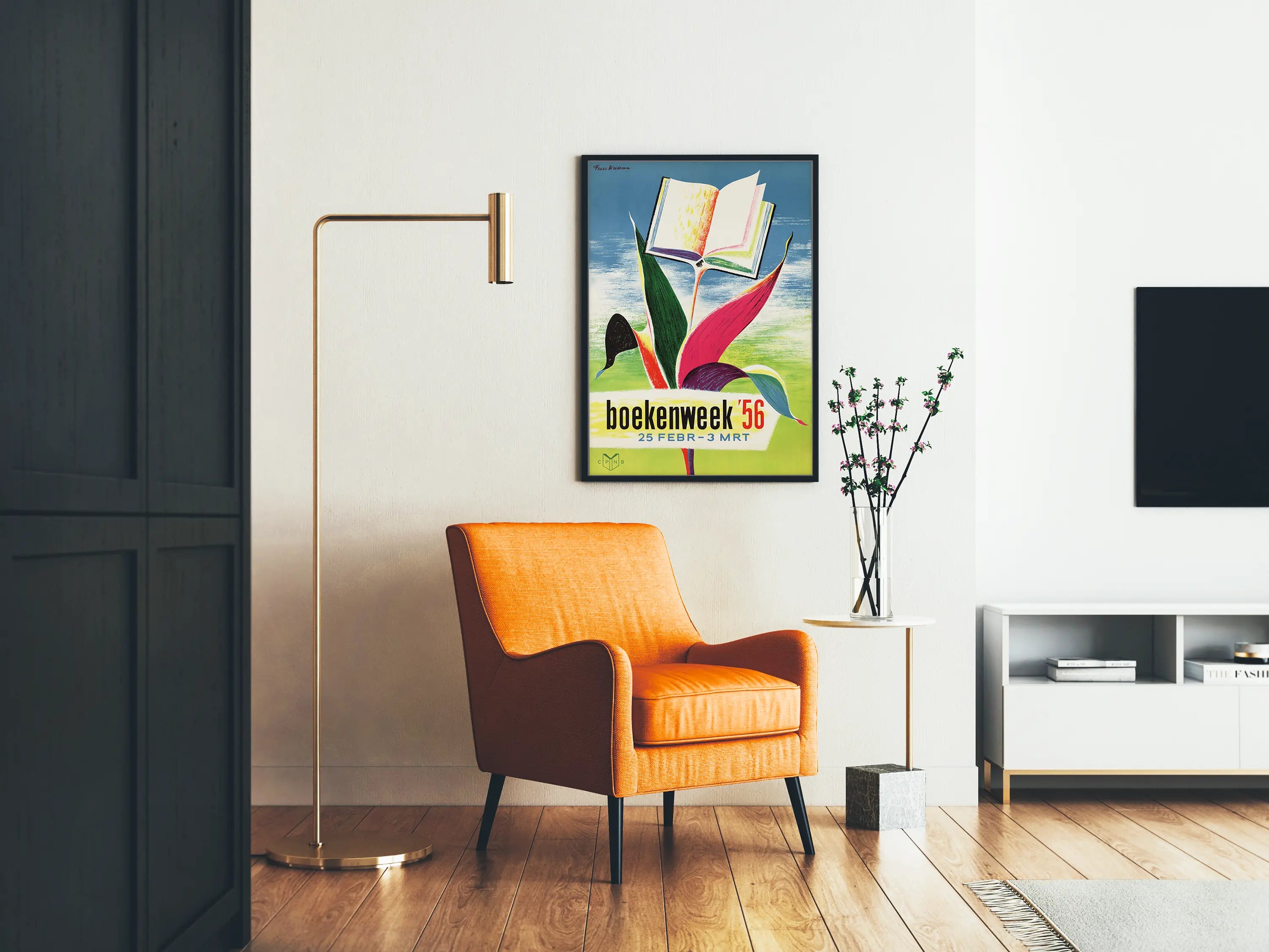 In summary, this 1956 Book Week poster is an excellent choice to enrich a wall with a graphic artwork celebrating literature and creativity. Its chromatic and formal composition makes it an elegant and inspiring decorative piece.