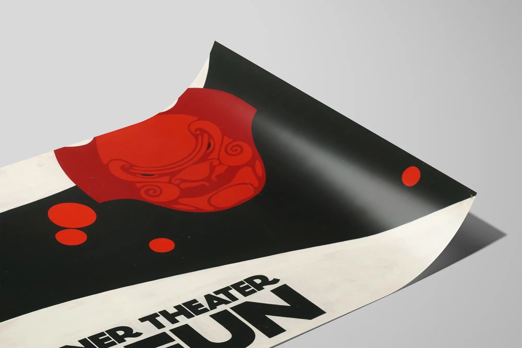 This poster "Berliner Theater Taifun" is a remarkable piece for any wall decoration seeking a bold and symbolic graphic style. Dominated by a strong contrast between black and white, it is punctuated with red circular shapes that captivate the eye. The stylized red face in the upper part of the poster adds a mysterious and intriguing touch, ideal for a modern and dynamic atmosphere in a living space or cultural venue.