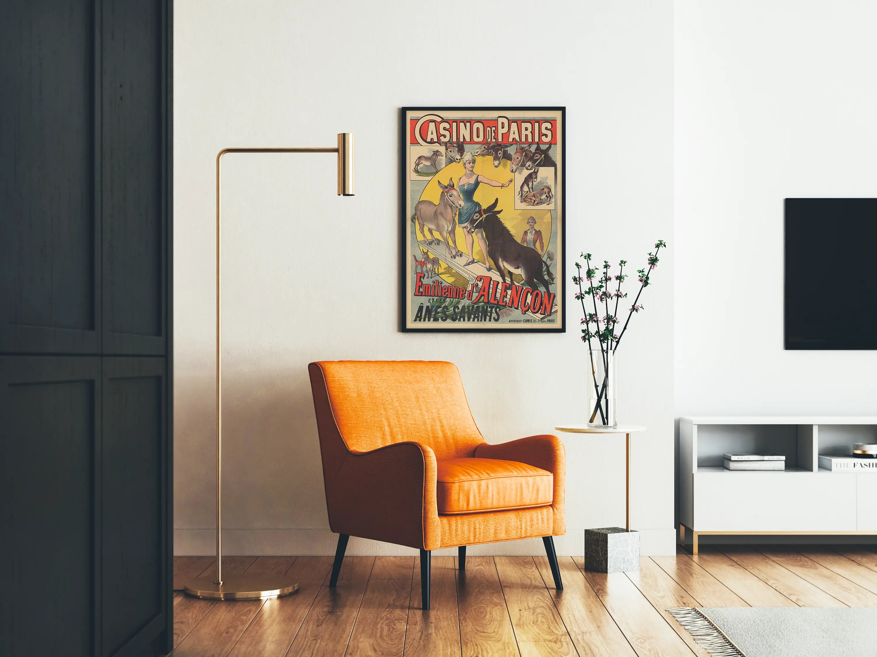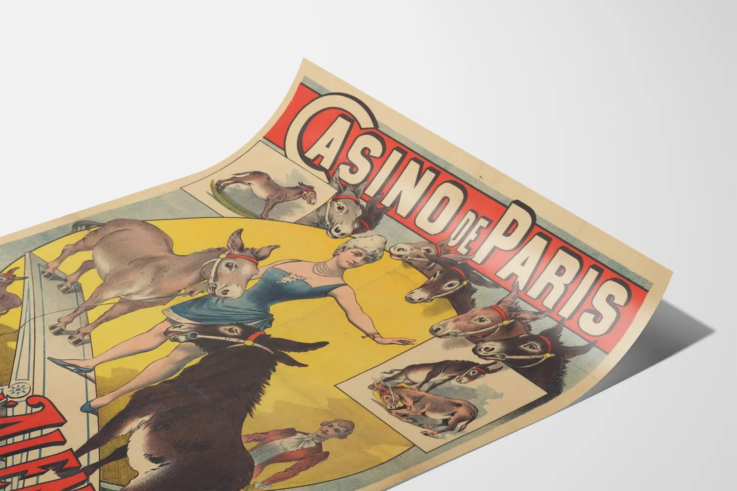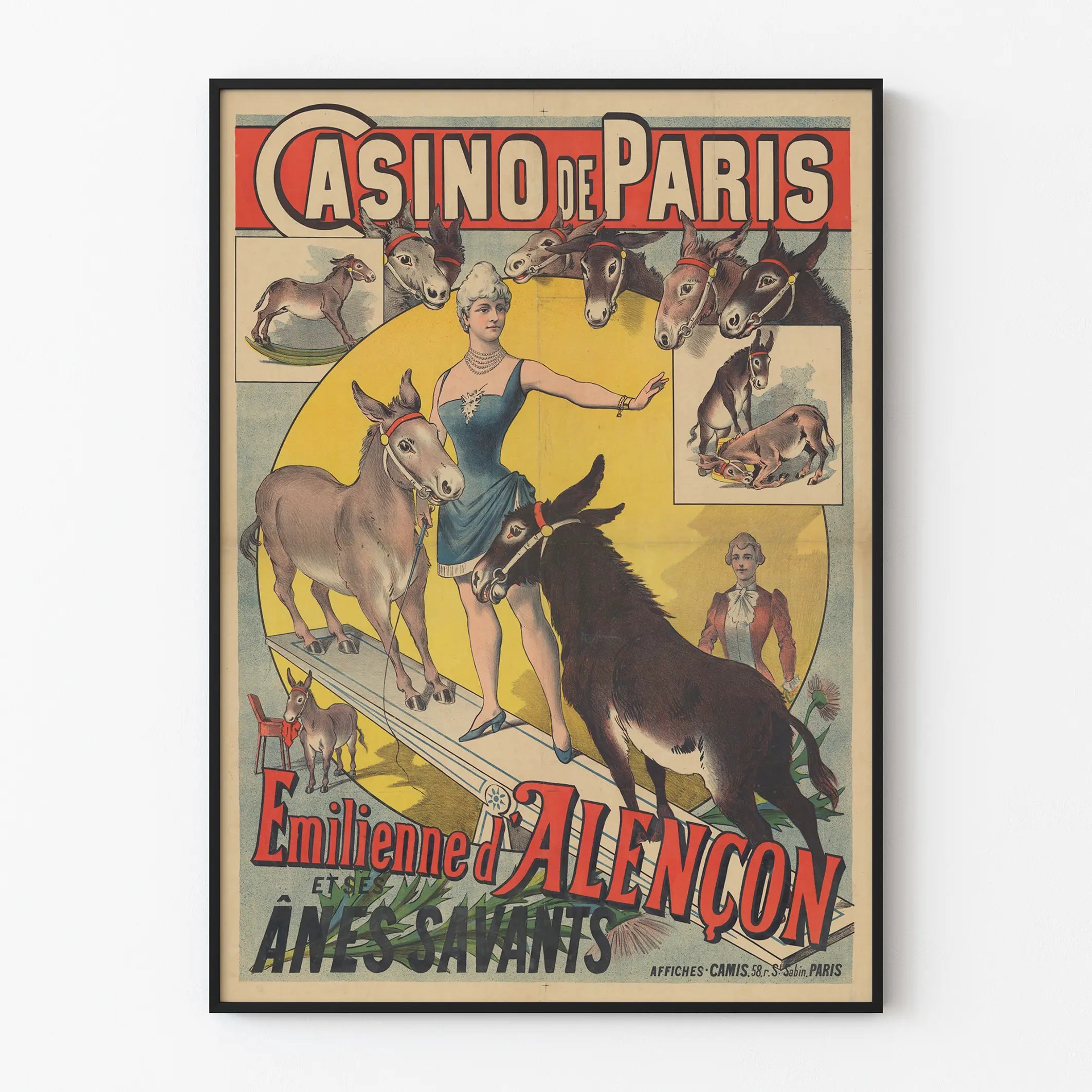 This vintage poster of the Paris Casino features Emilienne d'Alençon accompanied by her clever donkeys, a unique and original spectacle attraction. This authentic print evokes the charm and artistic elegance of Parisian revues from the past, highlighting the grace of the renowned artist surrounded by her stage animals. The donkeys, skillfully illustrated, appear in various poses demonstrating their training and rapport with the trainer. The graphic composition plays on a contrast of colors between a circular yellow background and a bright red border around the title, enhancing the visibility and visual impact of the poster. The antique style and retro aesthetic make it a perfect piece for any wall decoration, adding a touch of authenticity and nostalgia to your interior. Whether you are a fan of historic shows, vintage graphics, or trained animals, this printed artwork is an original decorative choice. Placed in a living room, game room, or cultural space, this poster captures attention and sparks curiosity. Give your walls a fascinating visual story with this striking print, a true tribute to the performing arts and the tradition of entertainment at the Paris Casino.