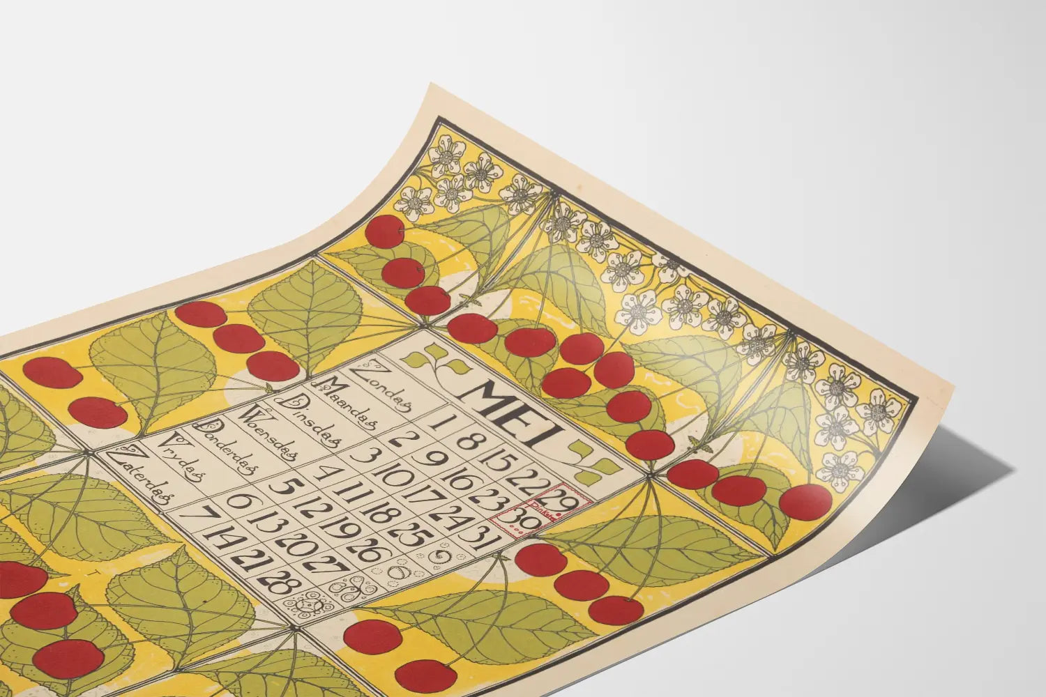 Discover this wall decoration poster depicting a calendar for the month of May 1898, adorned with stylized floral and fruit illustrations. This vintage piece highlights a graphic style characterized by a frame of branches decorated with bright red cherries and large green leaves, set against a luminous yellow background. The central calendar, presented in a clear grid, details each day of the week in Dutch, with elegant and meticulous typography, adding a touch of authenticity and vintage charm to your interior.