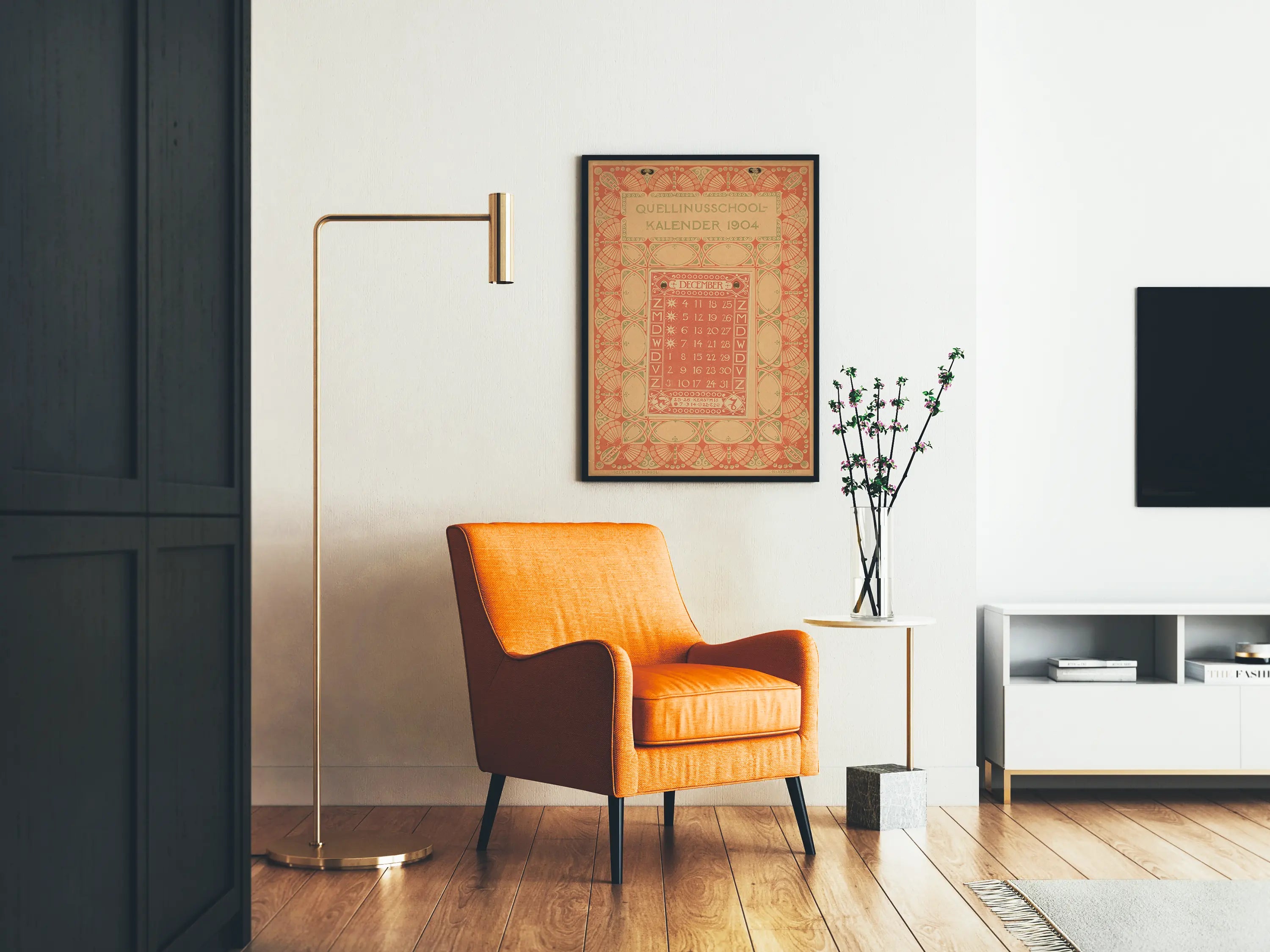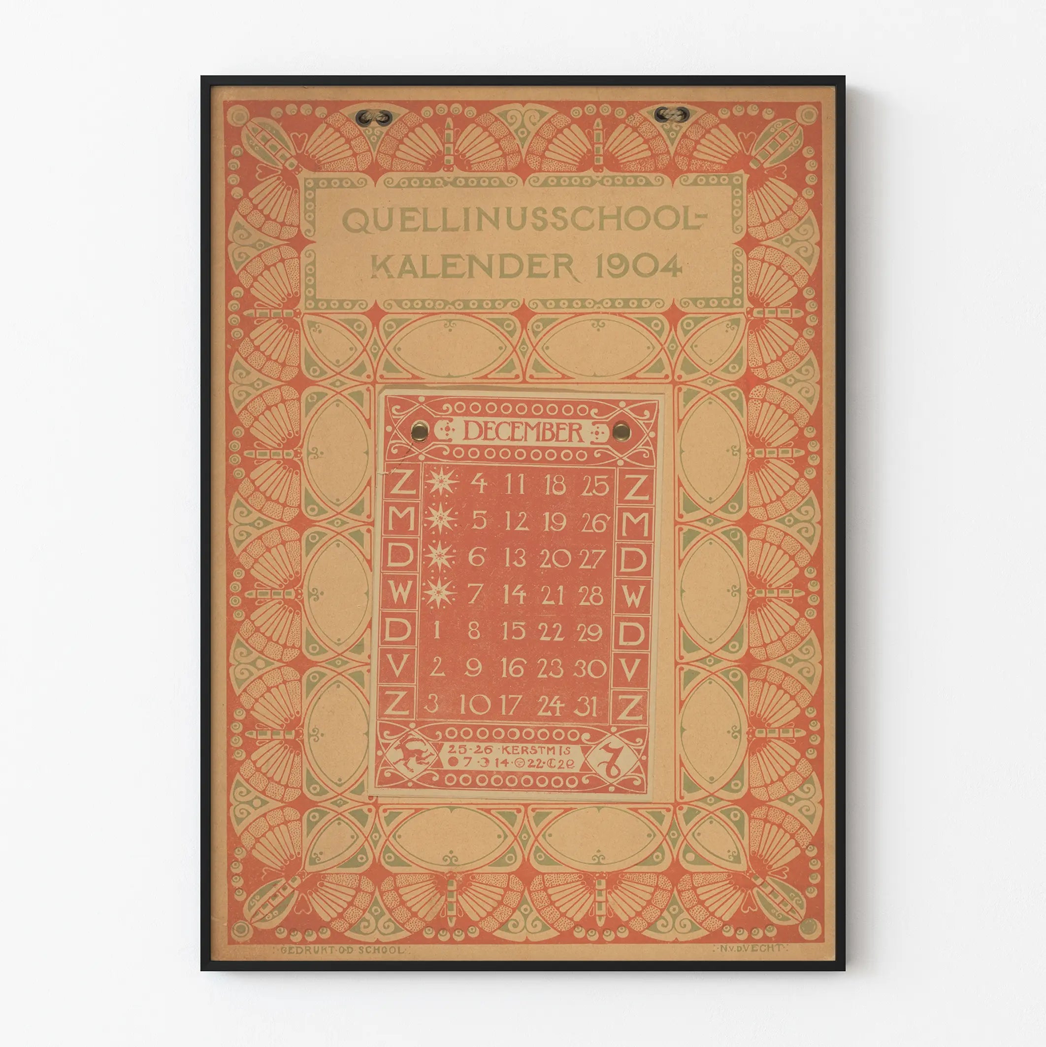 This original calendar poster features the month of December 1904 for the Quellinusschool, with a unique vintage and decorative design. This antique-style wall poster displays a soft color palette dominated by shades of red and beige, creating a warm and authentic atmosphere for this wall decoration piece. The ornamental frame surrounds the central calendar, highlighting symmetrical patterns reminiscent of geometric and natural shapes, offering a neat and detailed aesthetic. This calendar artwork is ideal for enthusiasts of retro decor or to enrich an interior with an object full of history and charm. Each day of the month is carefully inscribed within an orderly grid, with special symbols marking important holidays, adding a functional dimension to this decorative element. This historic wall poster is perfect for those wishing to add a touch of vintage elegance to their space, whether in an office, living room, or library. Its balanced graphic composition and period typography style make this poster suitable both for vintage decor and for a collection of graphic art objects. It harmonizes seamlessly with tastefully decorated interiors by displaying an artistic calendar that invites you to immerse yourself in the atmosphere of the early twentieth century. This authentic wall decoration piece is a perfect choice to enhance an empty wall and bring a touch of refined, historic originality.