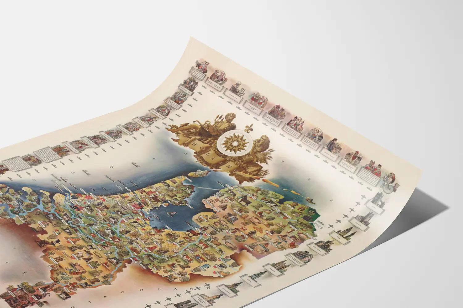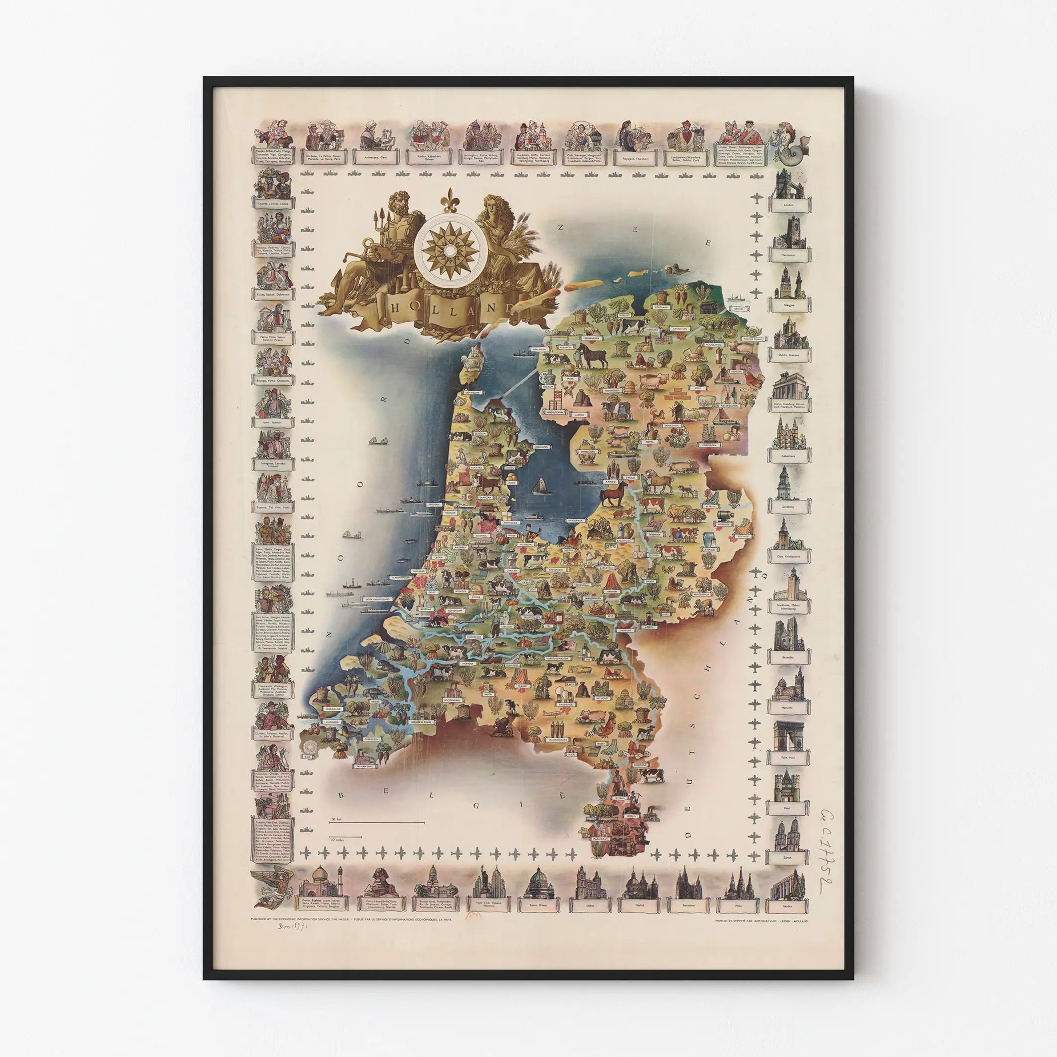 The design of this cartographic poster skillfully combines artistic finesse with geographical information. You will notice the major Dutch cities identified by precise labels, along with symbolic icons illustrating local specialties such as agriculture, livestock, and various craft productions. The presence of a compass rose surrounded by mythological figures at the top of the map adds a vintage and authentic charm to this wall decoration.