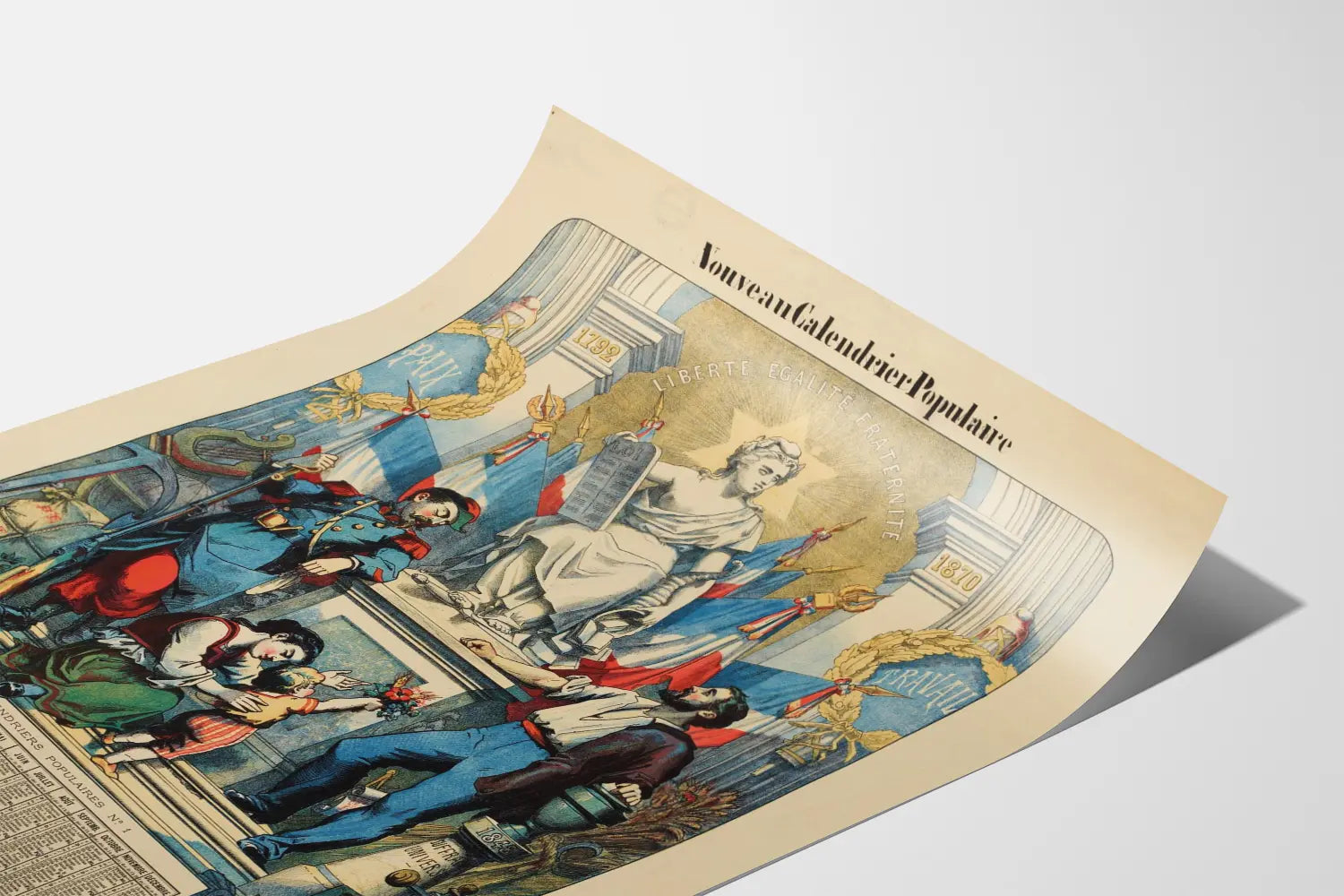 Discover this magnificent vintage poster depicting a popular calendar of the French Republic. This wall decoration features an allegorical sculpture symbolizing the fundamental values of the Republic: Liberty, Equality, and Fraternity, inscribed within a luminous halo in the shape of a star. Accompanied by tricolor flags, this image embodies peace and work, two pillars of society represented by human figures: a soldier, a worker, and a mother with her child. The juxtaposition of these historical symbols, dating from 1792 to 1870, highlights an important period in French history, reinforced by elements such as the law table and the inscription ‘Universal Suffrage’ on a pedestal from 1848.