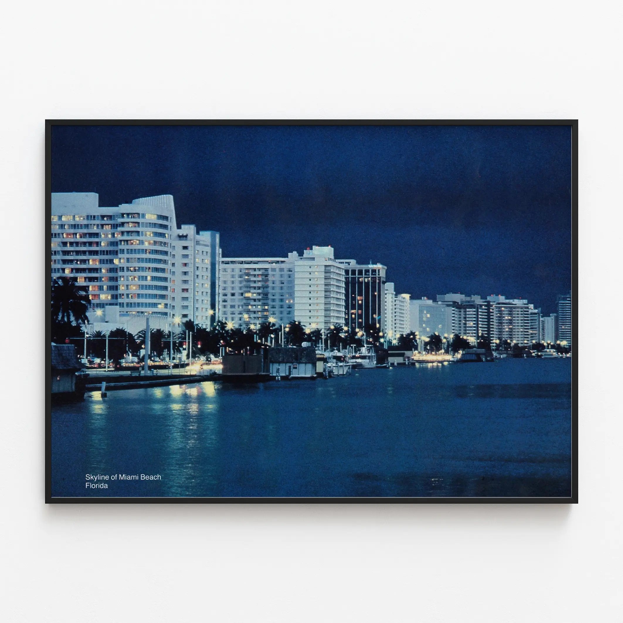 Discover this wall decoration poster depicting the Miami Beach skyline in Florida, illuminated at dusk. This print highlights the modern, elegant buildings lining the coast, with their shimmering lights reflecting on the calm water of a canal or bay. Perfect for infusing an urban and contemporary atmosphere into your interior, this poster offers a soothing nocturnal scene where the depth of the starry sky contrasts with the glow of streetlights and illuminated windows.