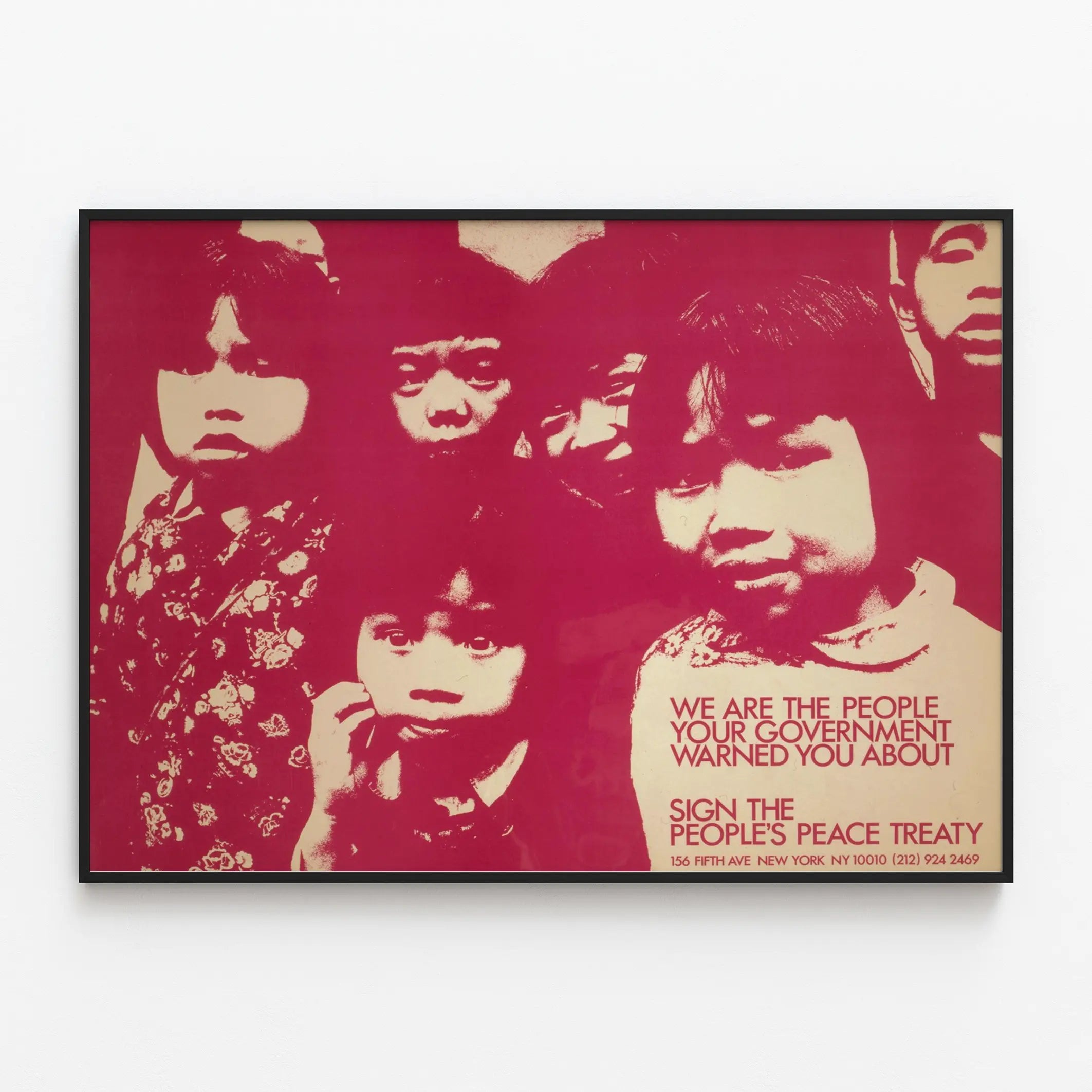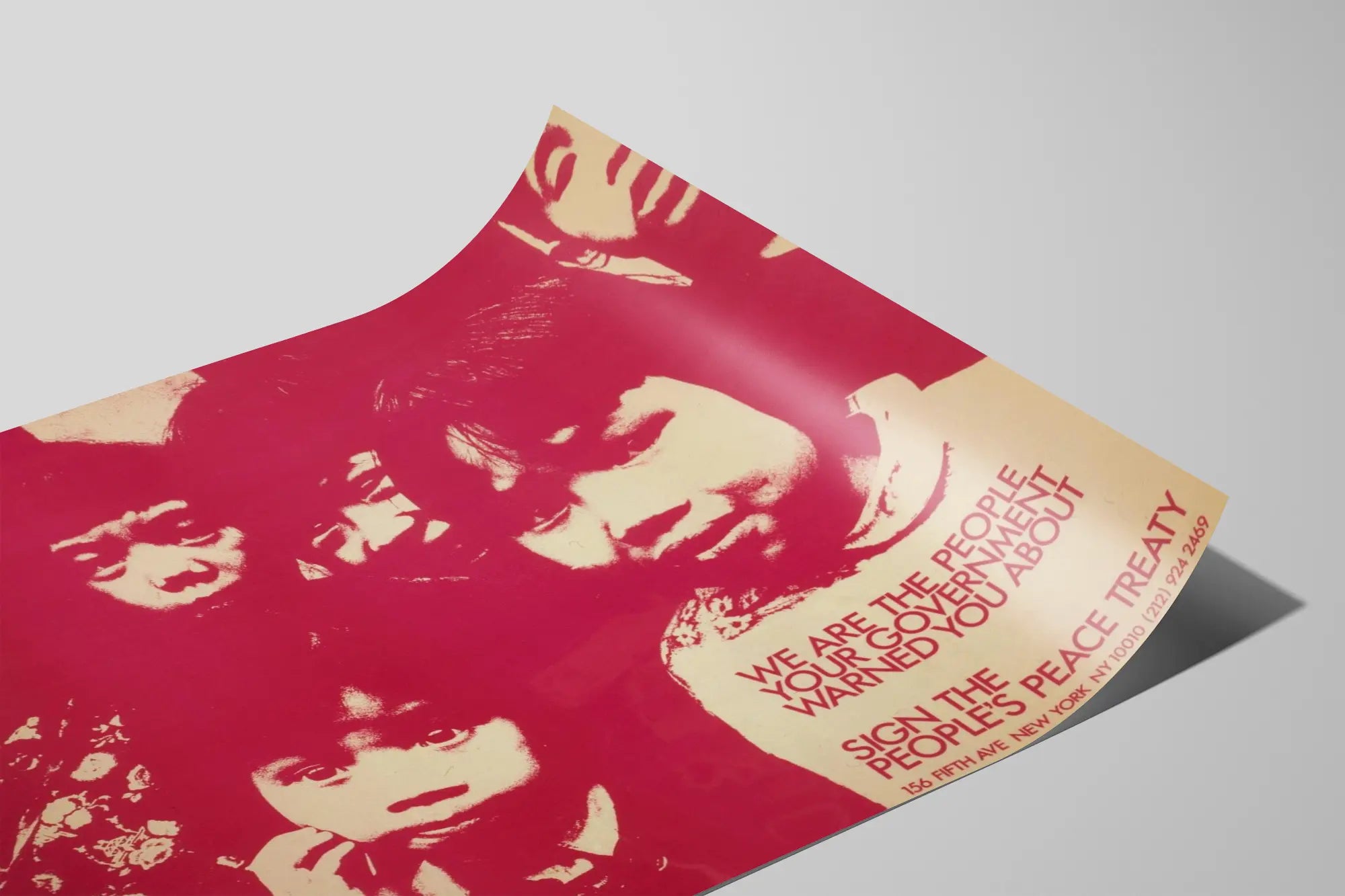 This striking wall poster features portraits of children rendered in shades of red and cream, creating a bold and evocative contrast. The distinctive text "We Are The People Your Government Warned You About" and "Sign The People's Peace Treaty," written in red letters, amplifies the powerful message of resistance and civic engagement, giving this wall decoration a pronounced political and social dimension. This poster can seamlessly integrate into a contemporary interior or a space dedicated to reflection, adding an artistic and committed touch. This wall decor element appeals to all who wish to visually express support for peace and social justice. Its poster format allows for easy placement on various types of wall surfaces, whether in an office, living room, or community space. The choice of colors and graphic composition give this piece a striking and dynamic visual impression, promoting a message of unity and civic vigilance. This decorative work has a strong presence, making it ideal for adding character to your living or working spaces. By choosing this poster, you invest in an original decorative piece that provokes thought while enhancing your wall with style and authenticity.