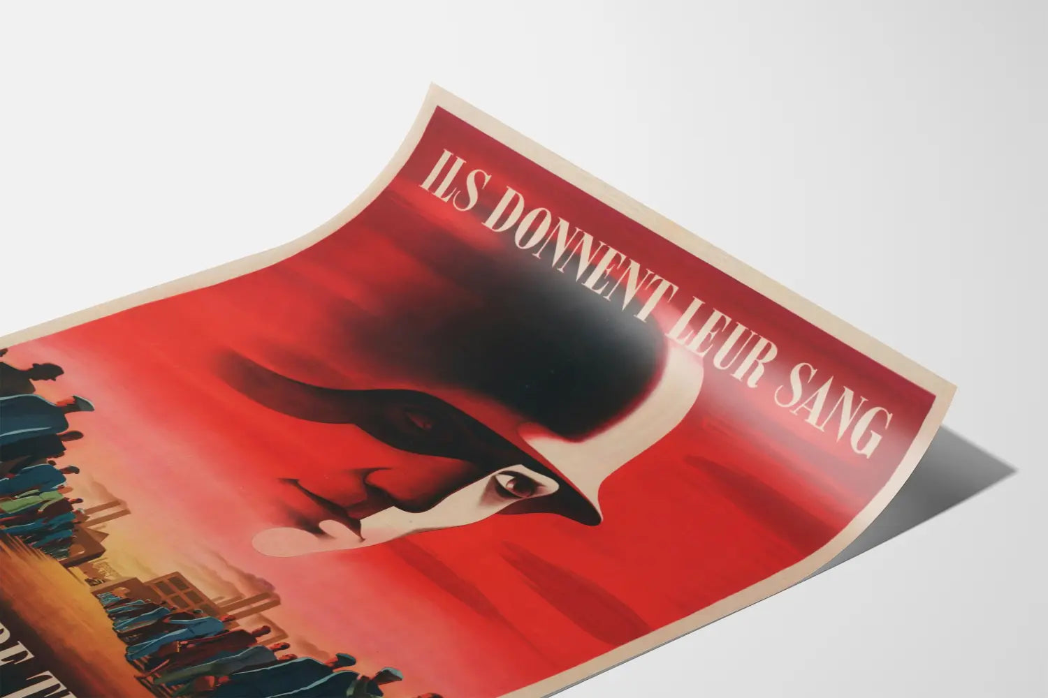 Discover this historical propaganda poster titled "THEY GIVE THEIR BLOOD - GIVE YOUR WORK to save Europe from Bolshevism." This vintage wall decoration features a powerful message conveyed through striking graphics that capture the eye. The visual depicts a large face of a helmeted soldier against an intense red background, symbolizing sacrifice on the battlefield. Below, a line of workers, shown from behind, advances toward a factory, illustrating the call for civilian and industrial mobilization. The contrast of vivid red and dark shades emphasizes the dramatic and urgent nature of the message. This poster is a striking piece for wall decoration, suitable for enthusiasts of history, retro design, and propaganda poster collections. Its distinctive graphic composition and historical message make it a unique wall art piece to enhance an interior with a touch of visual memory. Whether for a private collection or a space dedicated to 20th-century themes, this artwork displays a style strongly marked by its period iconography and typography. Give your walls this impressive poster blending artistic expression with a historical dimension for an original and impactful wall decoration.
