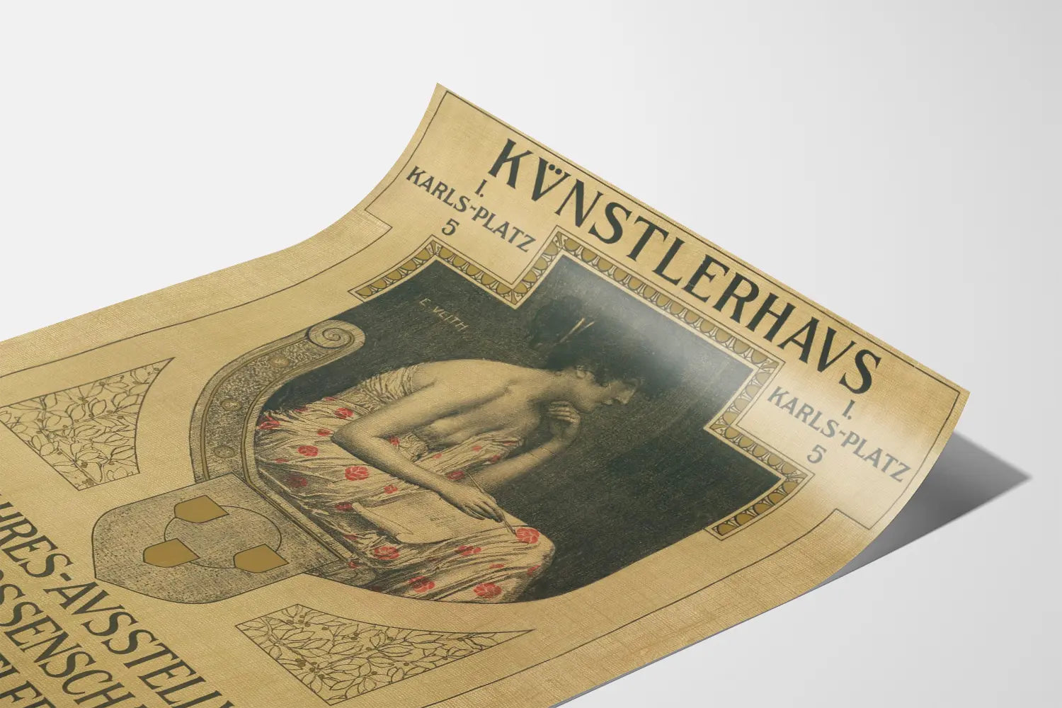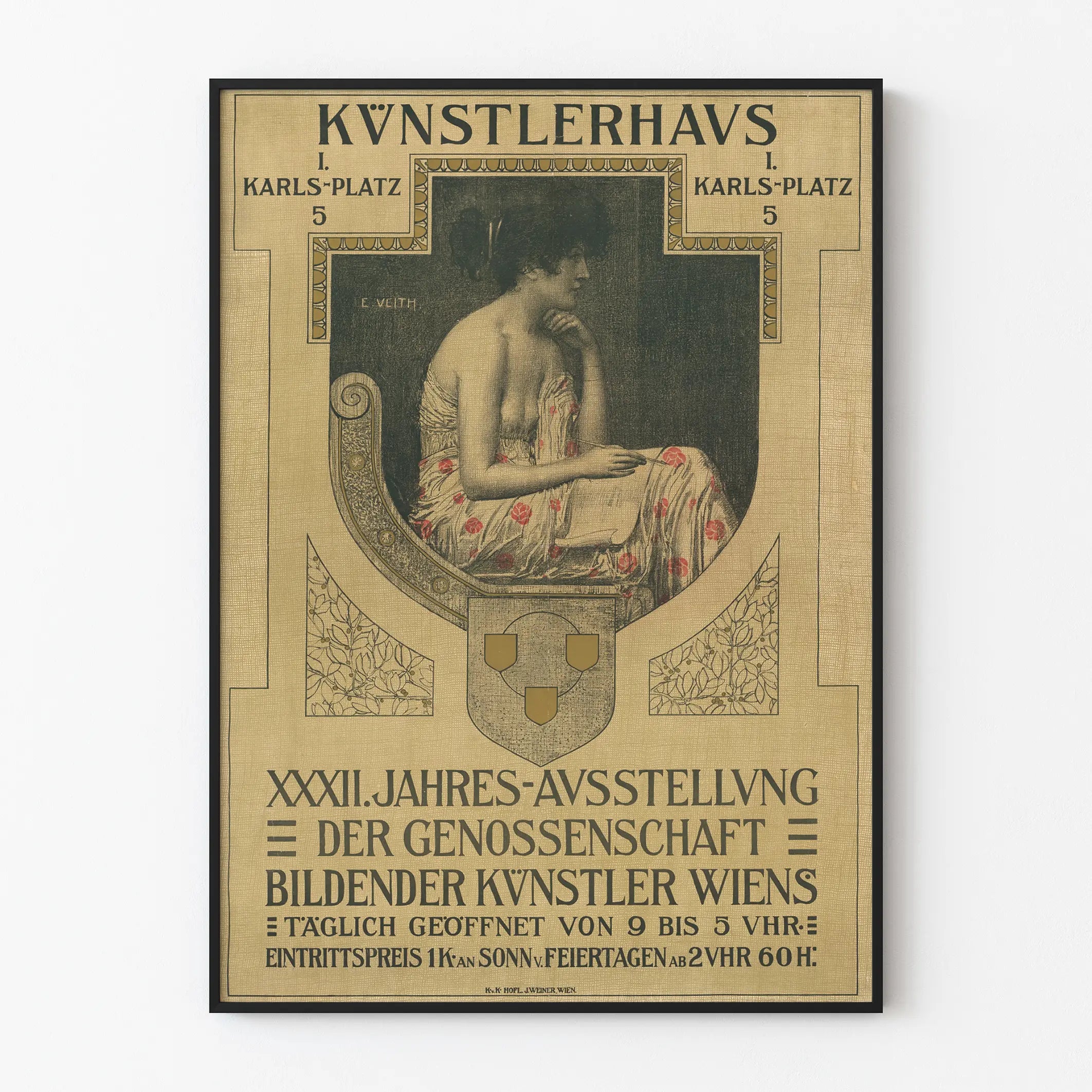 This vintage poster is an elegant and artistic representation of an annual exhibition of Viennese visual artists, held at the Kunstlerhaus, located at Karlsplatz 5. This poster is a remarkable example of wall decoration, perfect for art enthusiasts and lovers of historic design. The central illustration depicts a female figure in profile, seated and dressed in a gown adorned with red floral patterns on a light background, offering a subtle yet charming contrast with the dark tone of the background. This poster stands out for its graphic style, both classic and refined, with a geometric composition framing the main scene, notably featuring a coat of arms and decorative floral motifs. In terms of typography, the German text includes key information about the exhibition, such as the venue, daily opening hours, and specific entry fees for Sundays and public holidays. This poster is not just a simple event announcement; it also embodies a decorative piece that seamlessly integrates into any interior seeking an artistic and vintage atmosphere. To be used as a framed poster or wall picture, this visual helps enrich wall decoration with a touch of history and elegance. This type of wall decor is ideal for cultural spaces, art studios, or modern lounges wishing to display a strong taste for classic aesthetics and exhibition posters. In short, this piece is a unique choice for those who want to combine a passion for art with attention to detail in their interior decoration.