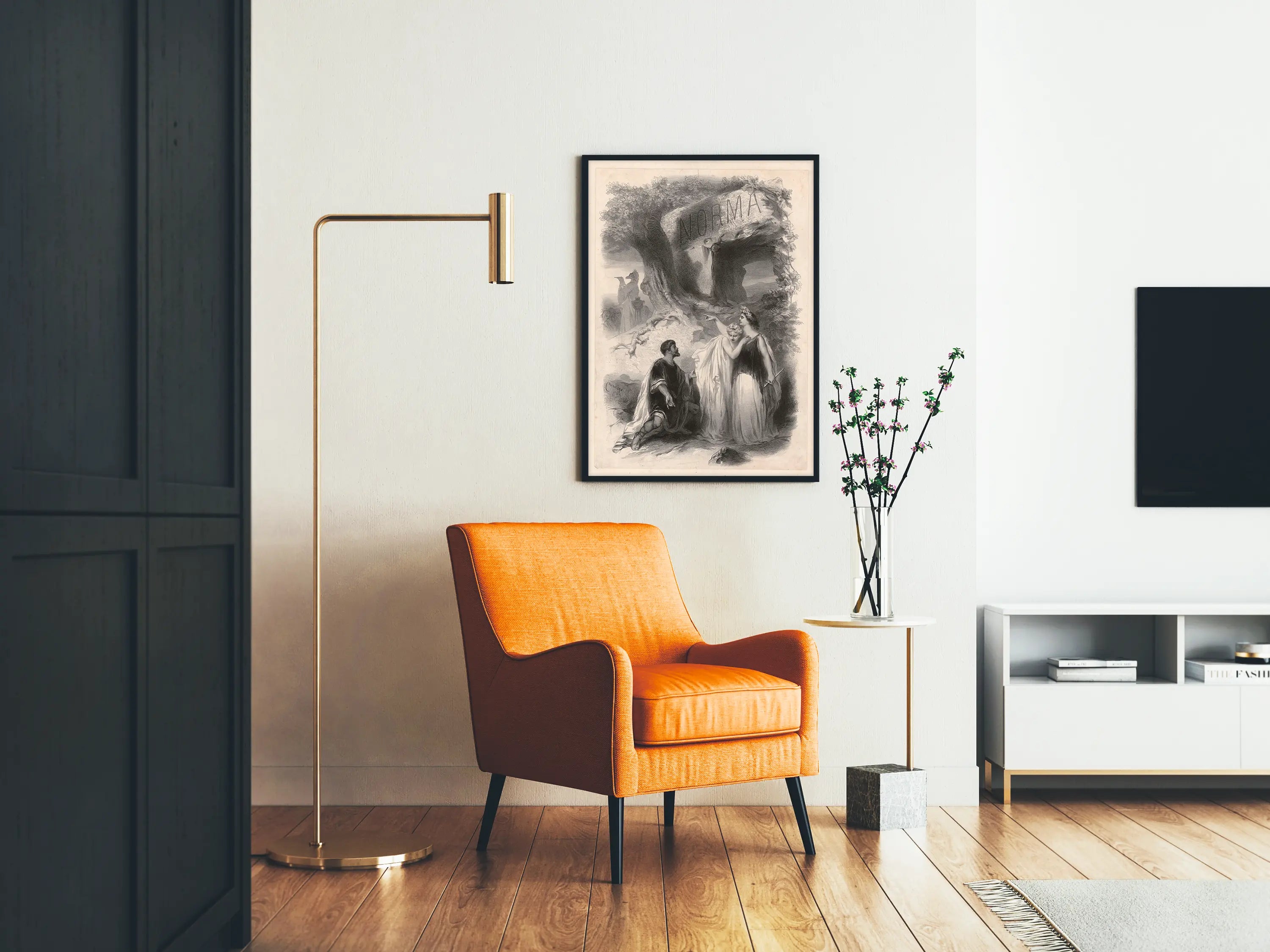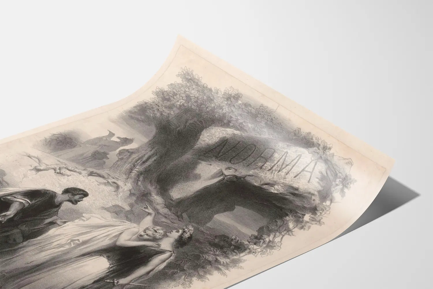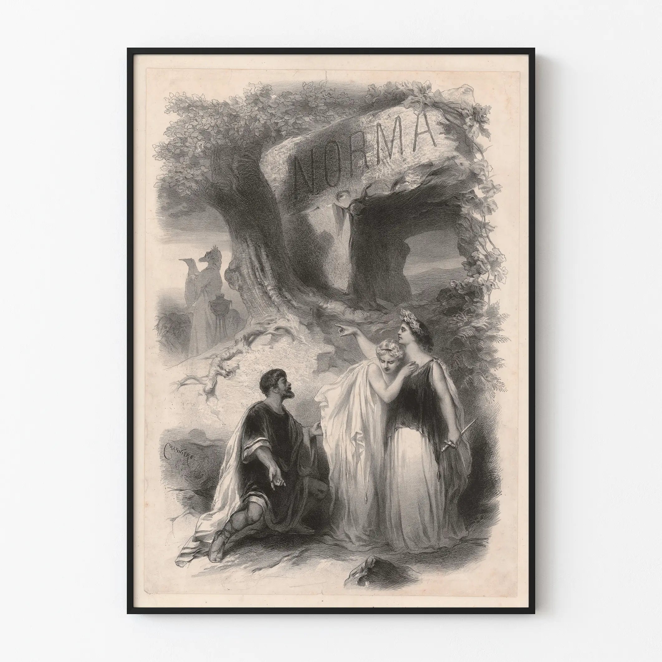 This vintage black-and-white poster features a dramatic scene titled "Norma." This classic print, rich in detail, depicts three characters at the foot of a large hollow tree trunk, on which the word "NORMA" is inscribed. The male figure kneeling on the left appears to be pleading or making a request, while the two women standing on the right display expressions of support and determination. One of the women wears a laurel wreath and holds a dagger, adding a tragic dimension to the scene depicted. The leaves and roots surrounding the trunk create a natural frame, while in the background, other silhouettes add a mysterious depth to the composition. As a wall decoration, this poster fits perfectly into a classic or theatrical interior. Its old engraving style with fine shadow play brings a touch of elegance and sophistication. This artistic poster is ideal for lovers of classical art and opera enthusiasts, evoking a dramatic and historical universe through a carefully crafted visual representation. Stable in a modern or traditional frame, this wall decoration will appeal with its authenticity and timeless aesthetic. Adding this "Norma" poster to your wall collection provides a piece that is both decorative and inspiring, telling a captivating story through a finely executed drawing.