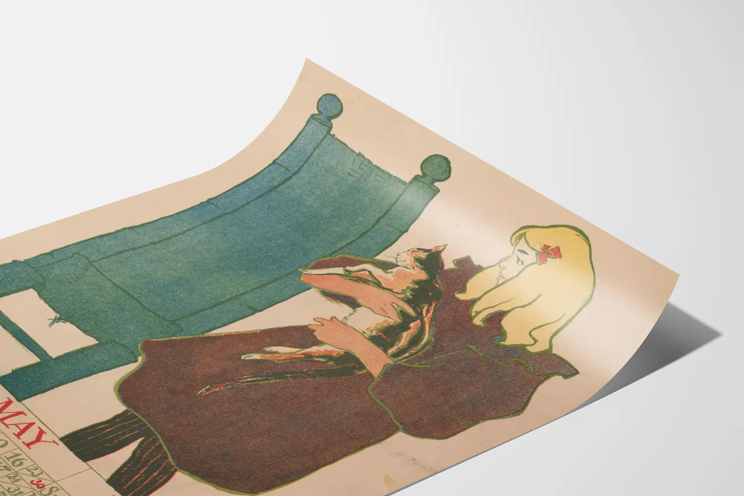 This vintage calendar poster offers a unique and charming wall decoration, illustrating the months of April, May, and June 1897. The poster features a gentle and nostalgic scene, highlighting a young blonde girl holding a cat in her arms, beside a large blue armchair. This image, with its delicate and classic graphic style, adds a touch of elegance and authenticity to any interior, making it ideal for enthusiasts of retro wall decor.