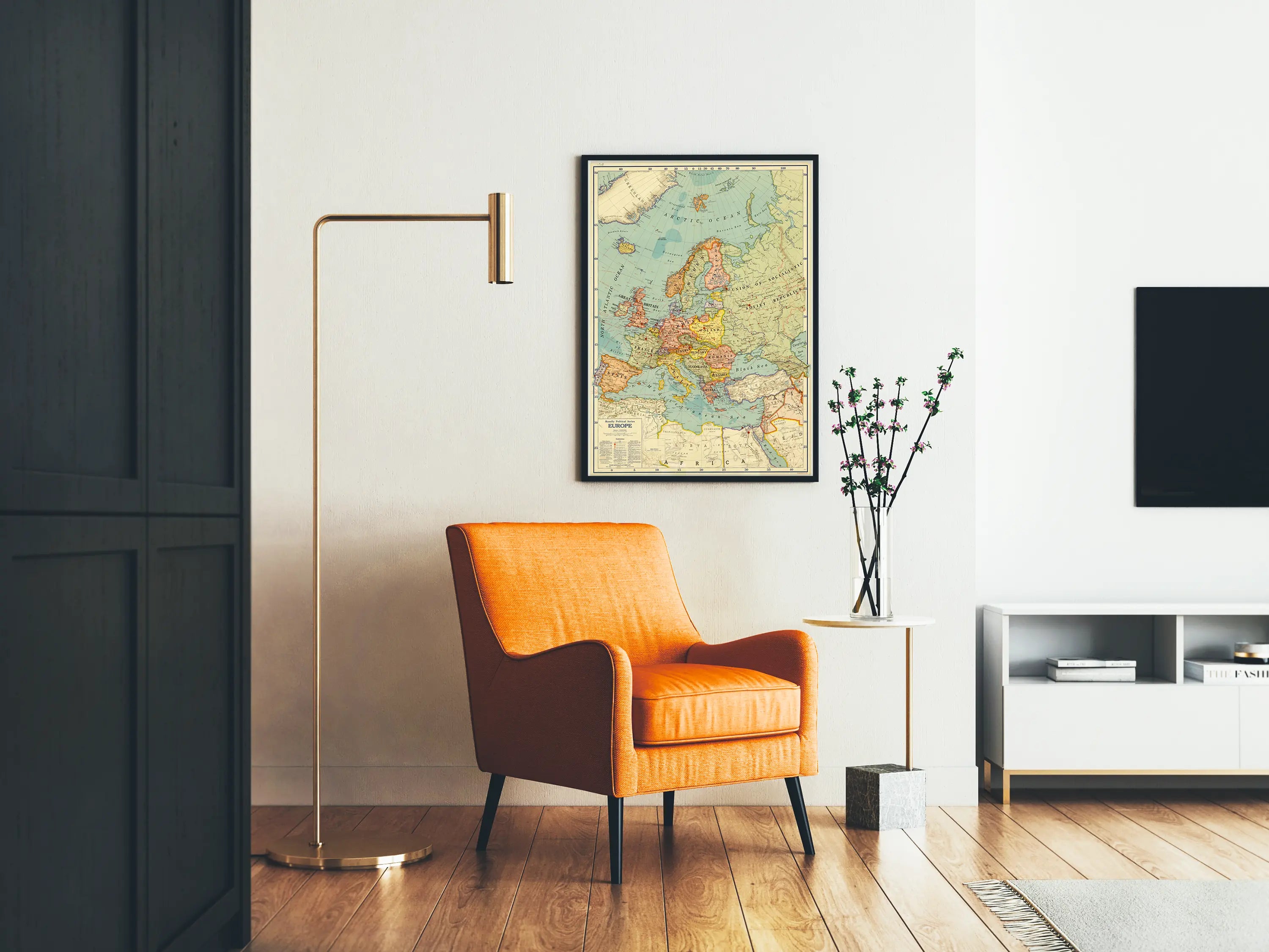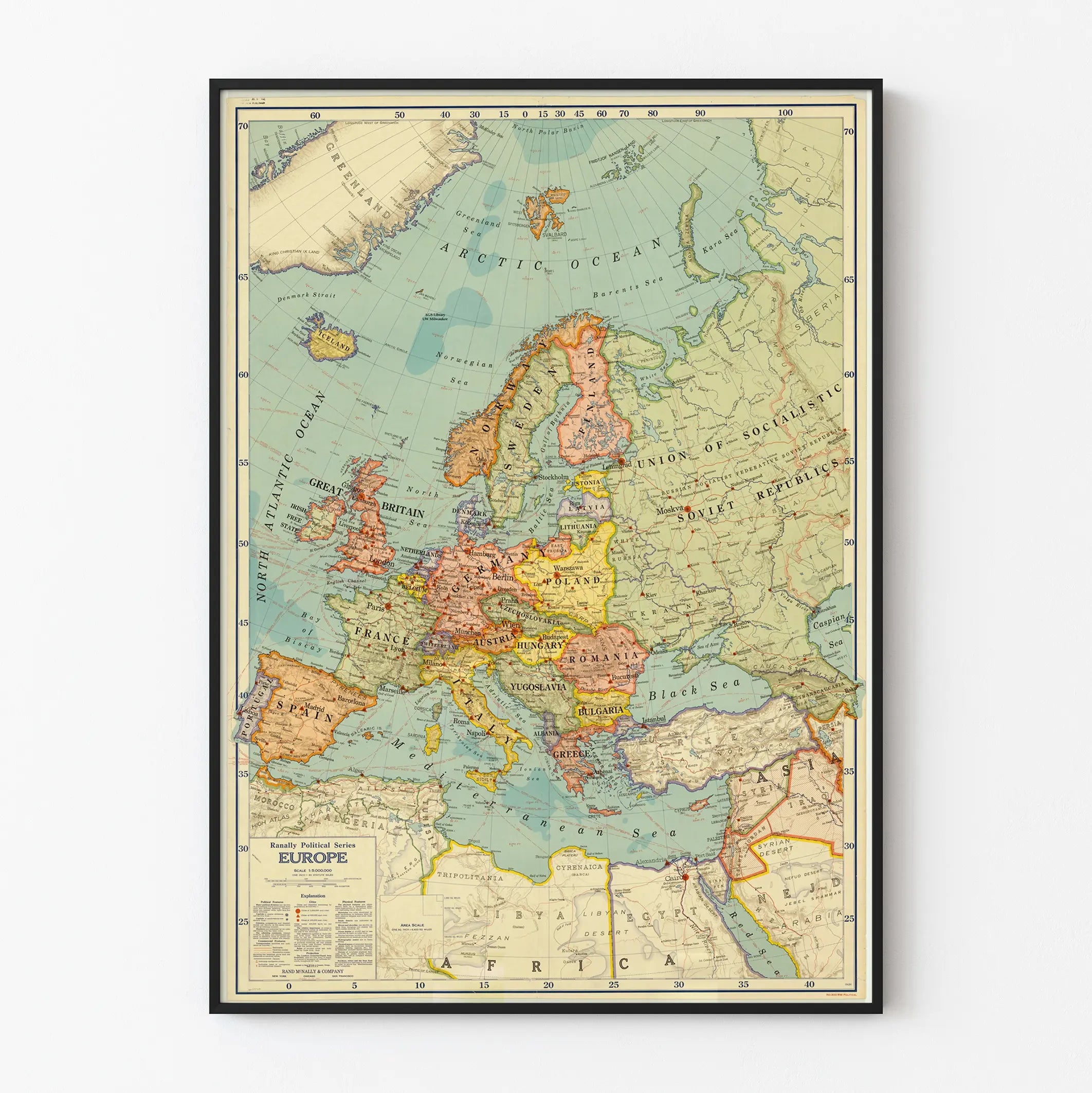 This vintage political map of Europe offers a detailed and colorful representation of the continent's borders and countries. Perfectly suited as a wall decoration, it highlights the countries with distinct colored outlines, as well as the main capital cities. This antique poster also features the seas and oceans surrounding Europe, along with certain regions of North Africa and the Middle East. The retro appearance and geographical accuracy make this poster an ideal wall ornament for enthusiasts of history, geography, or classic decor. The map emphasizes countries that no longer exist today, such as Czechoslovakia and Yugoslavia, adding a touch of authenticity and character to your interior space. This wall art easily complements a simple or vintage decor, bringing timeless charm to an office, living room, or library. Each country is clearly identifiable thanks to the distinct colors and legible names, offering an educational benefit as well. This decorative poster is an excellent choice for those looking to enhance their wall decor with a piece that is both aesthetic and informative.