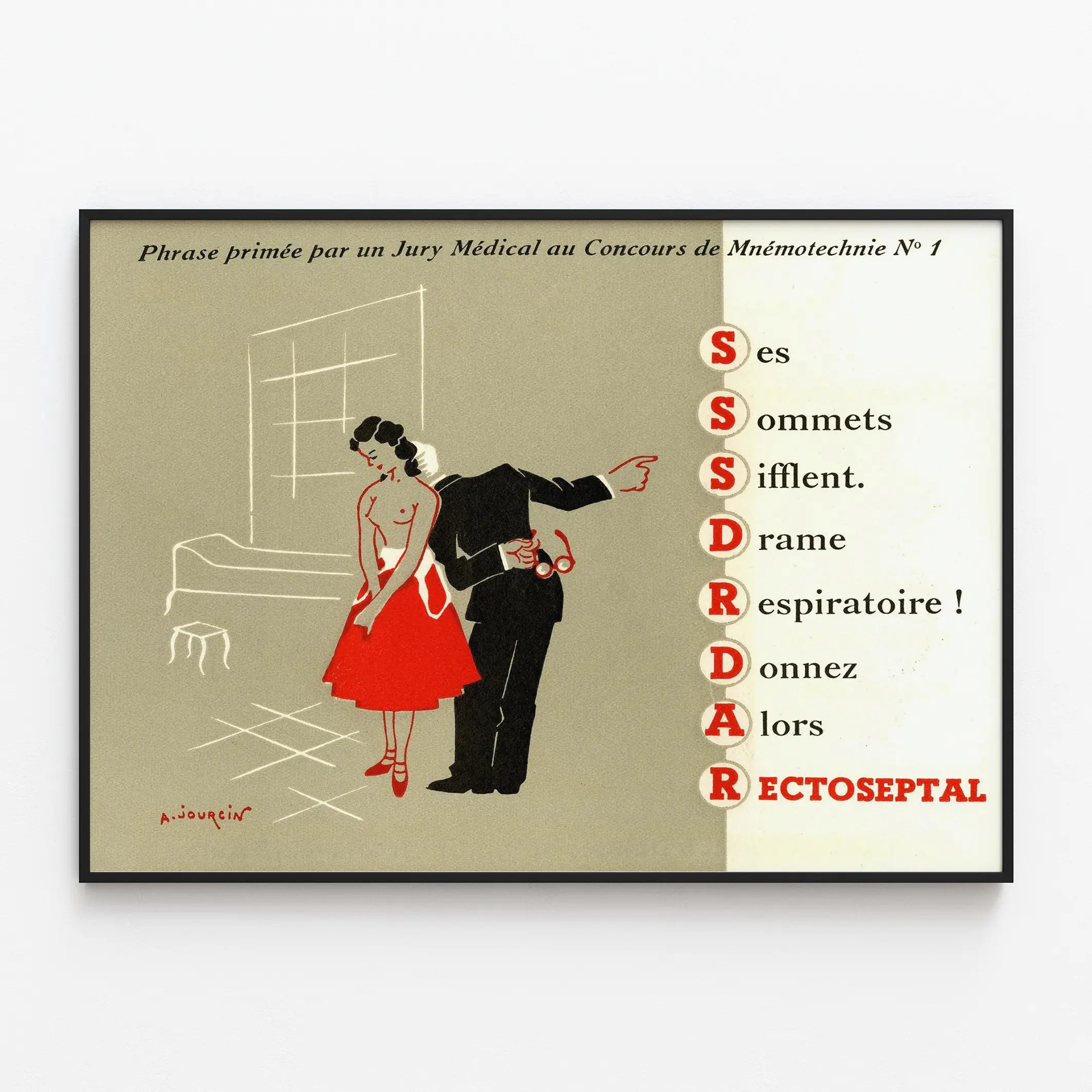 This vintage wall decoration poster, titled "Awarded Phrase by a Medical Jury at the Mnemonics Competition N°1," is a unique piece that will appeal to enthusiasts of retro art and medical design. It features a stylized two-tone drawing in red, black, and beige, depicting a female silhouette in a red skirt and a man in a suit preparing to extend his hand to her. Positioned on the right, a mnemonic text plays on the initials in red to evoke the term "RECTOSEPTAL" within a medical context.