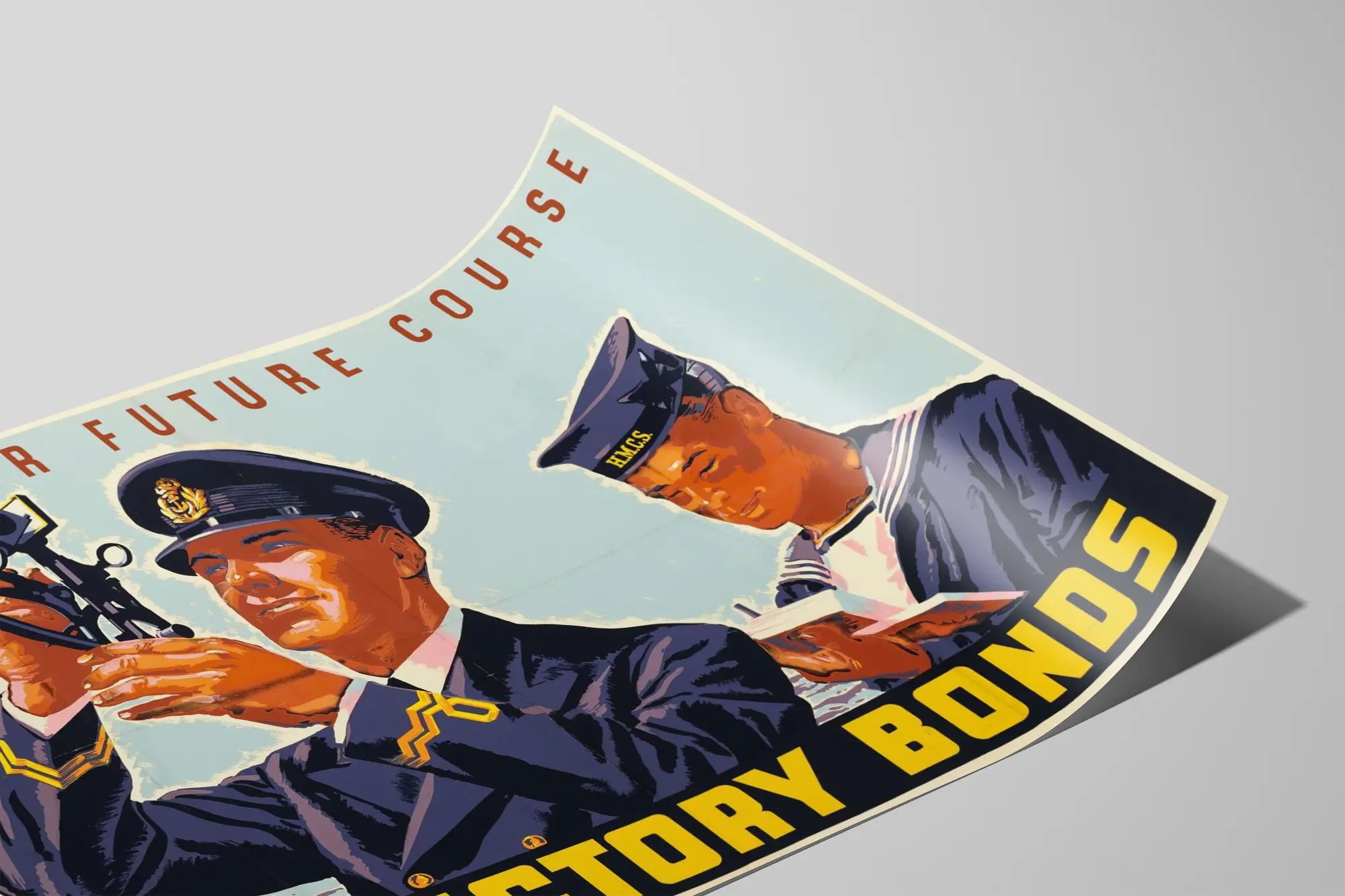 This vintage wall decoration poster depicts two members of the naval military in their uniforms: an officer holding a sextant to chart navigation and a sailor flipping through a notebook. The light background highlights the characters in the foreground, dressed in navy blue uniforms with gold and white details, the second identifiable by the band "H.M.C.S." on his cap. In the background, a warship moves across a choppy sea, enhancing the strategic maritime atmosphere. The text at the top, "PLOT YOUR FUTURE COURSE," encourages planning for the future, while the bottom of the poster features, in yellow capital letters on a black background, the call to action "BUY VICTORY BONDS." This poster, with a retro aesthetic and contrasting colors—shades of orange, blue, and yellow—conveys a patriotic message and support for the war effort, typical of military propaganda posters. Used as wall decor, this poster will add a touch of history and dynamism to any interior, whether in an office, living room, or space dedicated to maritime or military history. It perfectly complements vintage industrial or nautical styles and is an essential decorative piece for enthusiasts of vintage posters and military iconography.