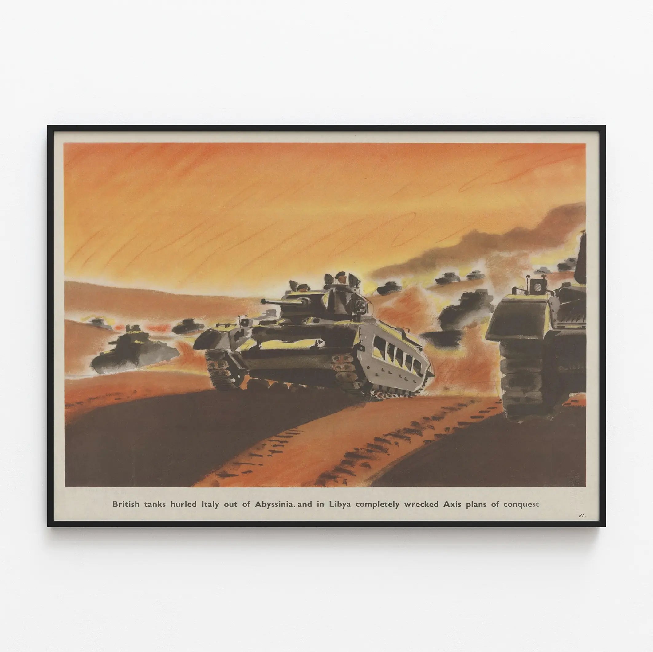 This vintage poster depicts a scene of British tanks advancing across a desert landscape under an orange sky, illustrating a significant military moment. This wall decoration poster captures the power and dynamism of British battle tanks during their intervention in Africa, a striking image to enhance your interior. The composition highlights several armored vehicles in motion, with visible track marks in the foreground, emphasizing the depth and realism of the scene. This historical poster is ideal as a wall decoration for enthusiasts of military history, collectors, or to adorn a space with a vintage touch and a warlike theme. The artistic style employs warm shades and an expressive painting technique that accentuates the dramatic and energetic atmosphere of the scene. This wall poster fits perfectly in a living room, an office, or any room seeking a strong and evocative ambiance. Offering a fine example of retro-style wall decor, it will also appeal to enthusiasts of posters and prints dedicated to historical conflicts.