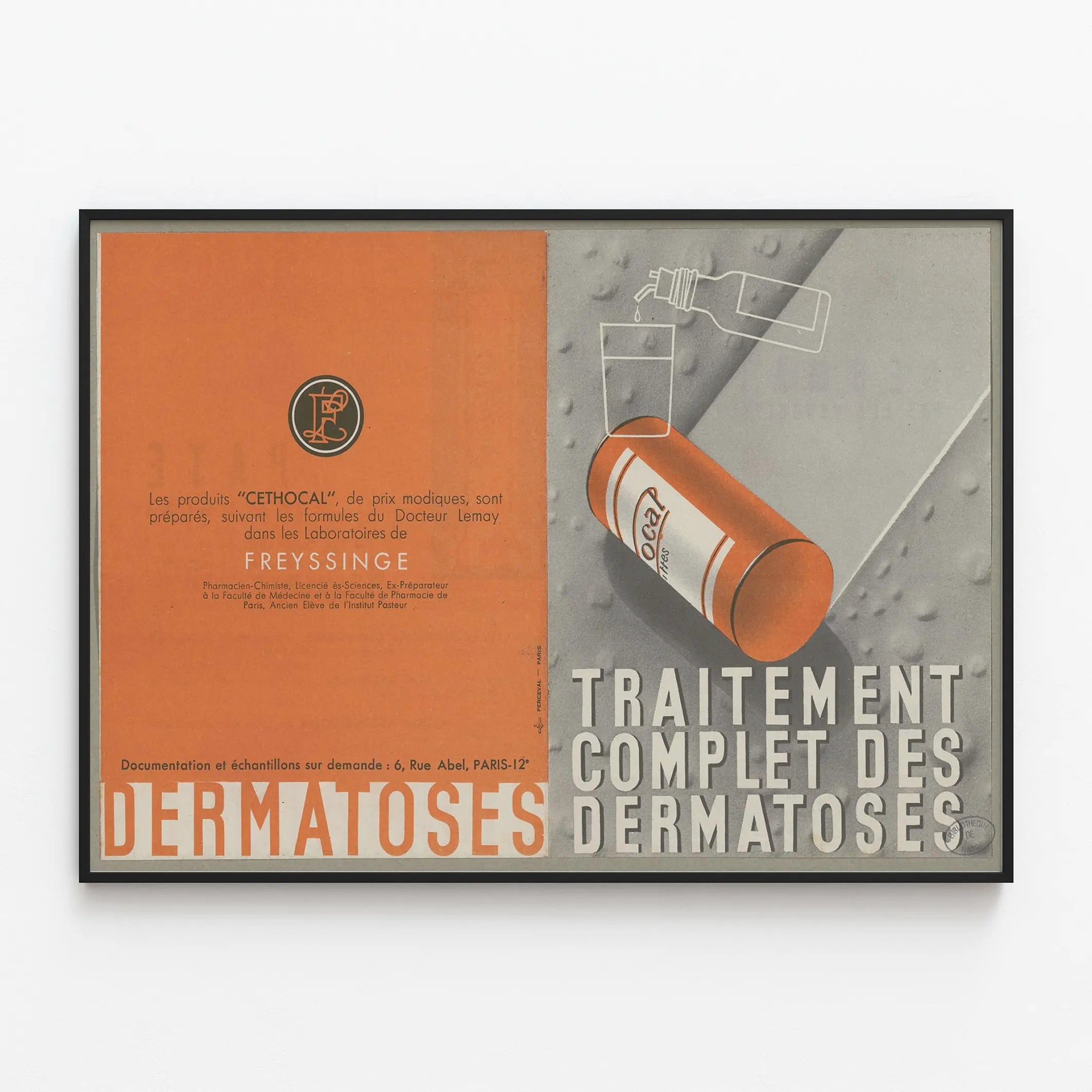 Discover this vintage poster dedicated to the comprehensive treatment of skin diseases, highlighting the product "Cethocal." This antique wall decoration features a graphic rendering in orange and gray colors, with a stylized depiction of a bottle pouring its contents into a glass, illustrating a pharmaceutical product. The poster evokes preparations made according to the formulas of Dr. Lemay, in the laboratories of Freyssinge, emphasizing its scientific origin and medical use.