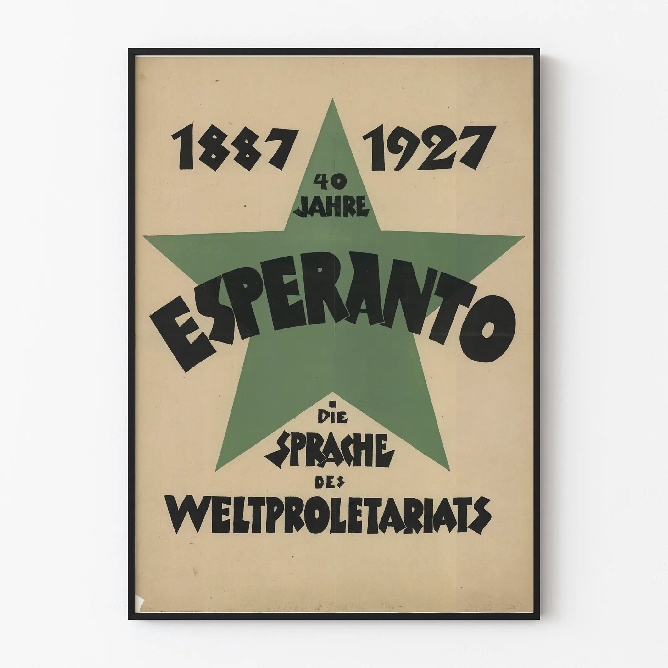 This vintage poster celebrates the 40th anniversary of Esperanto, a global language created in 1887. On a beige background, a large green star dominates most of the composition. At its center, the word "ESPERANTO" is written in bold black letters, designed in a distinctive angular and graphic style, giving the poster a look that is both modern and committed. At the top of the star, the text "40 JAHRE" emphasizes the four-decade milestone. At the upper part of the poster, the dates "1887" and "1927" frame the star, precisely indicating the period being commemorated. Below the main word, the German inscription "DIE SPRACHE DES WELTPROLETARIATS" (the language of the world proletariat) reinforces the social and political message associated with Esperanto, often seen as a tool for international unity. This minimalist poster uses a limited color palette of green, black, and beige, enhancing its retro and authentic appearance. Perfect as wall decor for enthusiasts of languages, linguistic history, or historical posters, this print is a striking decorative element that will catch the eye in a library, office, or study room. Its simple yet impactful graphic style allows this vintage poster to remain timeless while highlighting the cultural and political significance of Esperanto in the early 20th century. It appeals to those who appreciate wall decorations with a strong message, blending history, language, and social commitment.