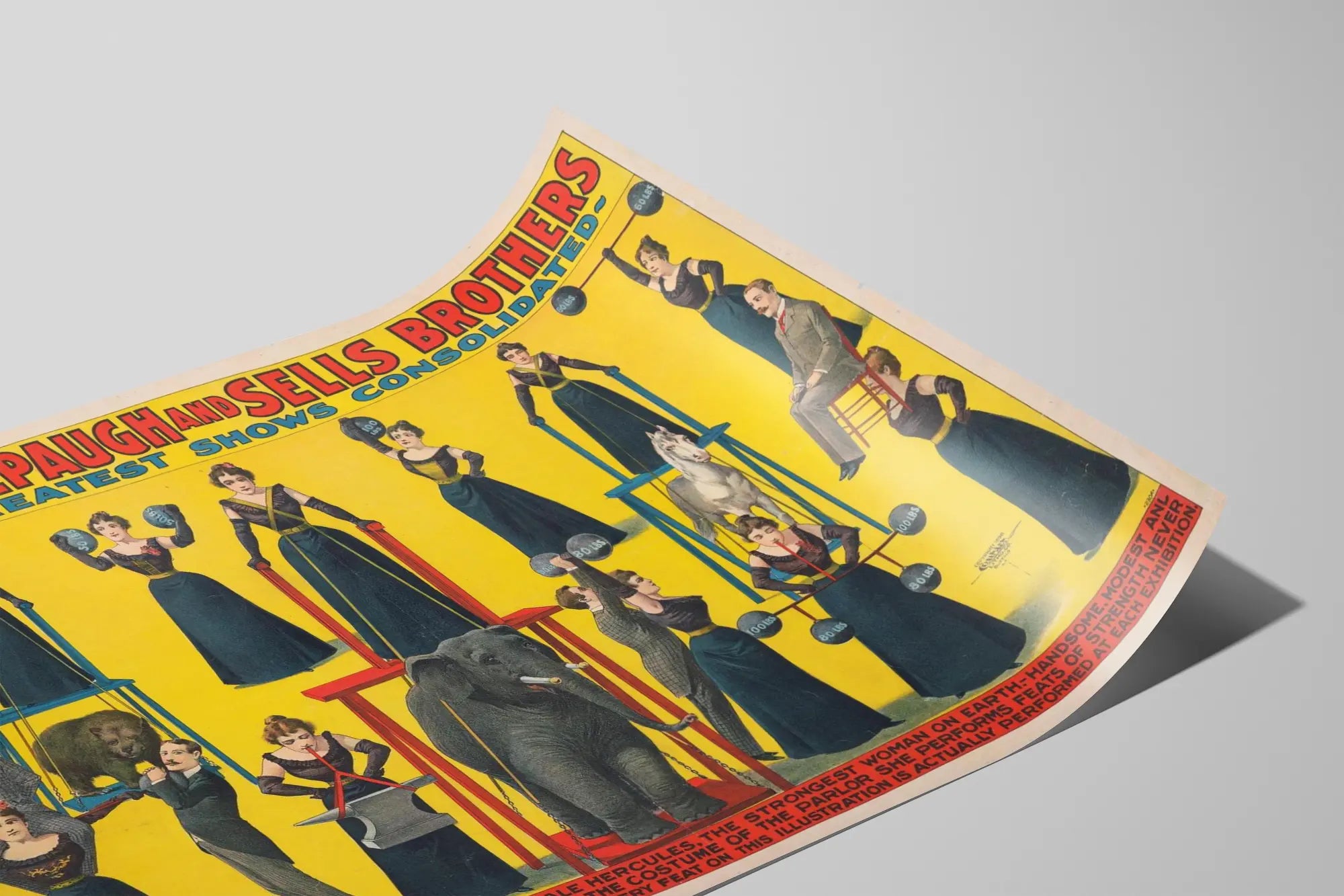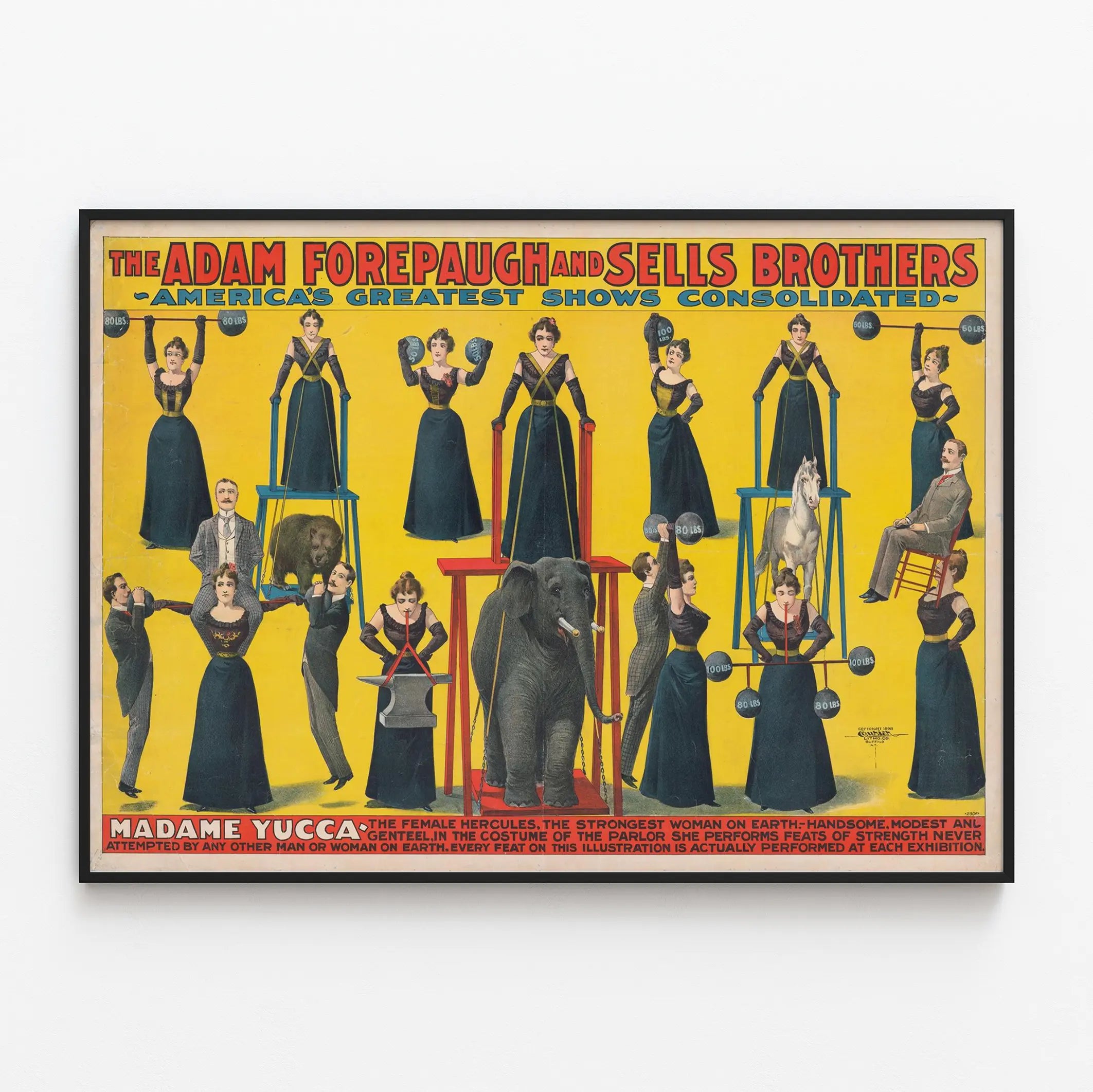 This remarkable vintage poster features Madame Yucca, nicknamed "The Female Hercules," recognized as the strongest woman in the world. This colorful, detail-rich illustration captures the spectacular spirit of American shows from the past, depicting Madame Yucca in several impressive feats of strength. Perfect for unique wall decor, this retro poster combines vibrant graphics on a yellow background with a series of dynamic poses where Madame Yucca lifts weights, animals such as a bear and an elephant, and performs various physical stunts. This poster evokes the world of fairs and popular spectacles of the 19th century, where demonstrations of strength were both entertainment and a symbol of exceptional power. The numerous scenes illustrated on this poster, with weights indicated in pounds, highlight Madame Yucca's extraordinary strength, while her elegant costumes give her a modest and distinguished appearance. Ideal for enthusiasts of unusual vintage wall decoration, this printed artwork adds a touch of history and boldness to any interior. Whether in a living room, office, or a space dedicated to popular art collection, this poster serves as both a striking graphic element and a visual story. The quality of the illustration, with its contrasting colors and meticulous details, enhances this decorative object, making it as attractive as it is educational. The reference to Adam Forepaugh and Sells Brothers, renowned show organizers, anchors this poster in a historical entertainment context. In summary, this vintage Madame Yucca decorative poster is a captivating piece that celebrates female strength through a graphic style typical of the late 19th century, perfect for anyone wishing to incorporate a decorative element rich in history and energy into their space.
