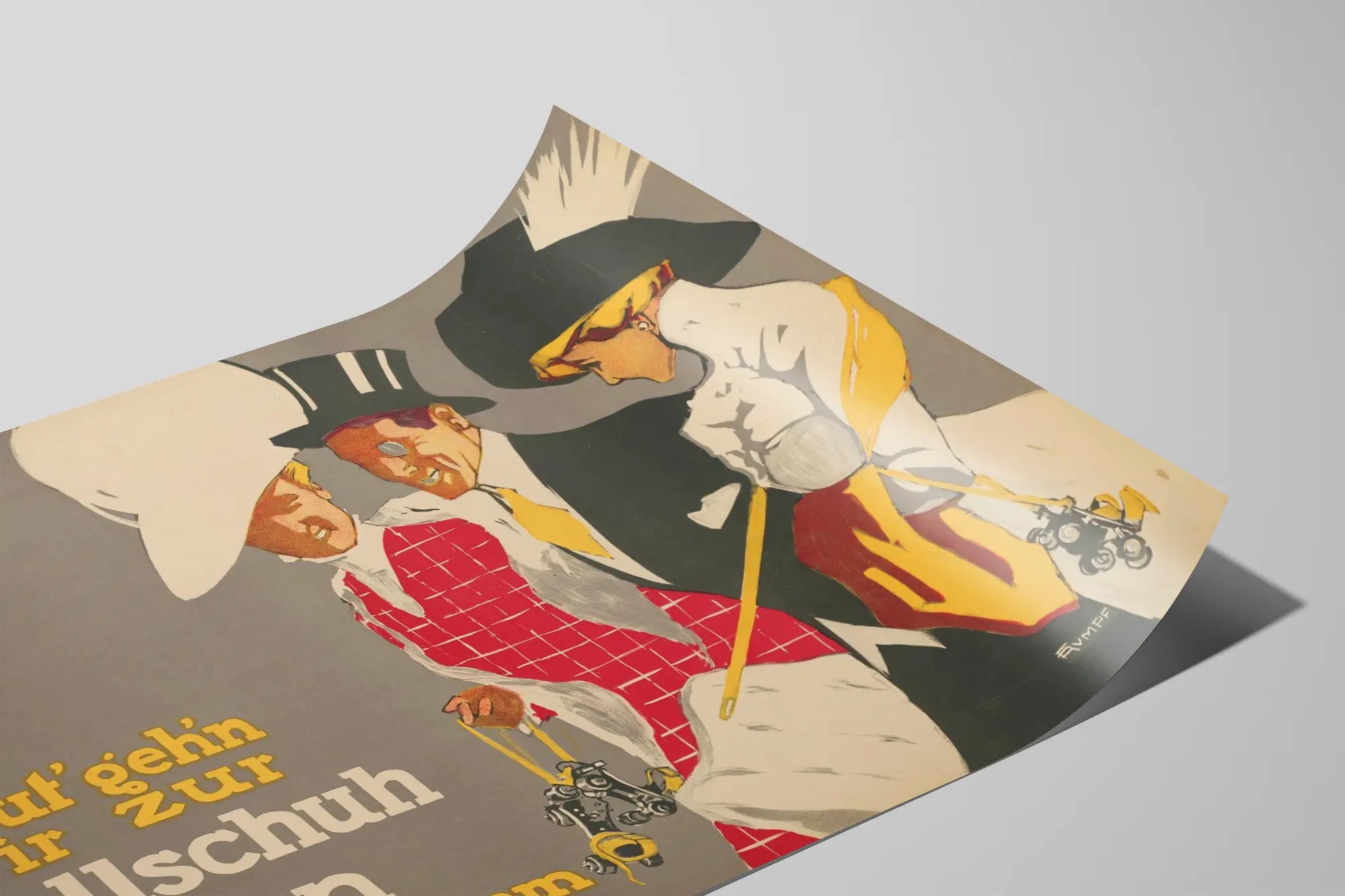 This captivating vintage poster titled « Heute gehen wir zur Rollschuh Bahn Kurfürstendamm » is a unique wall decoration piece that adds a retro and elegant touch to any interior. The visual features three characters dressed with refinement, evoking a sophisticated and festive atmosphere, vintage and urban. The presence of roller skates in the characters' hands emphasizes the dynamic and playful theme of the decoration, perfect for enthusiasts of vintage leisure activities and graphic art.