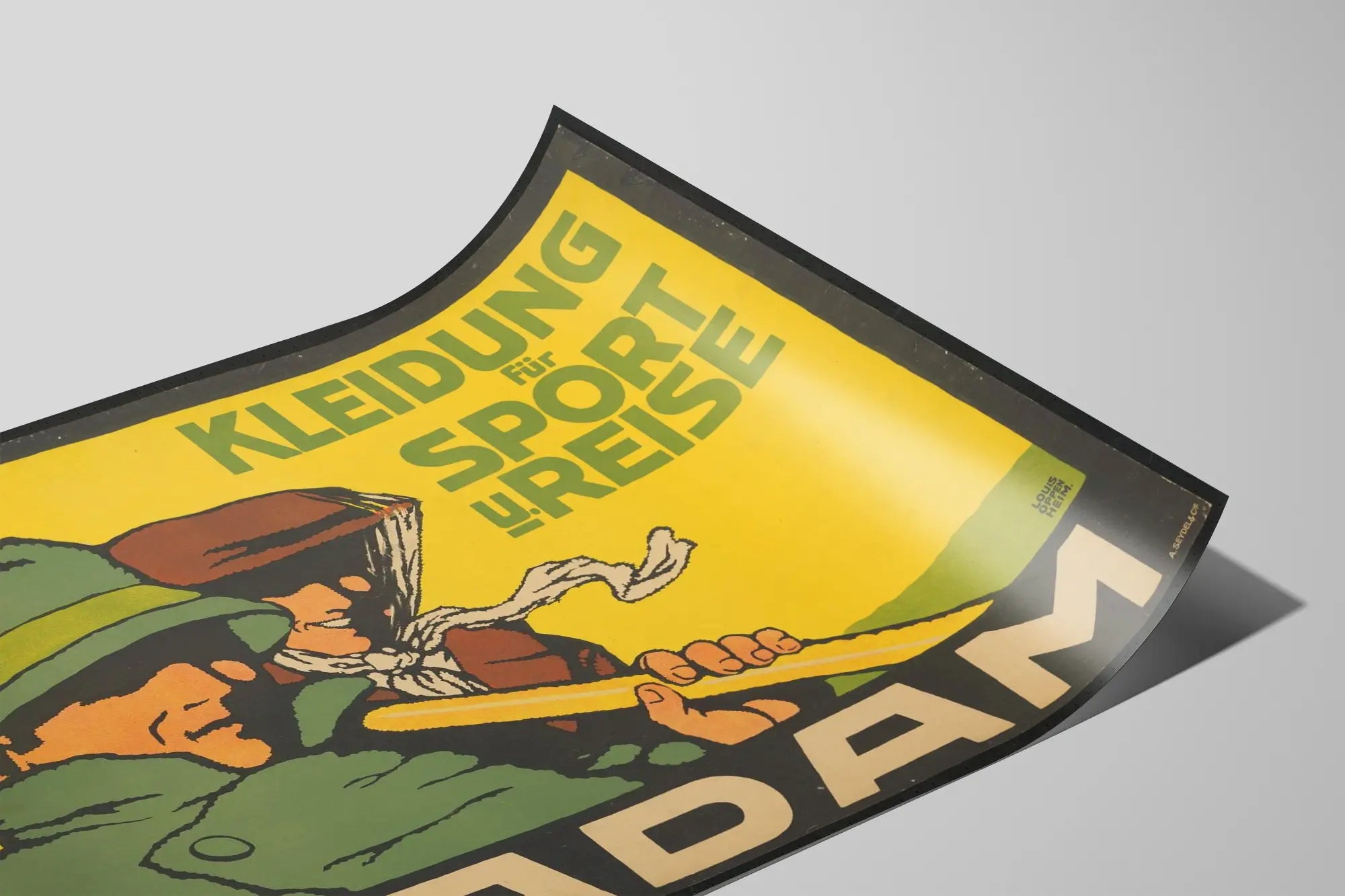 This vintage poster is an ideal wall decoration for enthusiasts of sports and outdoor adventures. On a bright yellow background, it features two characters dressed for sport and travel, wearing thick coats and hats suitable for excursions. One of the characters holds an ice axe, a symbol of mountain activities, while the other wears a scarf that appears to flutter in the wind, evoking movement and freedom. The German text "KLEIDUNG für SPORT u. REISE" emphasizes the main theme of this poster: clothing equipment for sport and travel. At the bottom, the name "S. ADAM" is highlighted in a broad, legible typography, reinforcing the advertising aspect of the poster. The use of contrasting colors – yellow, green, brown, and black – draws the eye and adds a slightly retro atmosphere to this graphic composition. This poster stands out as a strong element of wall decoration, bringing a vintage touch to any interior. It is perfectly suited to adorn the walls of a living room, a gym, or an office, evoking the spirit of adventure and passion for outdoor activities. Thanks to its format and graphic style, this print finds its place both among collectors and enthusiasts of graphic design and the promotion of vintage advertising heritage. It is an original and inspiring gift for all who appreciate the history of sports and travel posters, blending utility and aesthetics in a single decorative object. You can thus enrich your wall decor with this unique picture that tells a simple, evocative story, full of energy and dynamism in its illustration.