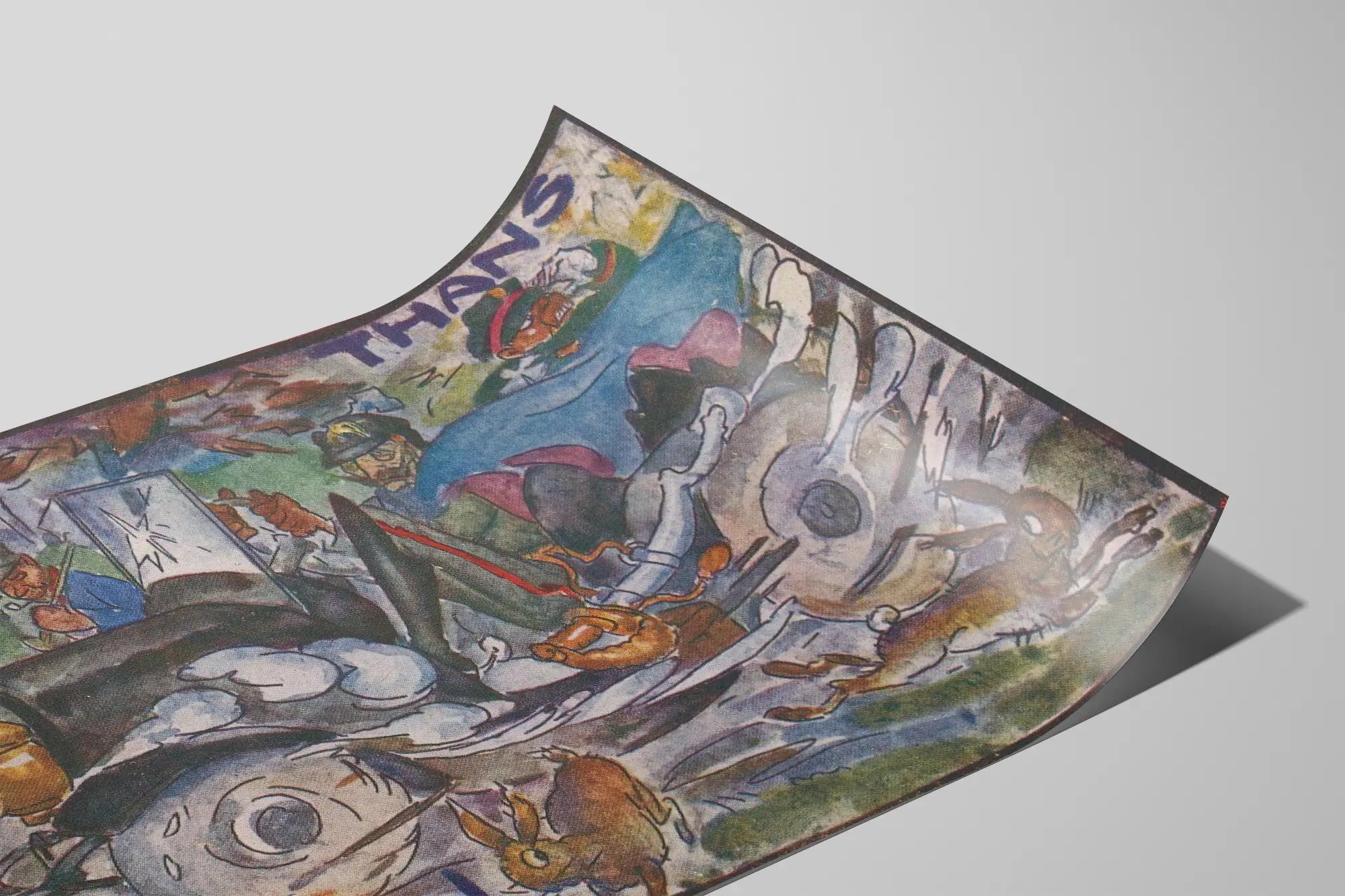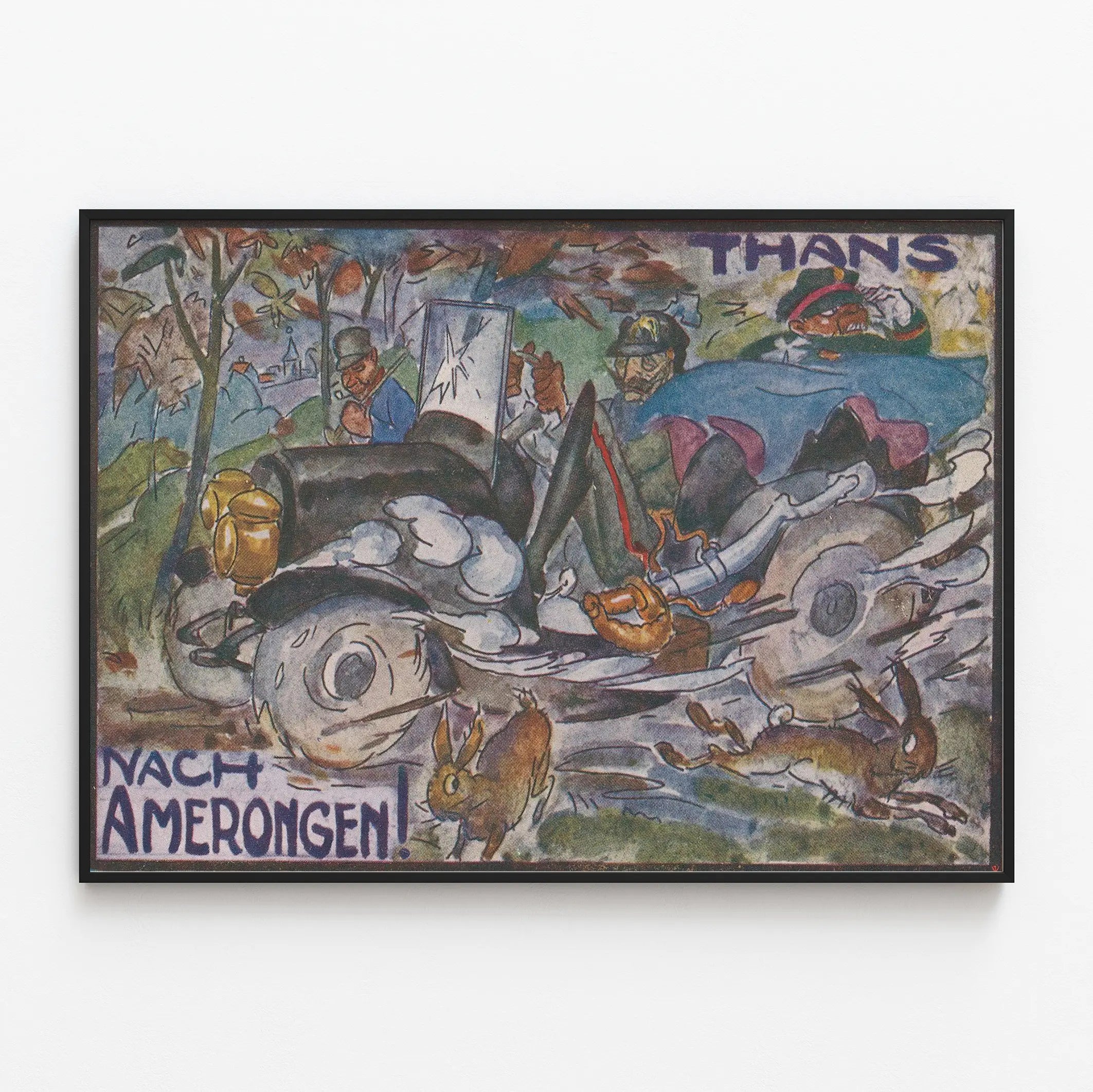 This vintage poster titled "Thans Nach Amerongen" depicts a lively and dynamic scene featuring an old military vehicle with several soldiers aboard. The image is rich in bright colors and stylized details, with an artistic style blending realism and a touch of caricature. The vehicle appears to be moving at high speed, with wheels drawn in an almost abstract manner, and several hares jumping along the path add a note of life and nature to the scene. The soldiers, recognizable by their uniforms and helmets, evoke an atmosphere of the period, reinforcing the historical or military character of this artwork. The background presents sketched natural and architectural elements, including trees and a silhouette of buildings, adding depth to the composition. This poster is an excellent choice for original wall decoration, ideal for enthusiasts of vintage art, military history, or illustrations with an expressive and colorful style. Whether in a living room, an office, or a space dedicated to poster collection, this wall picture brings a unique and energetic atmosphere. Its pictorial rendering and narrative details make this poster both an aesthetic and evocative decorative element, capable of sparking curiosity and conversation. Perfect for enriching an interior with a retro artistic touch, this wall decoration fits eclectic and vintage styles, adding contrast and dynamism to your walls.